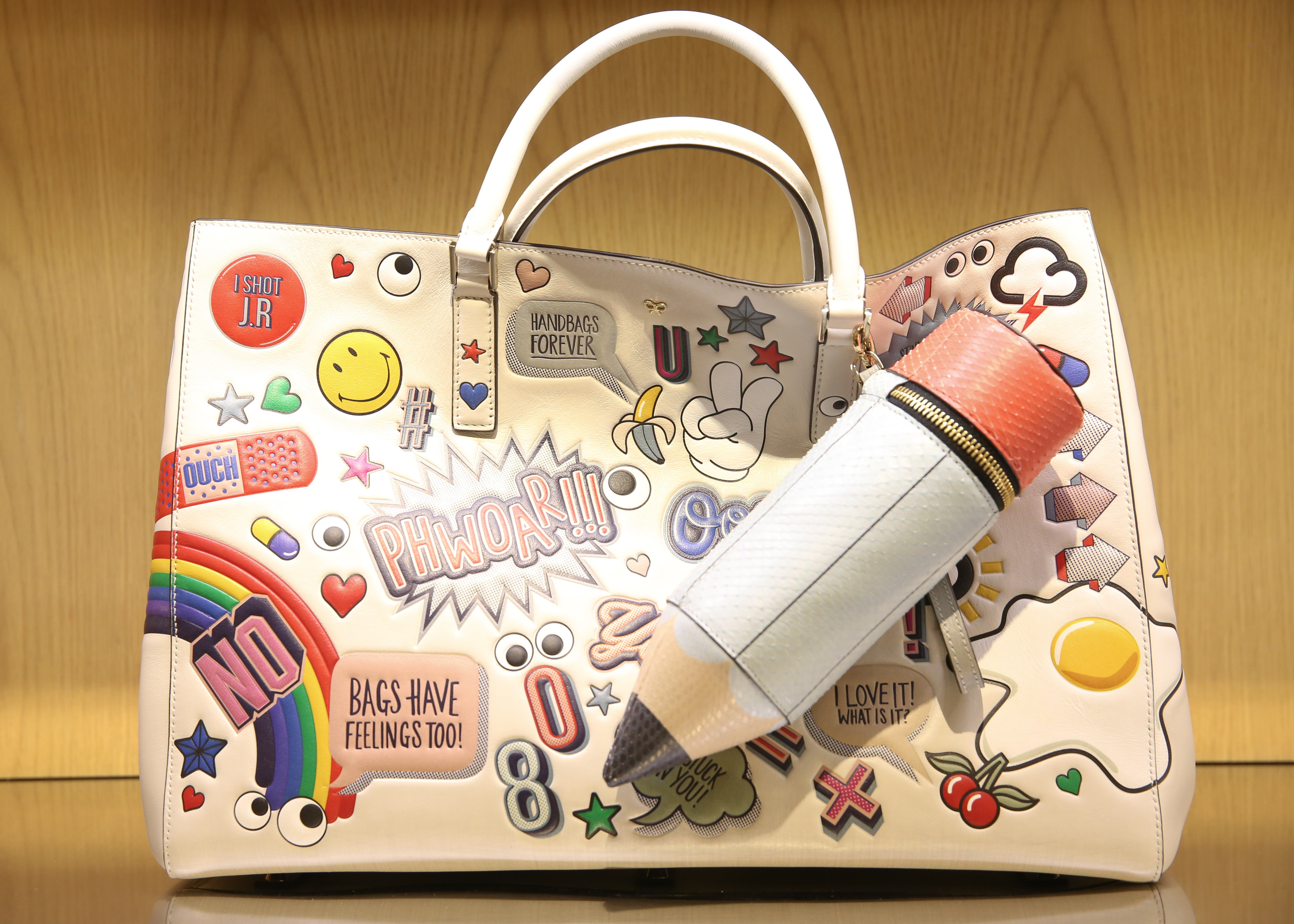 In today’s emoji-obsessed world, it’s no surprise that Anya Hindmarch‘s collection of cheeky stickers, made from luxe leather, have become a staple for the fashion set. Since their launch, these sticky accoutrements have accessorized the accessories of nearly everyone, from Cara Delevingne‘s phone case to Chiara Ferragni‘s Hermès Kelly tote. So naturally, when Barneys New York organized a celebration in honor of the opening of The Sticker Shop last night, chicsters like Joanna Coles, Simon Doonan, Amirah Kassem, Kate Foley, Mamie Gummer, Vanessa Friedman, Sofia Sanchez de Betak, and Aurelie Bidermann showed up. Dying to know more about the stickers? We were, too, so we grilled Hindmarch on the story behind them, and whether the stickers were a one-off or if they’re here to stay…