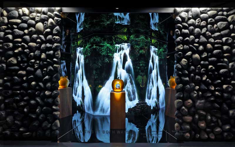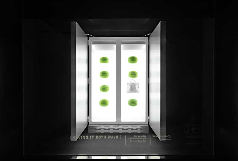 The windows feature handcrafted and painted watermelons, chrome and stainless steel backdrops built by the Barneys New York visual team, and luxurious product like a Dries Van Noten faux fur jacquard cape in a downtown window. The Madison Avenue windows display a Gareth Pugh raincoat, Maison Martin Margiela sneakers, an XO Sevan Bıçakçı ring, and a Rimowa suitcase. Performance artist Helga Davis recorded a soundtrack for the locations to enhance the experience.