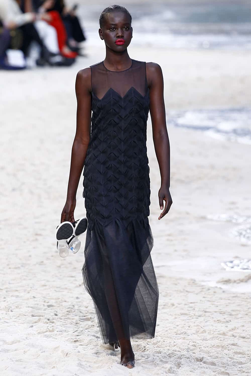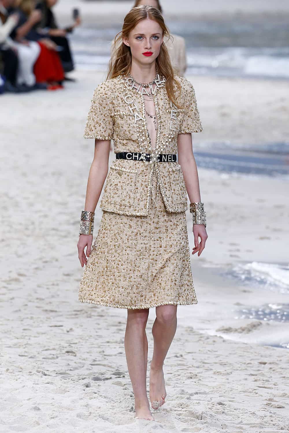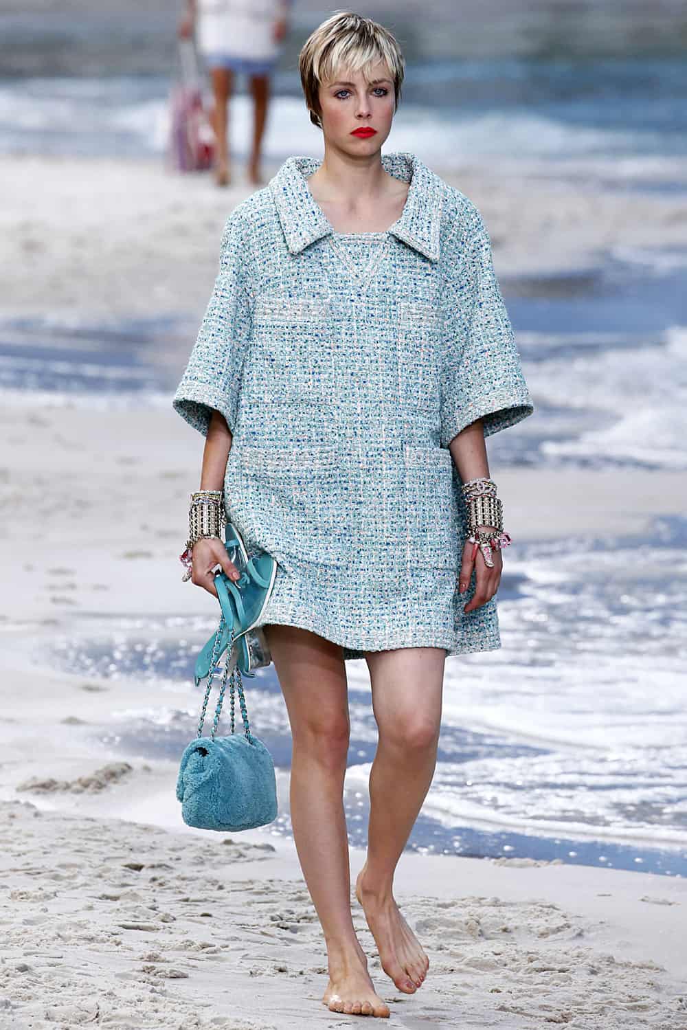 The collection itself was sporty and lighthearted — full of bright pastels and playful, beach-themed prints, while still presenting plenty of the iconic tweeds the house is known for. Models carried their lucite-heeled sandals with them as they walked the man-made shoreline barefoot, many of them with multiple bags slung across their shoulders or gripped in their minimally-manicured hands. Check out all the best bags from the show here.