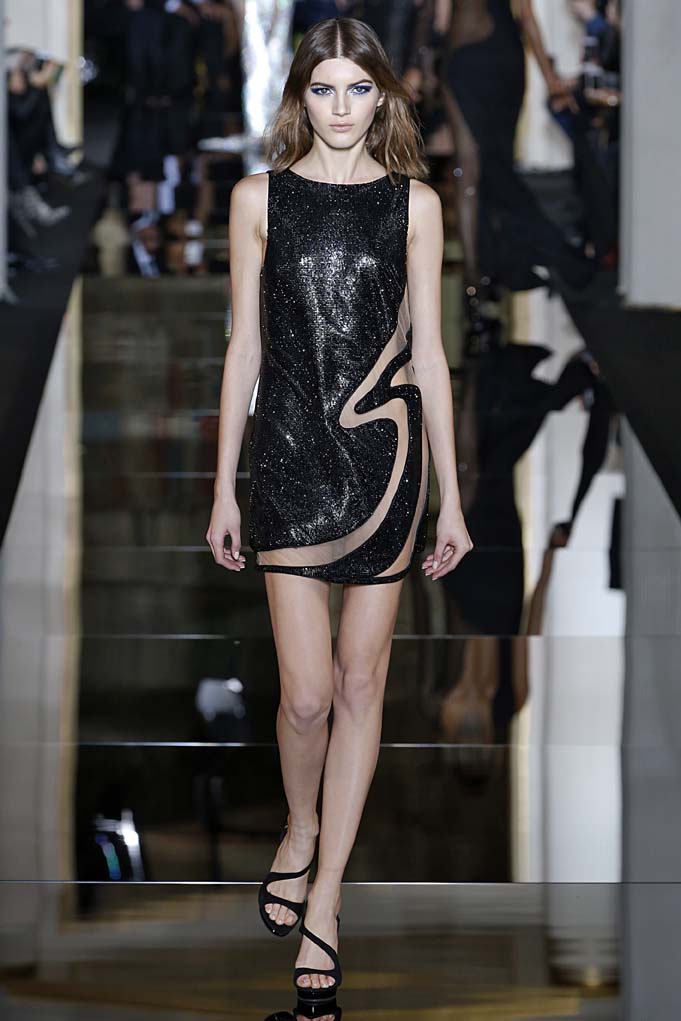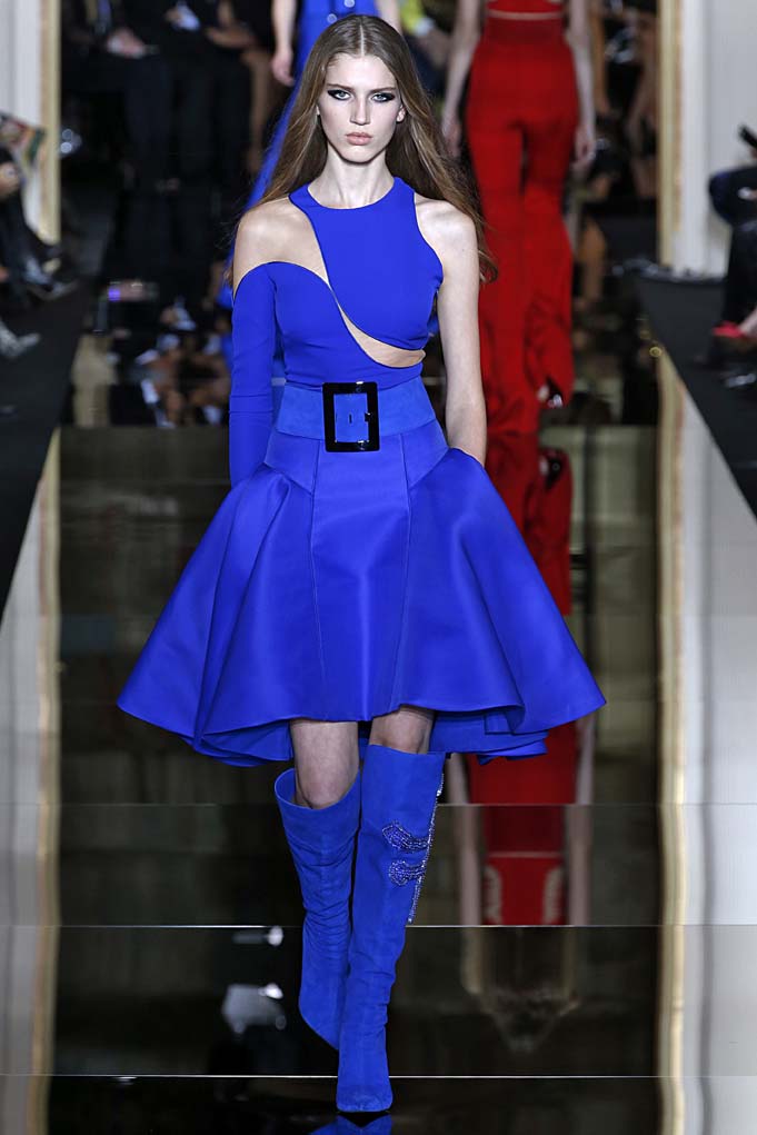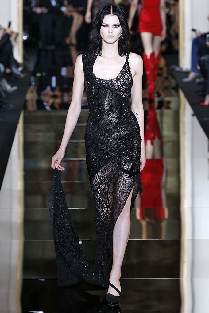 Donatella Versace‘s latest Couture collection was all undulating curves, all the time, from the opening flared pantsuit numbers to the intricately beaded, red carpet-ready parade of red, white, blue, and noir gowns that closed the show. After the impressive turnout of Versace gowns at the Golden Globes (including a hit white number on Kate Hudson, who was at yesterday’s show avec mom Goldie Hawn) expect to see some of these Couture numbers at the Grammys, Oscars, et al. Leave it to Versace to introduce all sorts of new ways to do a cutout, whether in the form of lightning-like swirls on bead-bedecked nude and silver frocks or, in the case of the white jumpsuit donned by Karlie Kloss in look 44, a criss-crossed detail on the right breast that was just barely concealed things. Saucy, non? A spate of seven noir numbers with beautifully-wrought detailing (fishnet-like paneling; fringed bits aplenty) were trotted out midway through the show, including some shorter-hemmed numbers that would easily work on the cocktail bash circuit. Rounded asymmetrical hems on royal blue and red numbers felt fresh and modern, and highlighted monochromatic, curvaceously strapped shoes, though a couple styles sported wide belts and voluminous skirting that just didn’t quite deliver on the same level as those slimmer, sexier pieces. But as for the snug, curve-flaunting, cleanly cut majority of the collection, expect to see these looks on many a tapis rouge soon…