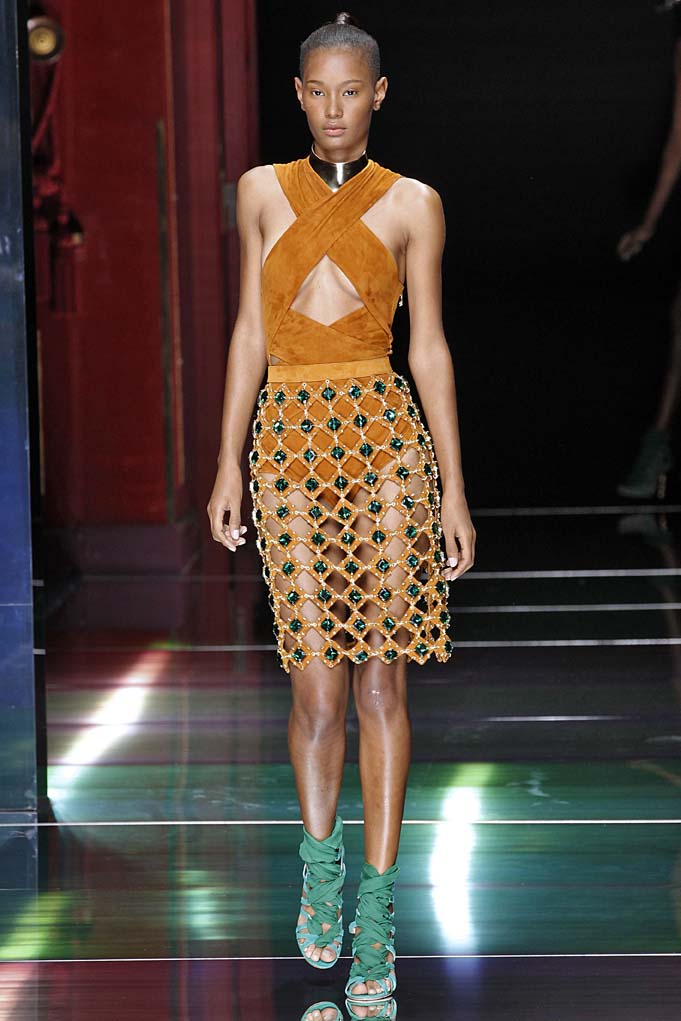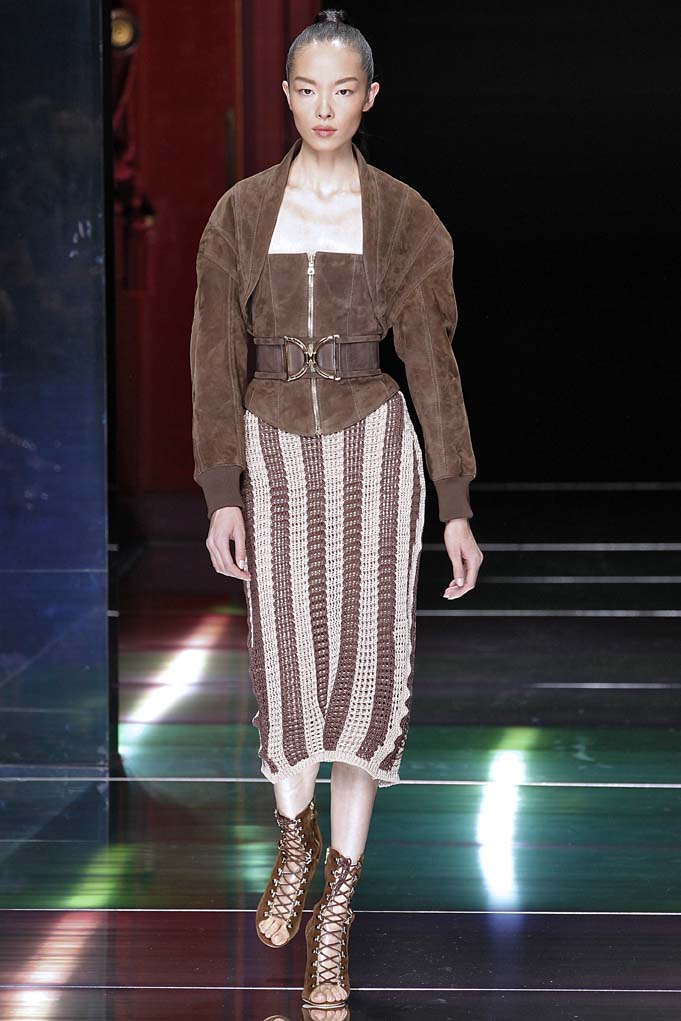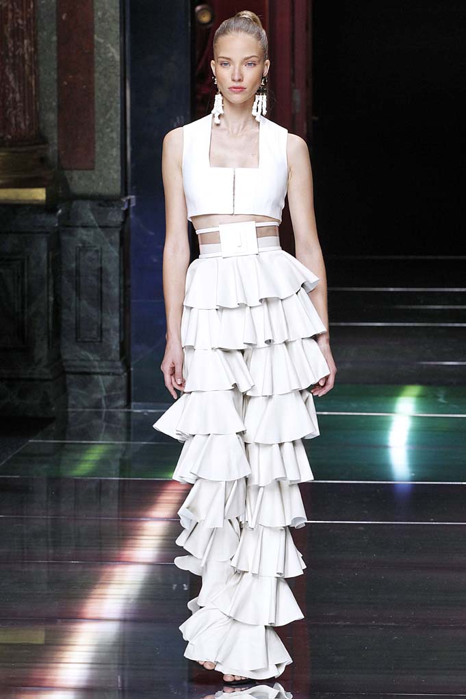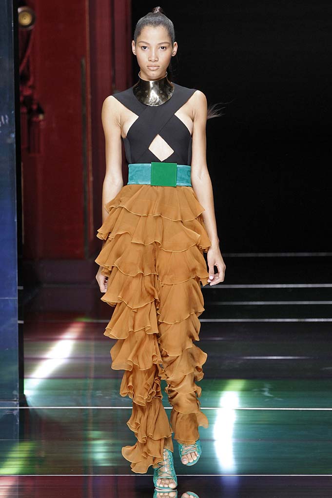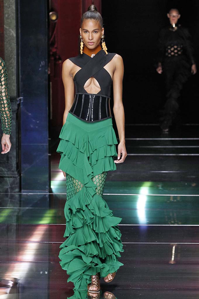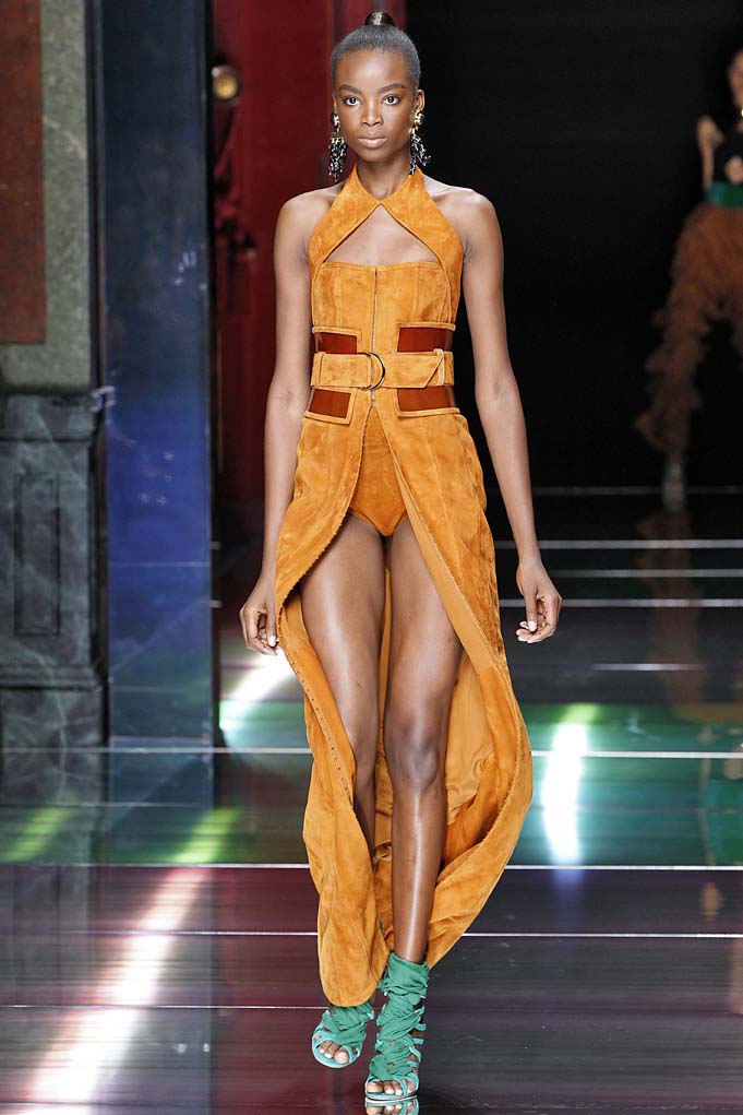 A long-sleeved suede mini…a chocolate brown jumpsuit…high-waisted leggings…merciless hot pants…haven’t we seen something like this before? Well, in the late seventies and early eighties, bien sûr, but also on a Kardashian Instagram account in recent moments. Olivier Rousteing intimately gets what many young (and young-at-heart) women want to look like—unapologetically powerful, shamelessly sexy. As always, he delivered, with cage motifs, halter tops, hot pants, ruffled skirts, and attitude galore. For a fashion follower of merely above-average income who seeking a spring statement piece, you’re in the wrong place—Rousteing is designing for a subset of the one percent that is not afraid to take on the world, and needs a look to communicate that confidence. Aspirational fashion at its hottest!