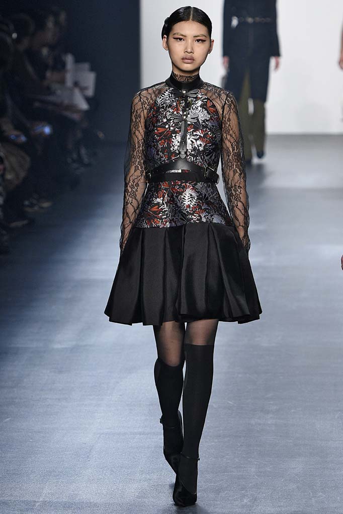 On Mohapatra’s runway, a different kind of binding was used. Leather harnesses by Zana Bayne were worn over Mohapatra’s very feminine wares. Chinoise embroideries embellished the length of a dress all the way to the hem in a bright Chinese red. Dragon flies adornements by Colette Malouf for Bibhu Mohapatra adorned accessories, the hair, even the back of a luscious cherry blossom-hued fur coat. Of course, there were plenty of gowns for the gala going set that adore Moahapatra’s designs, but the inspiration played to a different market. Mohapatra said he had been in Beijing to do a show there and China happens to be a burgeoning market for him. Some of the best pieces had ultra-high slits that showed of plenty of leg and revealed some particularly covetable hosiery thanks to a Mohapatra’s collaboration with Hanes. Mohapatra said he didn’t know if they would be made for sale yet, but there would probably be many women that would love to get their legs in them. As Bibhu put it, “It finished every single look in a very cool, edgy, modern way.”