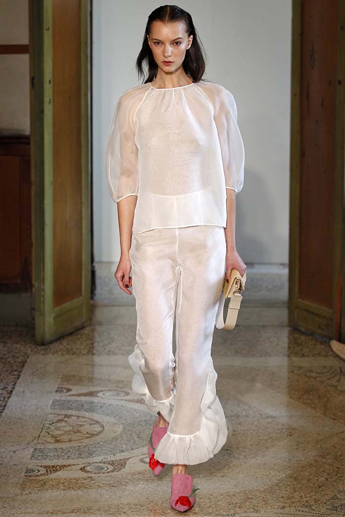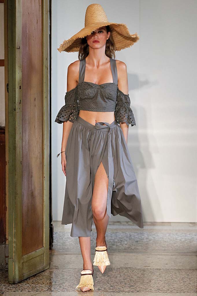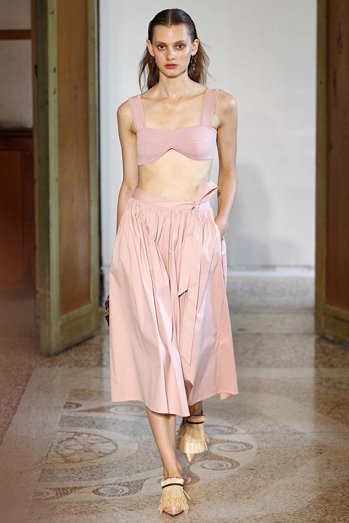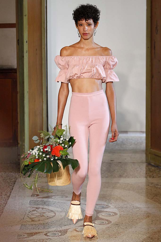“Letting go to explore the desert, under the sun, with a hat, in glaring heat: a romantic, rebellious idea,” read the show notes at Blumarine. Tina Modotti, the glamorous Italian photographer, model, and revolutionary activist was also an influence for this collection. Modotti died from congestive heart failure after leaving a dinner party hosted by famed poet Pablo Neruda in Mexico City. Neruda wrote the epitaph, which can now be found on her tombstone in the Mexican capital. It reads: “Pure your gentle name, pure your fragile life, bees, shadows, fire, snow, silence and foam, combined with steel and wire and pollen to make up your firm and delicate being.” While this collection was mostly delicate in nature, with florals on soft chiffons, pretty pink ginghams, and white eyelet dresses with ruffled necklines, one would have to be fairly brave and adventurous to wear a tiny bralette top or a ruched crop-top with fleshy pink spandex leggings in public. If there wasn’t much of the steel and wire to illustrate Modotti’s determination, there was plenty to represent the gentleness Neruda suggested.