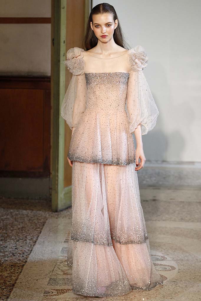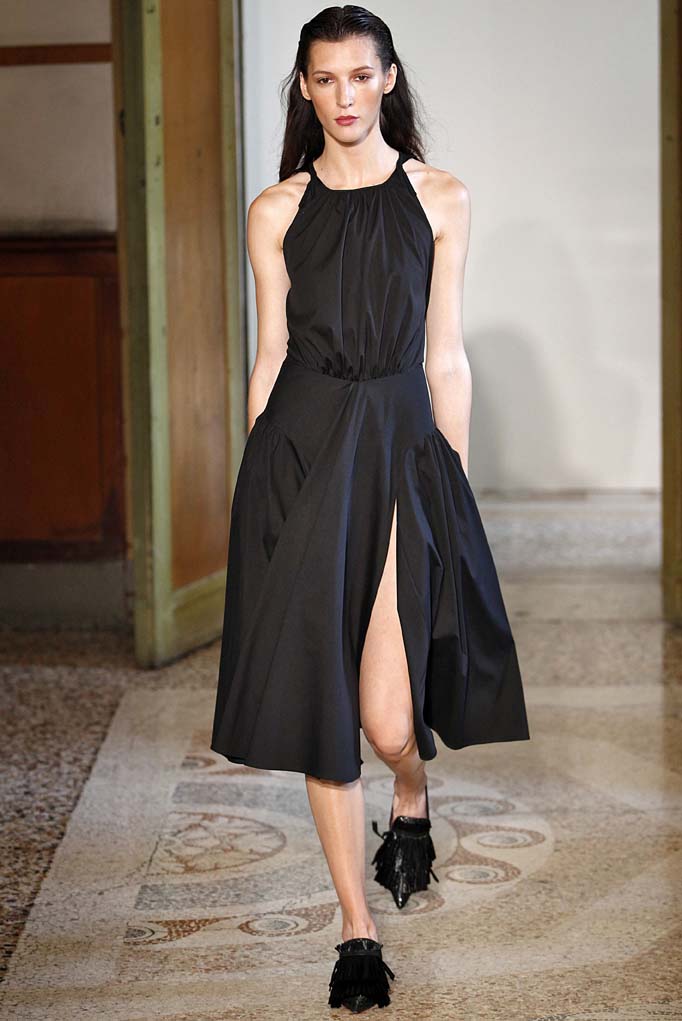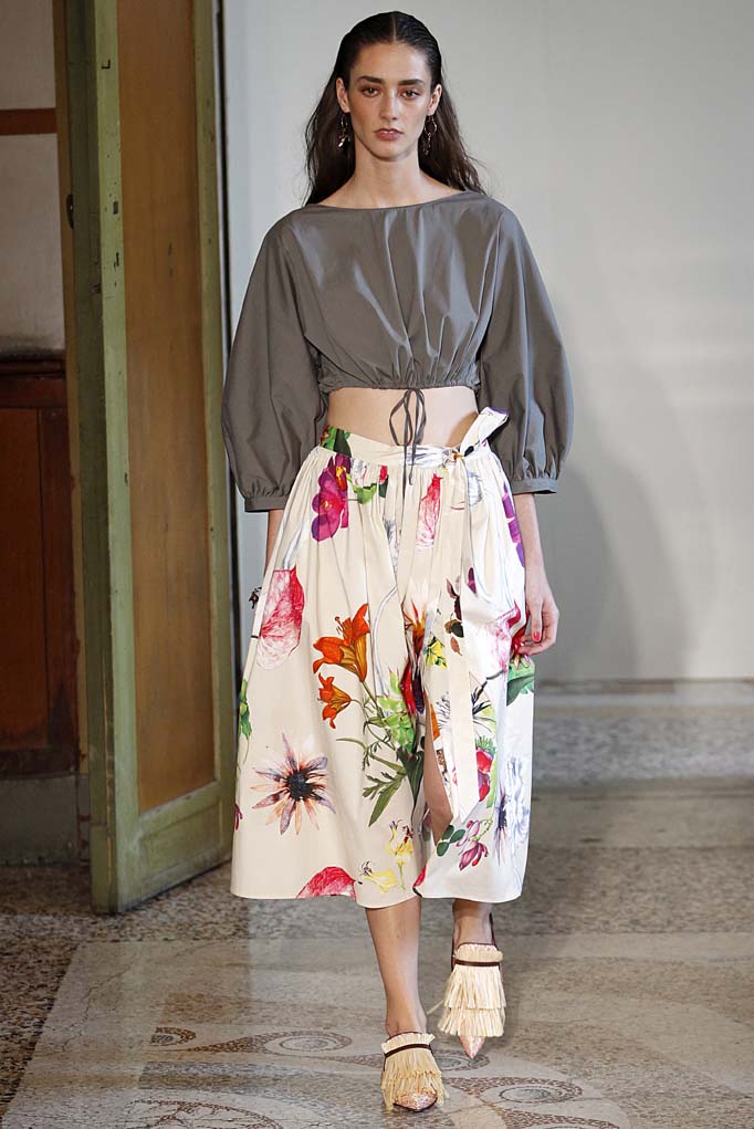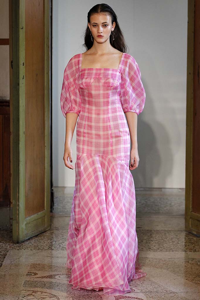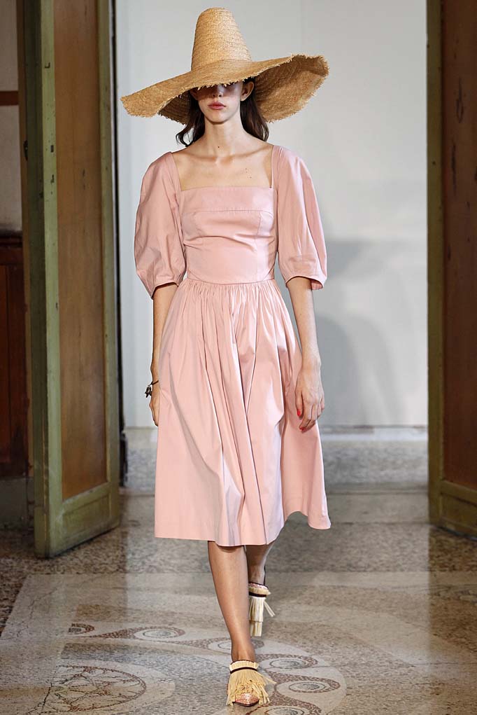 “Letting go to explore the desert, under the sun, with a hat, in glaring heat: a romantic, rebellious idea,” read the show notes at Blumarine. Tina Modotti, the glamorous Italian photographer, model, and revolutionary activist was also an influence for this collection. Modotti died from congestive heart failure after leaving a dinner party hosted by famed poet Pablo Neruda in Mexico City. Neruda wrote the epitaph, which can now be found on her tombstone in the Mexican capital. It reads: “Pure your gentle name, pure your fragile life, bees, shadows, fire, snow, silence and foam, combined with steel and wire and pollen to make up your firm and delicate being.” While this collection was mostly delicate in nature, with florals on soft chiffons, pretty pink ginghams, and white eyelet dresses with ruffled necklines, one would have to be fairly brave and adventurous to wear a tiny bralette top or a ruched crop-top with fleshy pink spandex leggings in public. If there wasn’t much of the steel and wire to illustrate Modotti’s determination, there was plenty to represent the gentleness Neruda suggested.