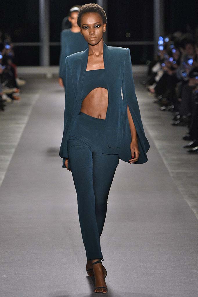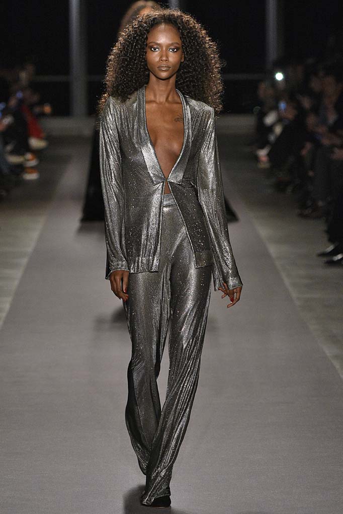 “Black or White” by Michael Jackson blared on the speakers as Joan Smalls sashayed down the runway in a micro-mini leather pleated skirt. Shortly thereafter “Freedom” by George Michael came on. Songs that are appropriate for the times, but they also happen to provide a killer rhythm for the fiercest model walks you’ve ever seen. These happened to be some of Maxwell’s favorite songs from childhood. “There were a lot of things that came back from my childhood in this collection—crystals, fur, and leather,” said Maxwell post-show. “I just wanted to be true to myself.” And he was. The beauty of Maxwell’s clothes lies in the details like a white baby doll dress with five layers of collar or the immaculate pleating or the perfect cuff on a simple white blouse. But if you’re looking for maximum flash, Riley Montana’s metallic pantsuit was made for turning heads. Glam to the Max!