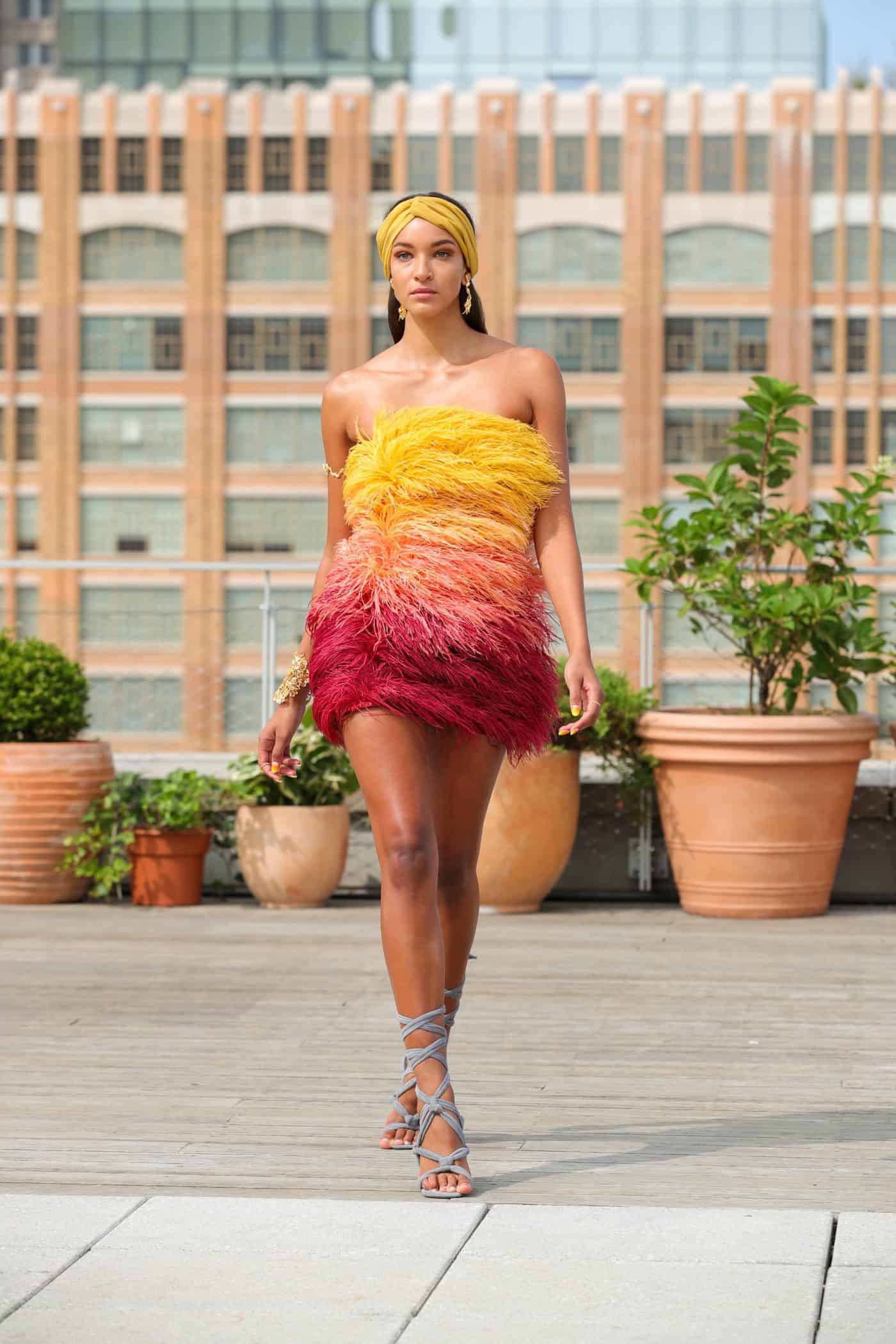 Next came similar silhouettes in a warmer palette, but with the welcome addition of feathers, draped ombré chiffon, flared sleeves, and mini frocks with so much bounce, it would have been a sin not to use the iPhone’s slo-mo function to capture the movement. It was the type of fashion smorgasbord we really needed to witness again. After months of living in sweat pants and shapeless house dresses, thank heavens Bronx and Banco is bringing sexy back.