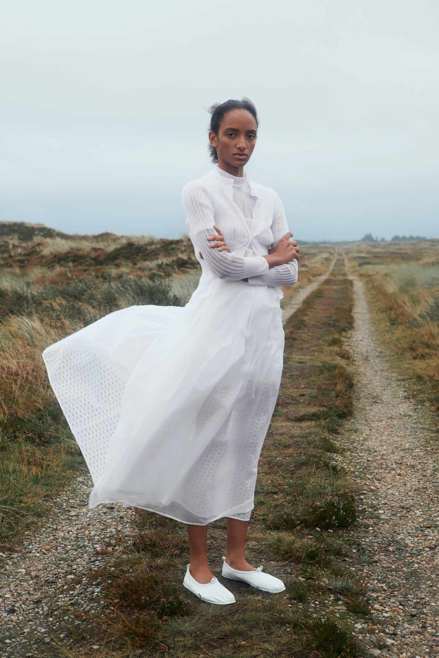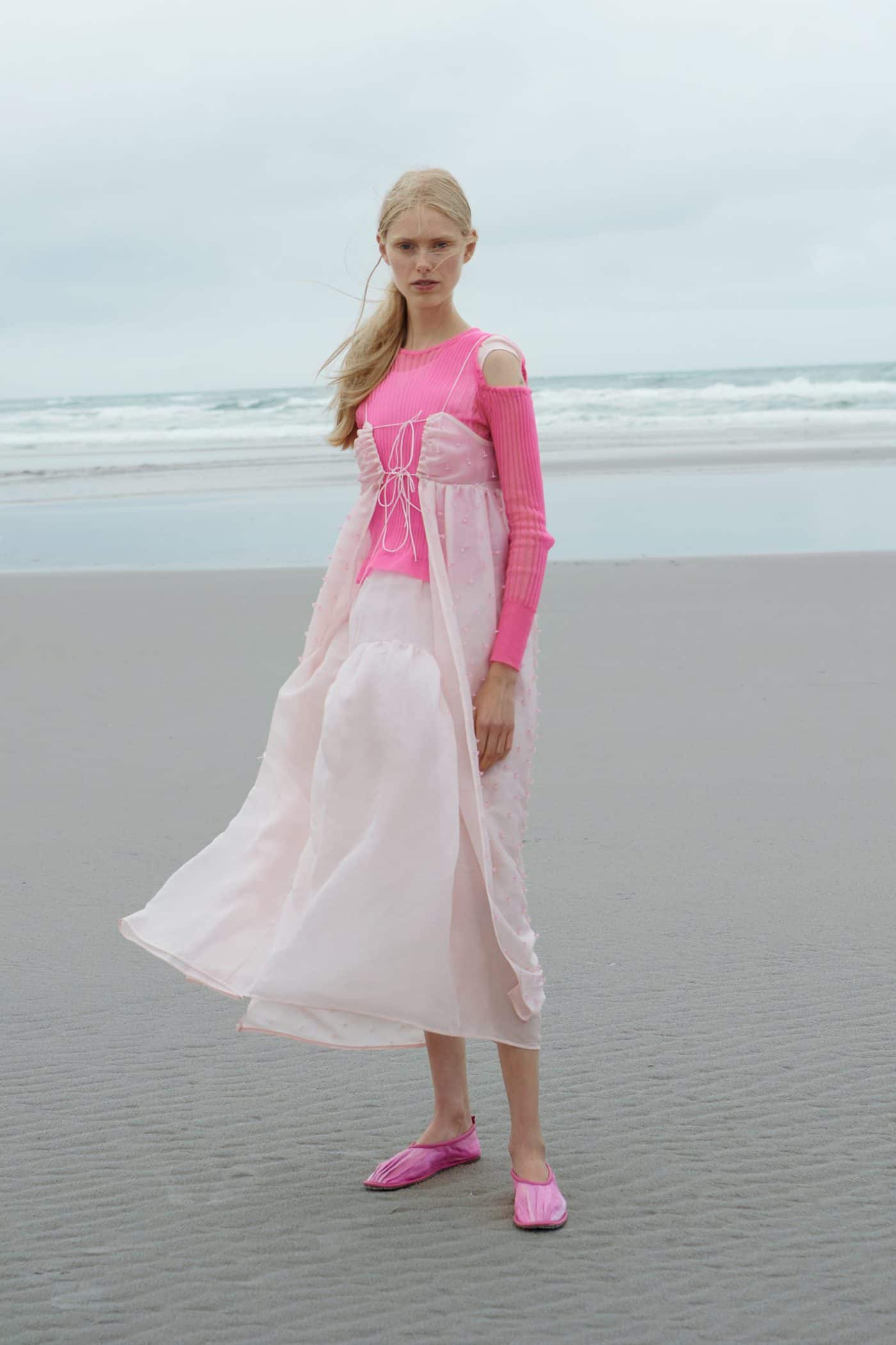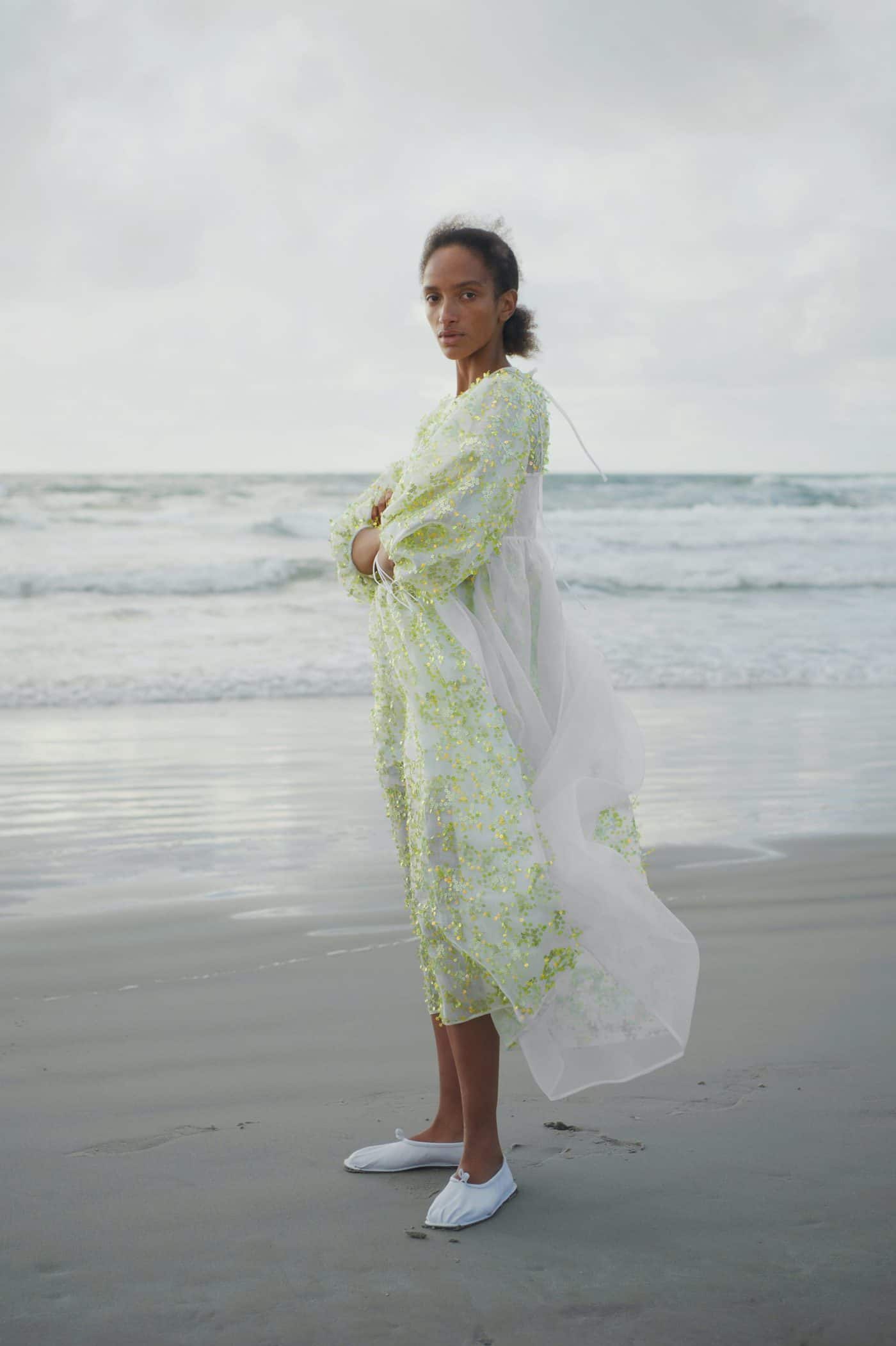 The collection expands on her now instantly-recognizable aesthetic. This time around, her signature dresses were reinvented in new silhouettes, like an off-the-shoulder balloon shape, and styled in unexpected ways with recycled cashmere knits and organza outerwear. Bahnsen collaborated once again with Mackintosh, giving the British heritage company’s rain mac a new spin, with the addition of balloon sleeves and a trapeze silhouette. And a dainty slipper-style shoe, in collaboration with the Spanish brand Hereu, has also been introduced. It doesn’t get much more ‘comfy chic’ that this.