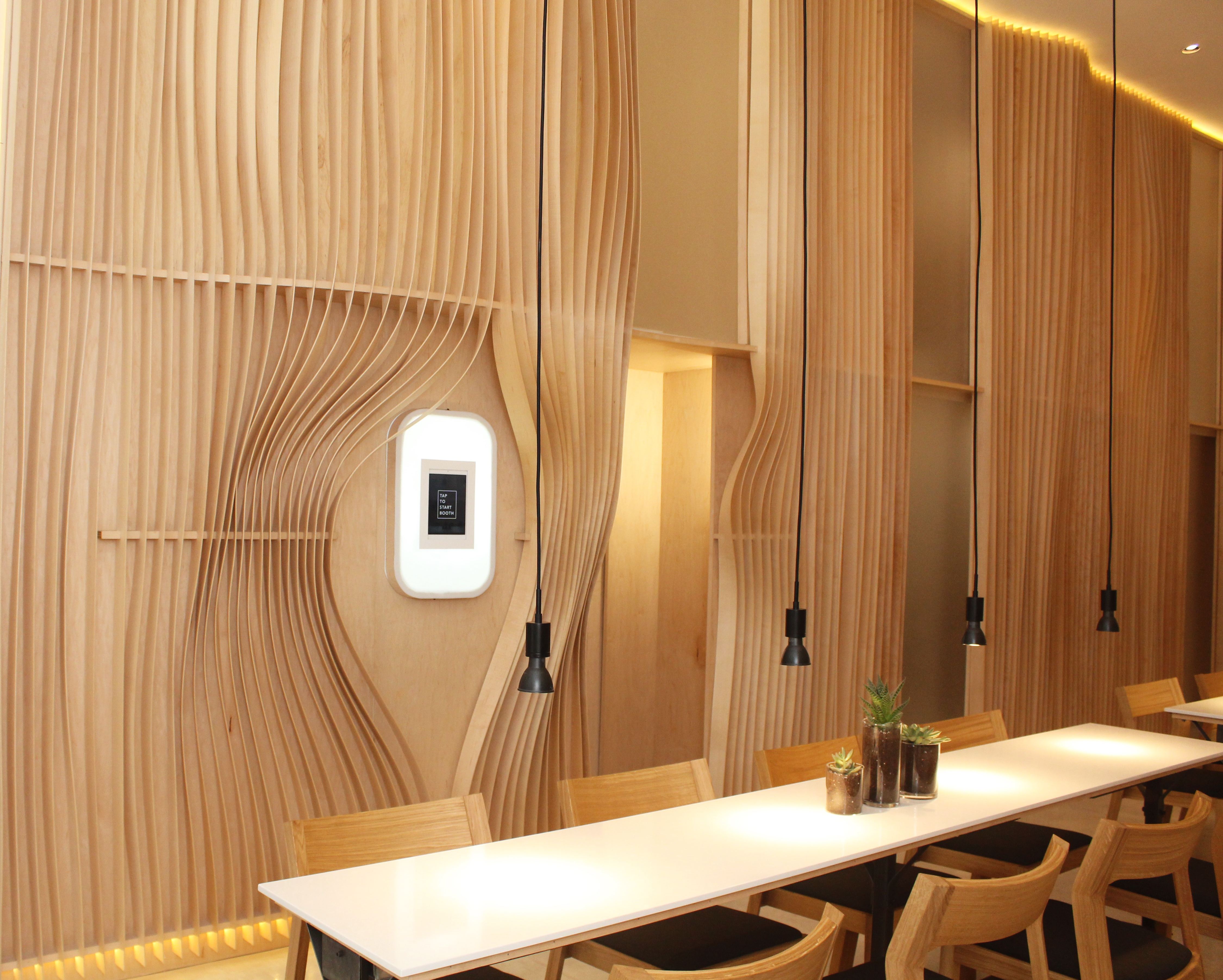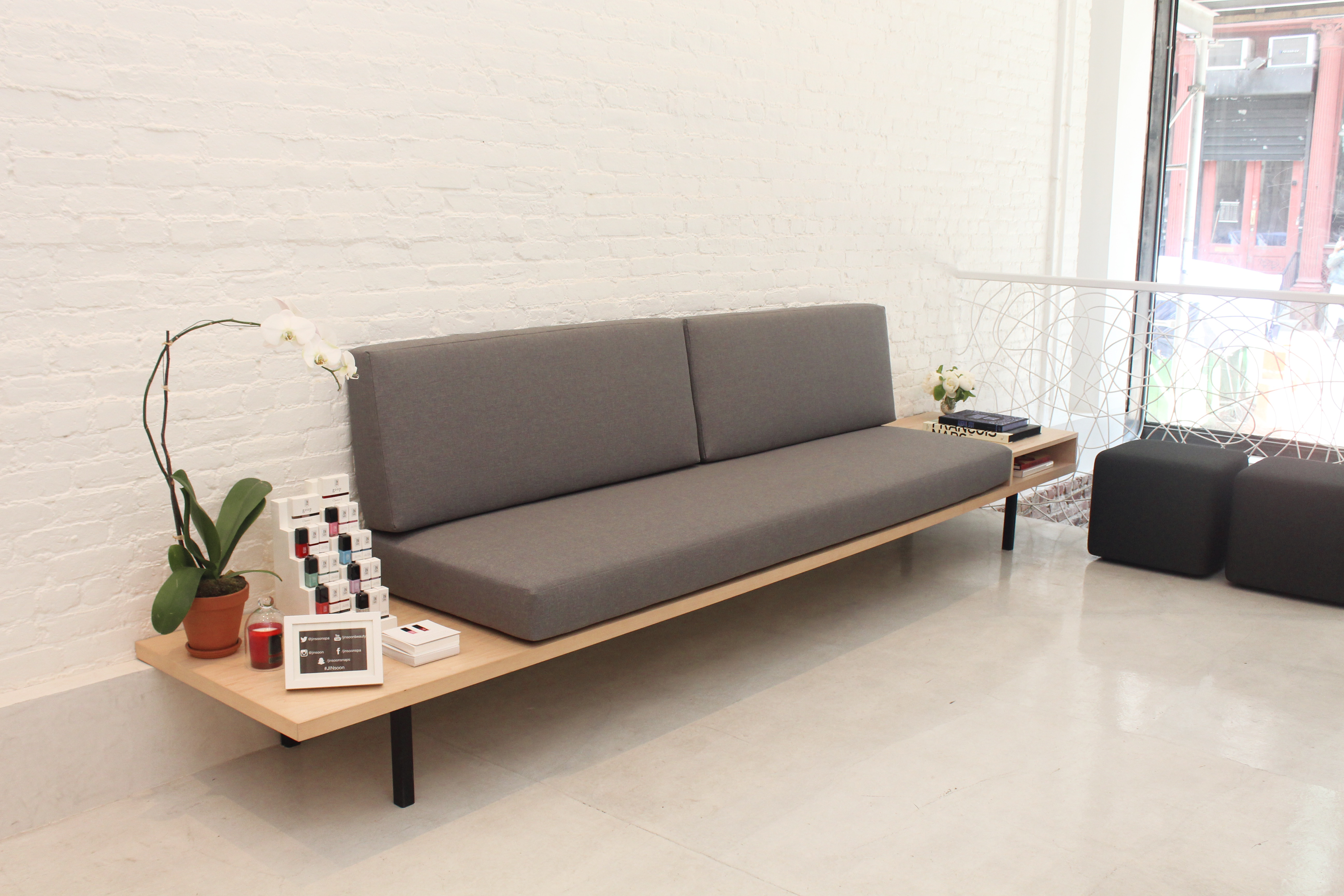 My husband wanted to retain the open aesthetic of this former gallery space, which has enough room to accommodate events, with its 12 manicure stations and eight pedicure stations. One exposed white brick wall serves as the nail polish display, or the “art” wall, set against a modern backdrop of whites and muted tones as the “museum” space. Nearly everything is custom designed and built, with an abundance of maple wood detail in both the architecture and the furniture.