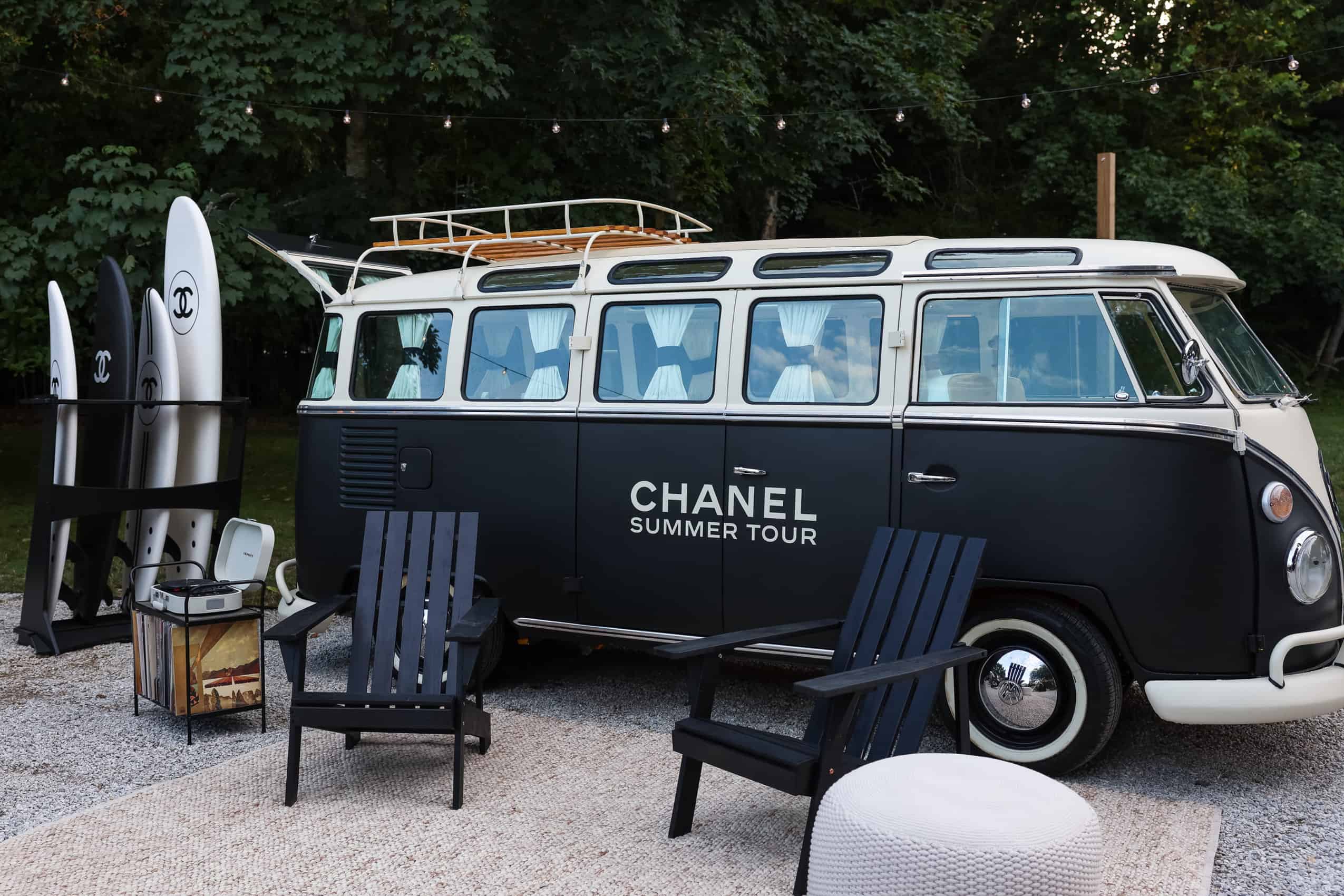 During the event, guests posed with the specially-commissioned retro Chanel camper van and surfboards which had been given a makeover with the interlocking C logo. Satiation for the night of dancing and mingling came thanks to a grill station, with prawns in garlic butter and charred lemon, hangar steak with chimichurri, and corn salad with chili and cotija cheese, as well as oysters, crab cakes, personal pizzas, and even ice cream cones which appeared in a rhythmic manner throughout the party.