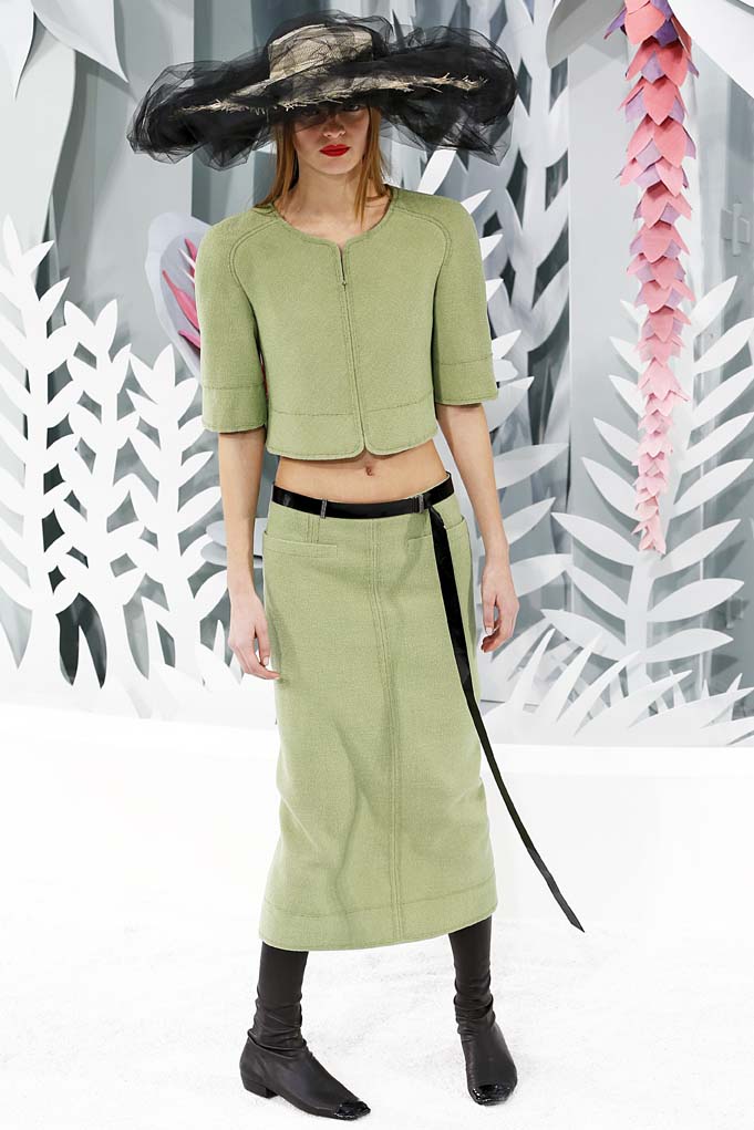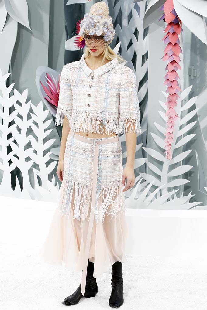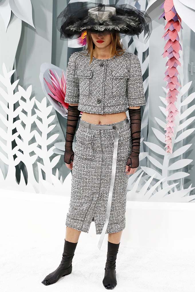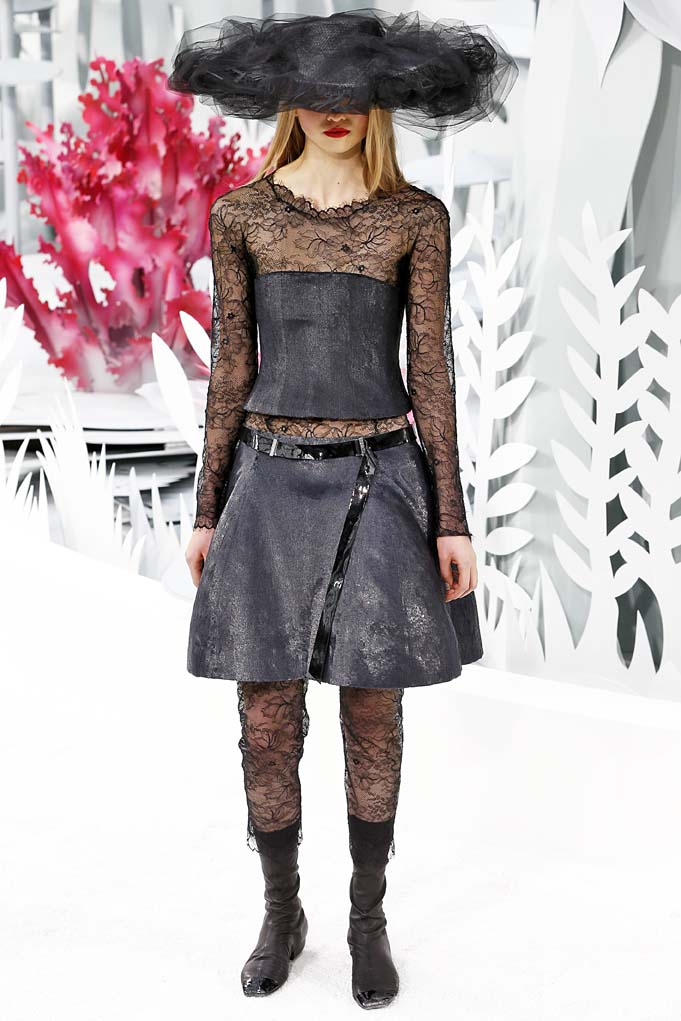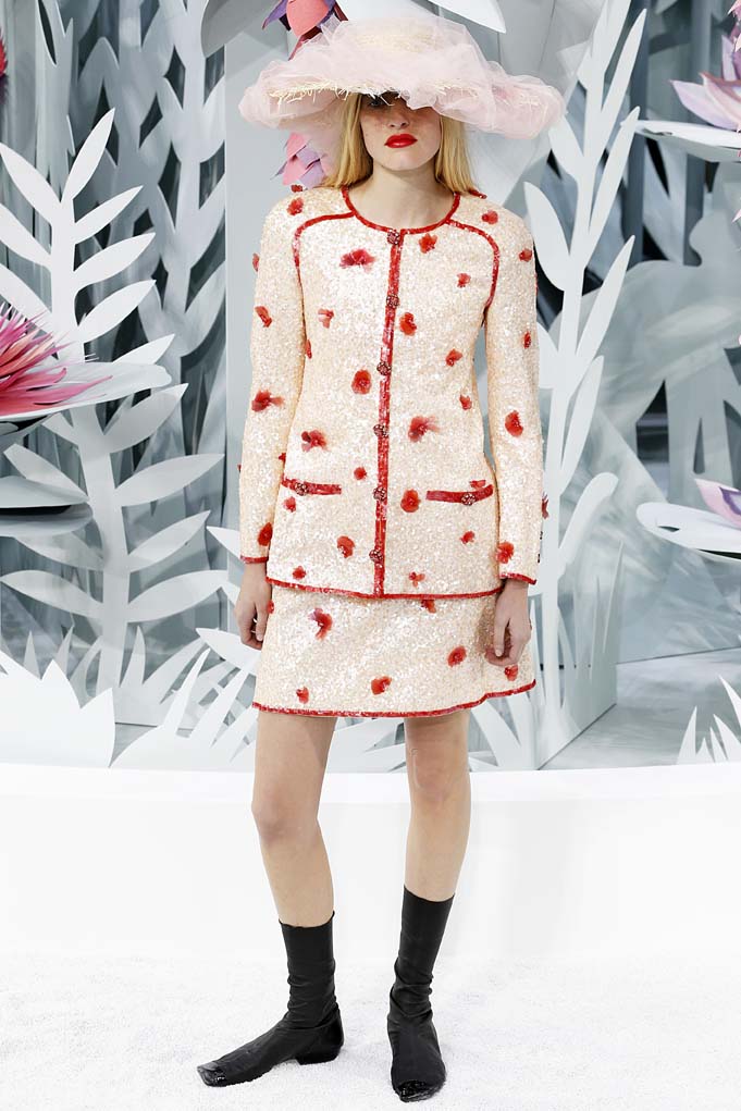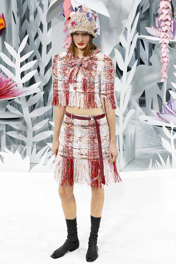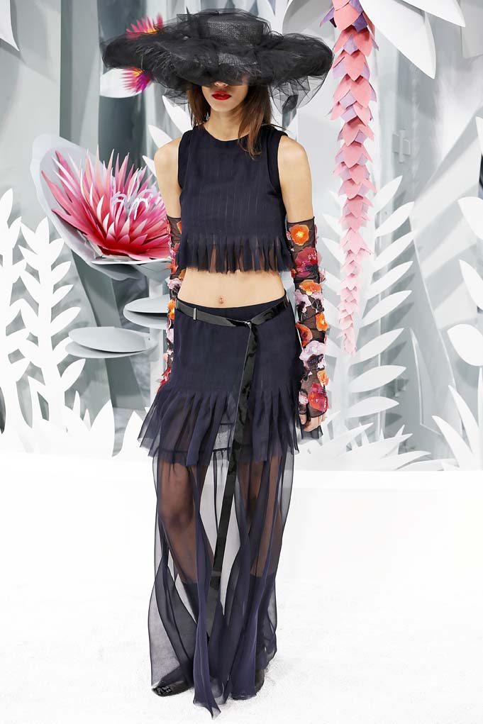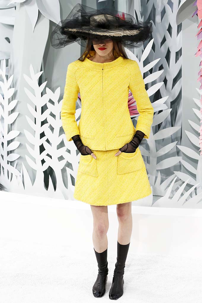Hobo chic? For the debut of Chanel’s haute couture collection this season, Karl Lagerfeld sent out a trio of male Huckleberry Finns whose outfits were topped off with frayed straw hats. One model even carried a watering can. The set for the show was a faux mechanical garden. What ensued for the ladies: distressed ladylike Chanel suits and skirt suits worn with giant straw hats wrapped haphazardly in black tulle, or knitted sequined granny-style hats with veils. The latter were occasionally adorned with kitschy junkyard florals. Traditional Chanel jackets and skirts came shredded at the hems, including two red and coral plaid crop-top looks.