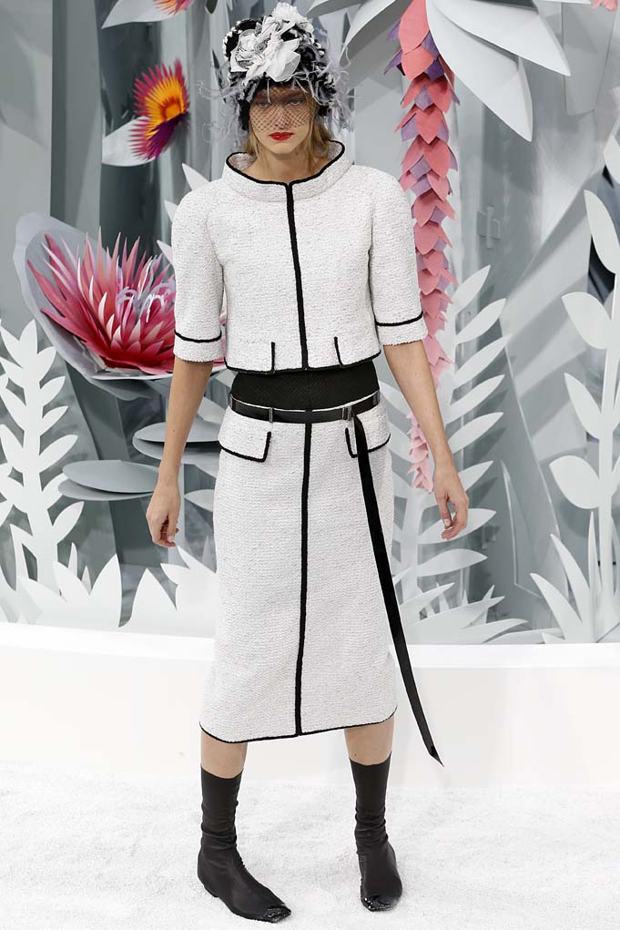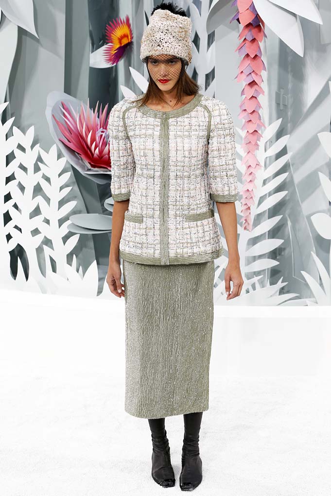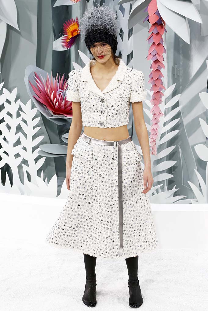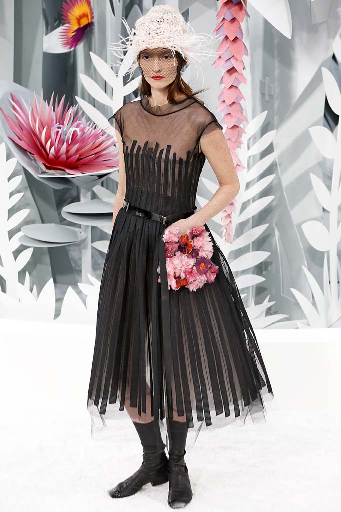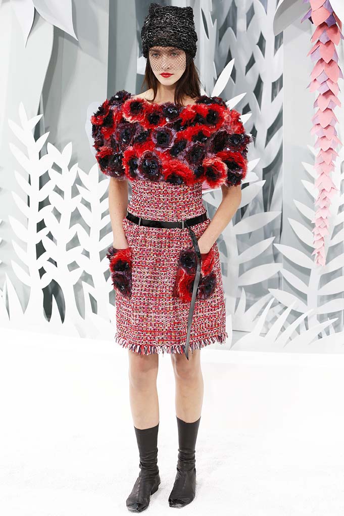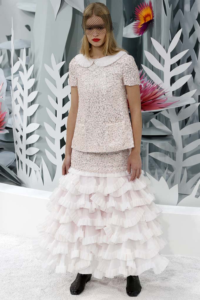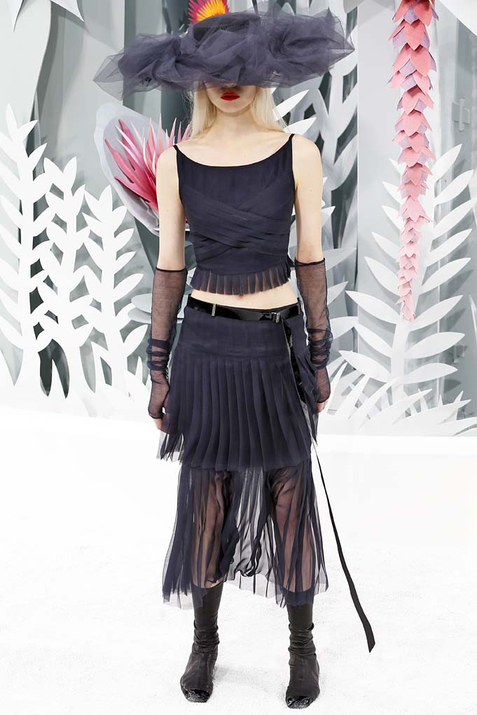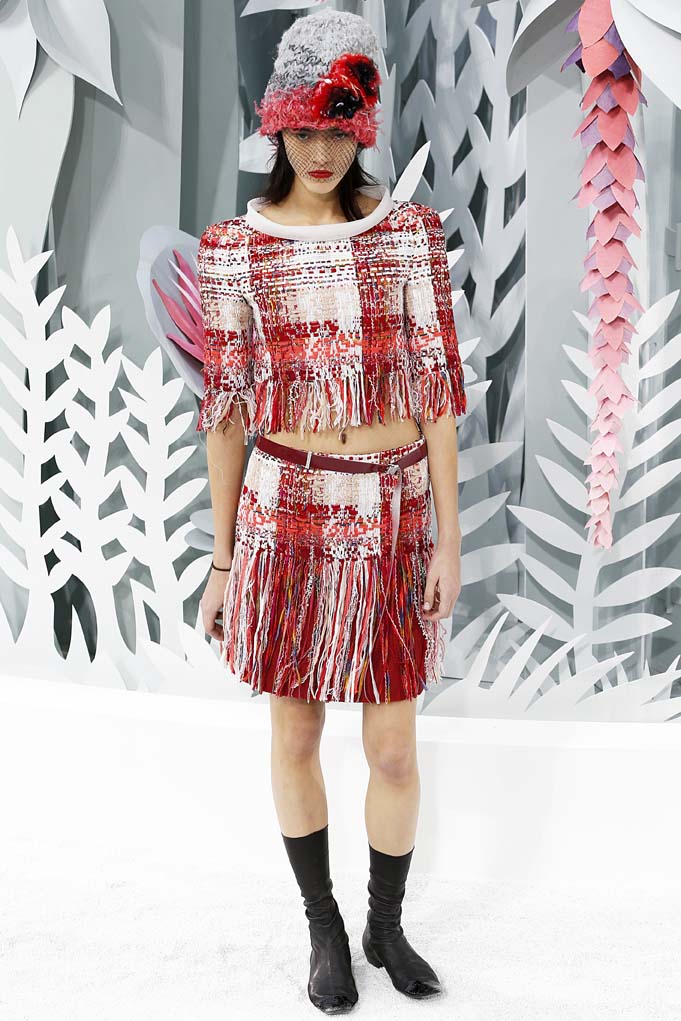 Hobo chic? For the debut of Chanel’s haute couture collection this season, Karl Lagerfeld sent out a trio of male Huckleberry Finns whose outfits were topped off with frayed straw hats. One model even carried a watering can. The set for the show was a faux mechanical garden. What ensued for the ladies: distressed ladylike Chanel suits and skirt suits worn with giant straw hats wrapped haphazardly in black tulle, or knitted sequined granny-style hats with veils. The latter were occasionally adorned with kitschy junkyard florals. Traditional Chanel jackets and skirts came shredded at the hems, including two red and coral plaid crop-top looks.