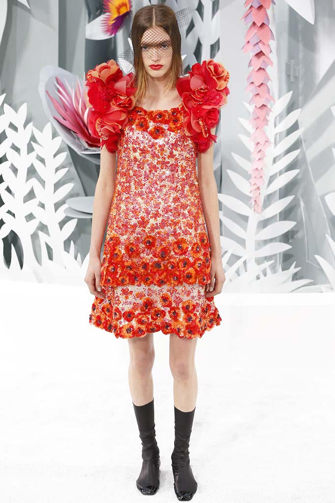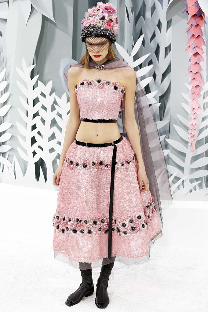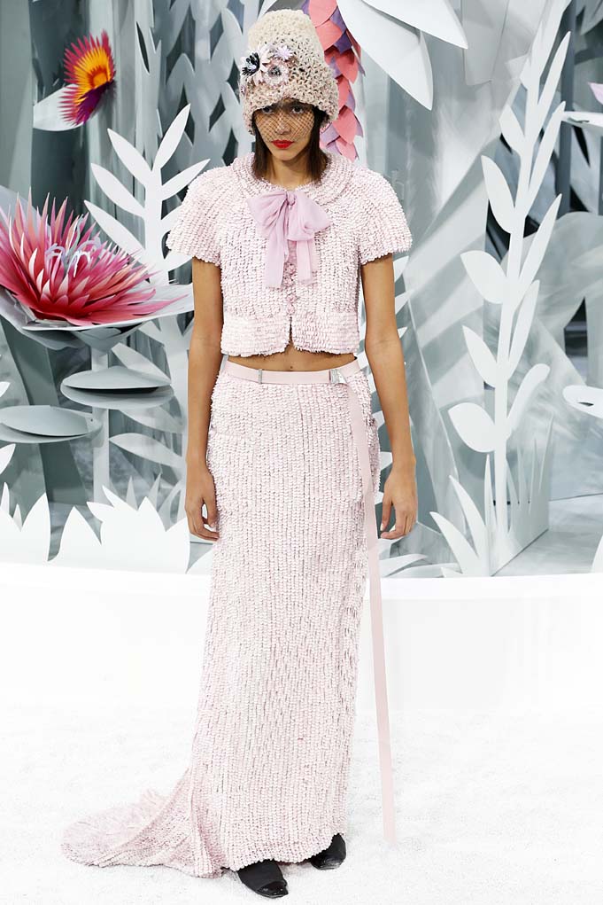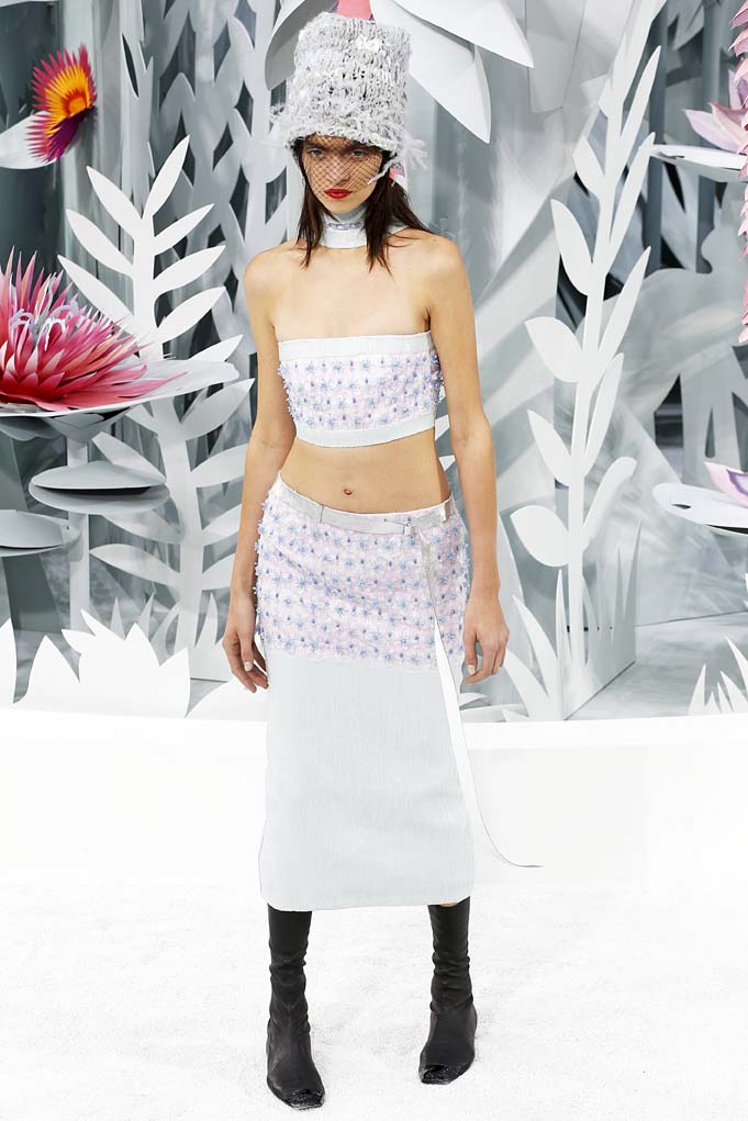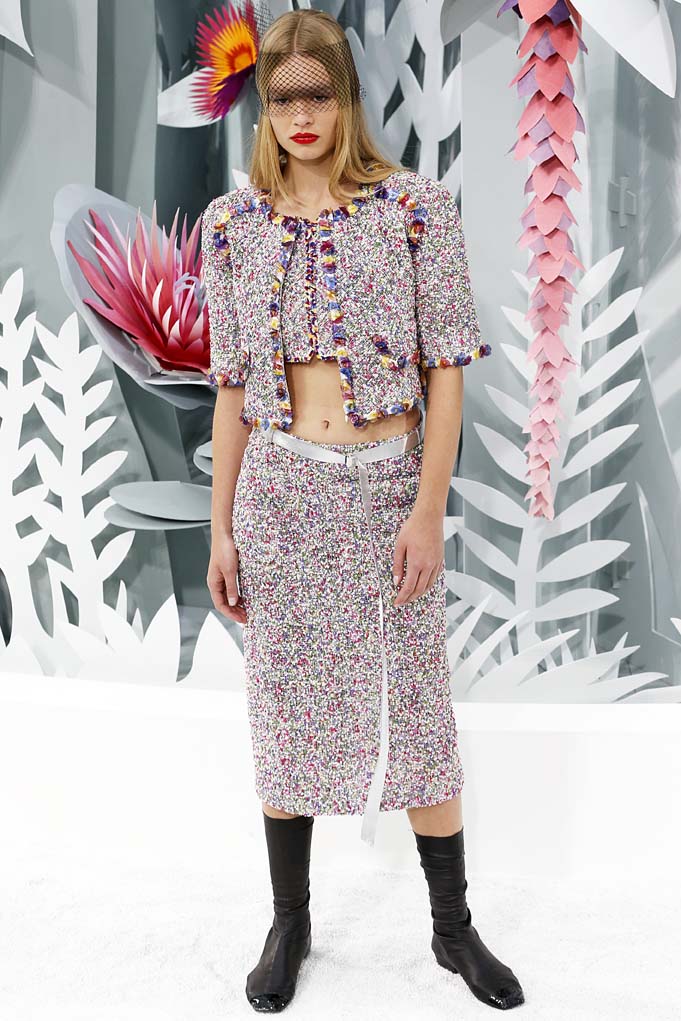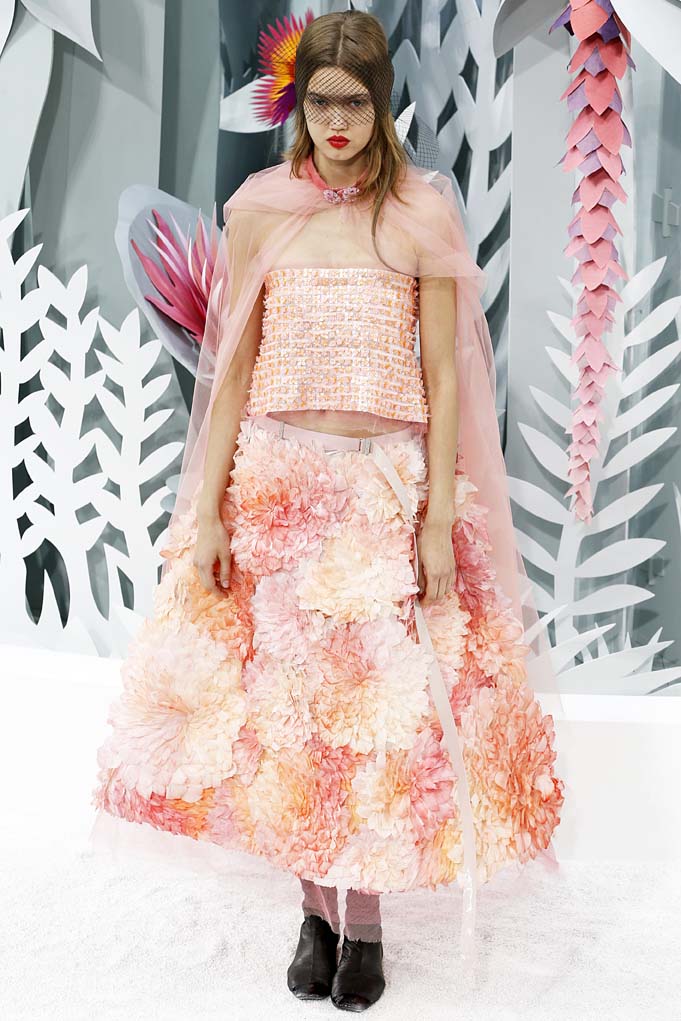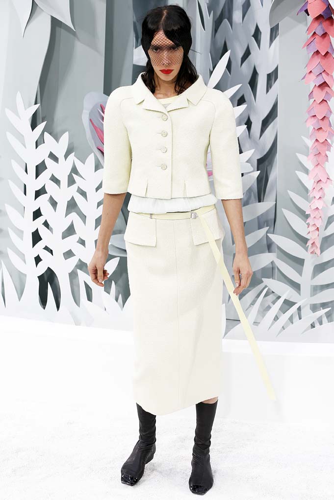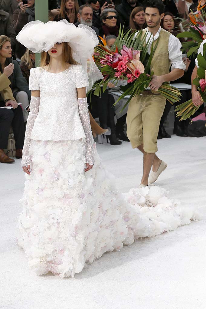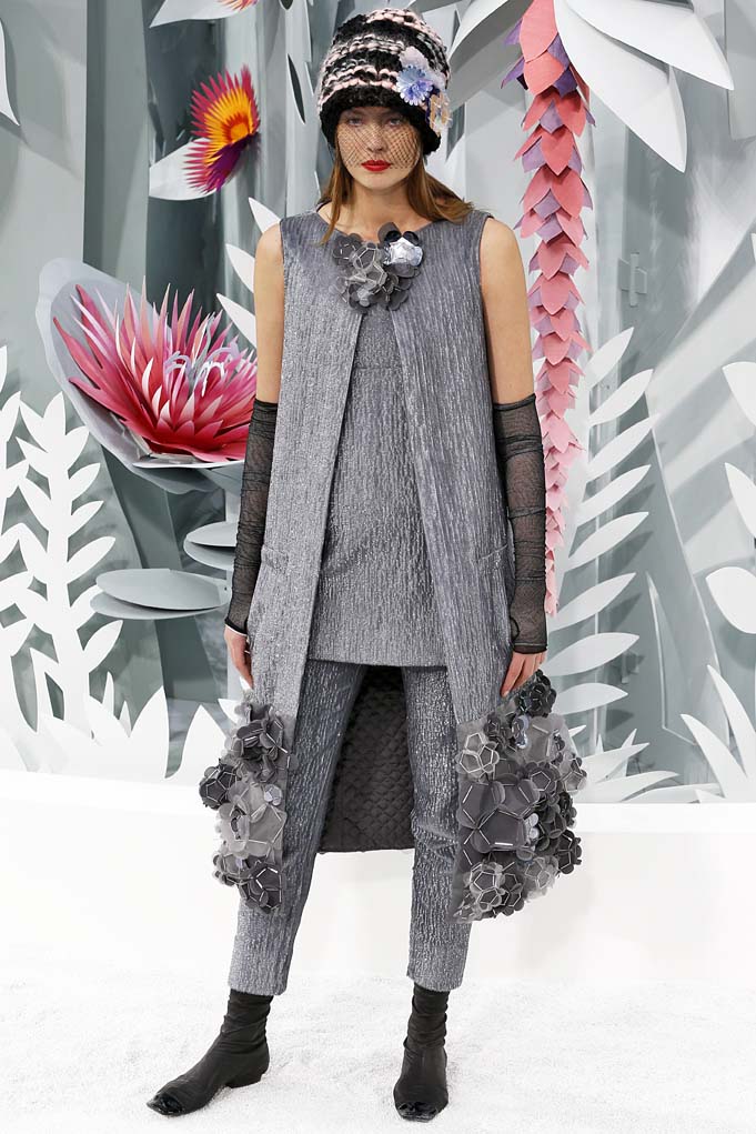 Hobo chic? For the debut of Chanel’s haute couture collection this season, Karl Lagerfeld sent out a trio of male Huckleberry Finns whose outfits were topped off with frayed straw hats. One model even carried a watering can. The set for the show was a faux mechanical garden. What ensued for the ladies: distressed ladylike Chanel suits and skirt suits worn with giant straw hats wrapped haphazardly in black tulle, or knitted sequined granny-style hats with veils. The latter were occasionally adorned with kitschy junkyard florals. Traditional Chanel jackets and skirts came shredded at the hems, including two red and coral plaid crop-top looks.