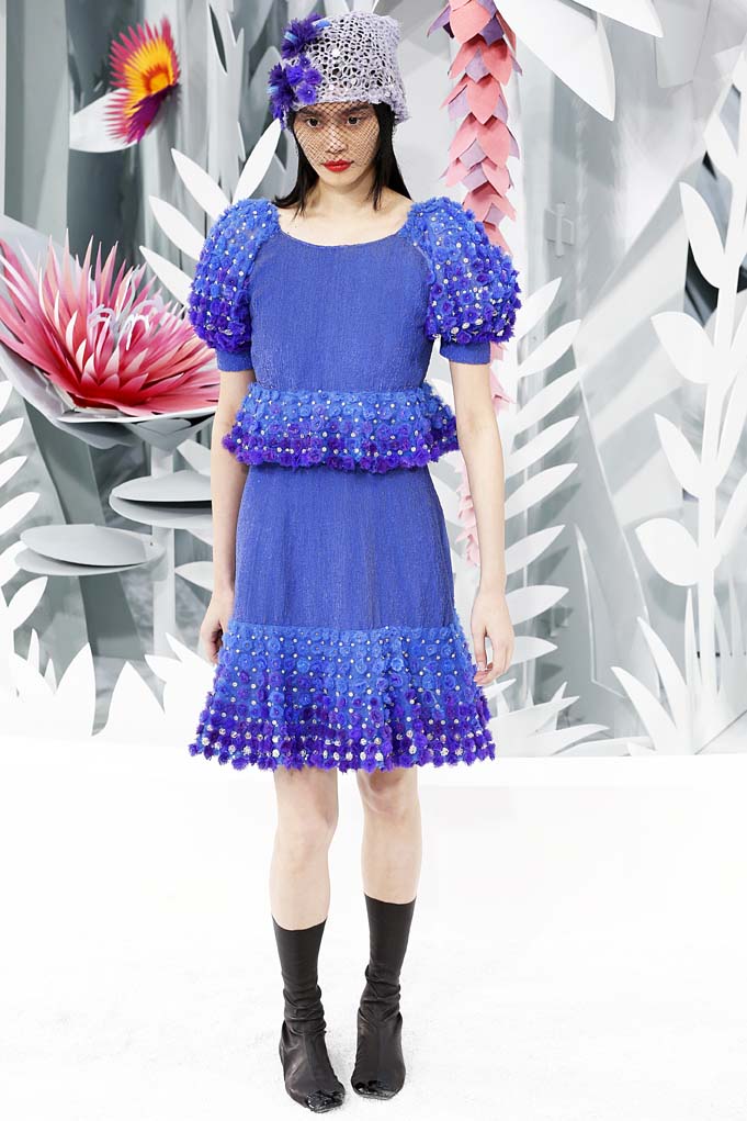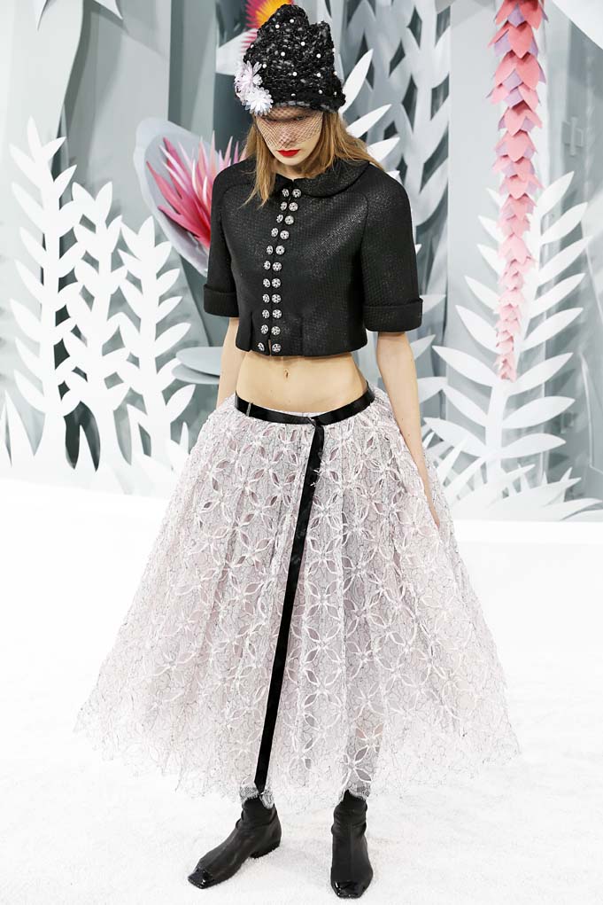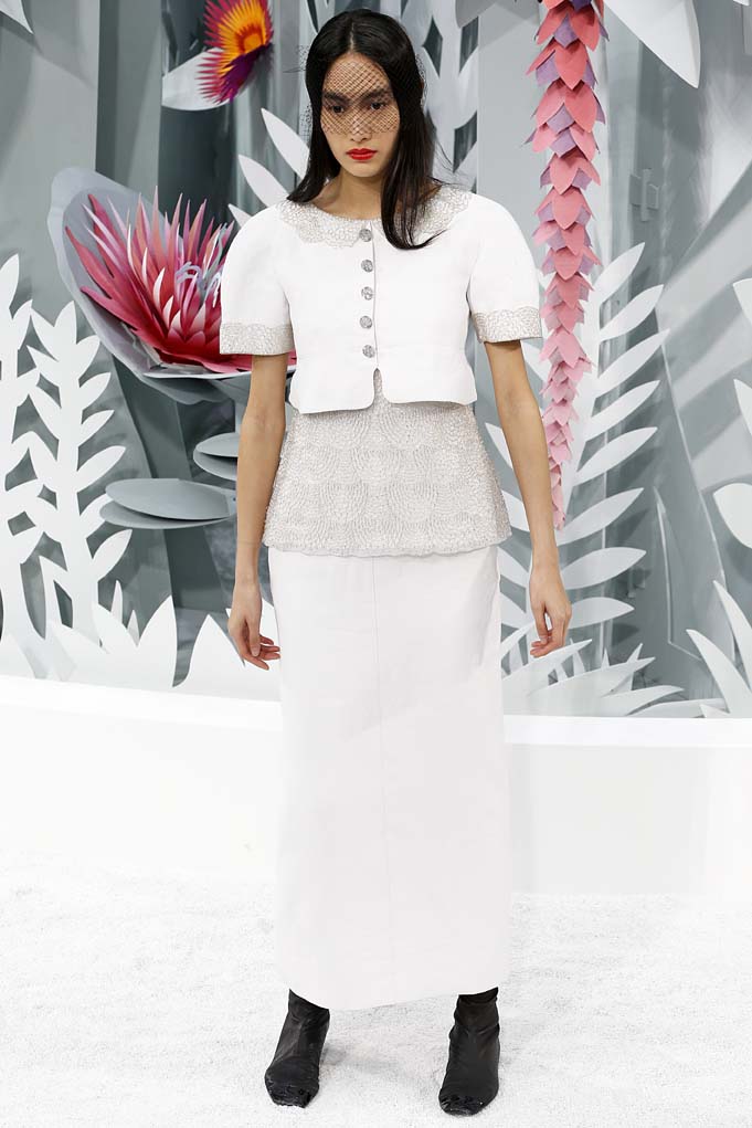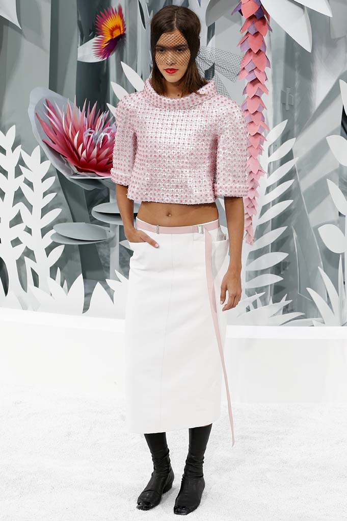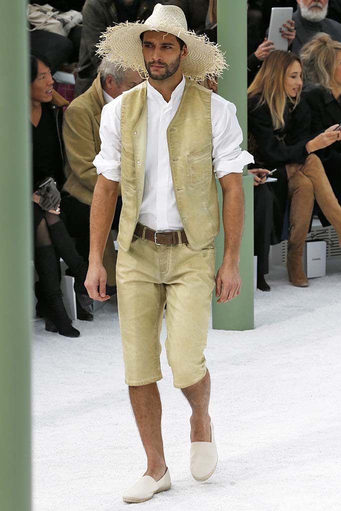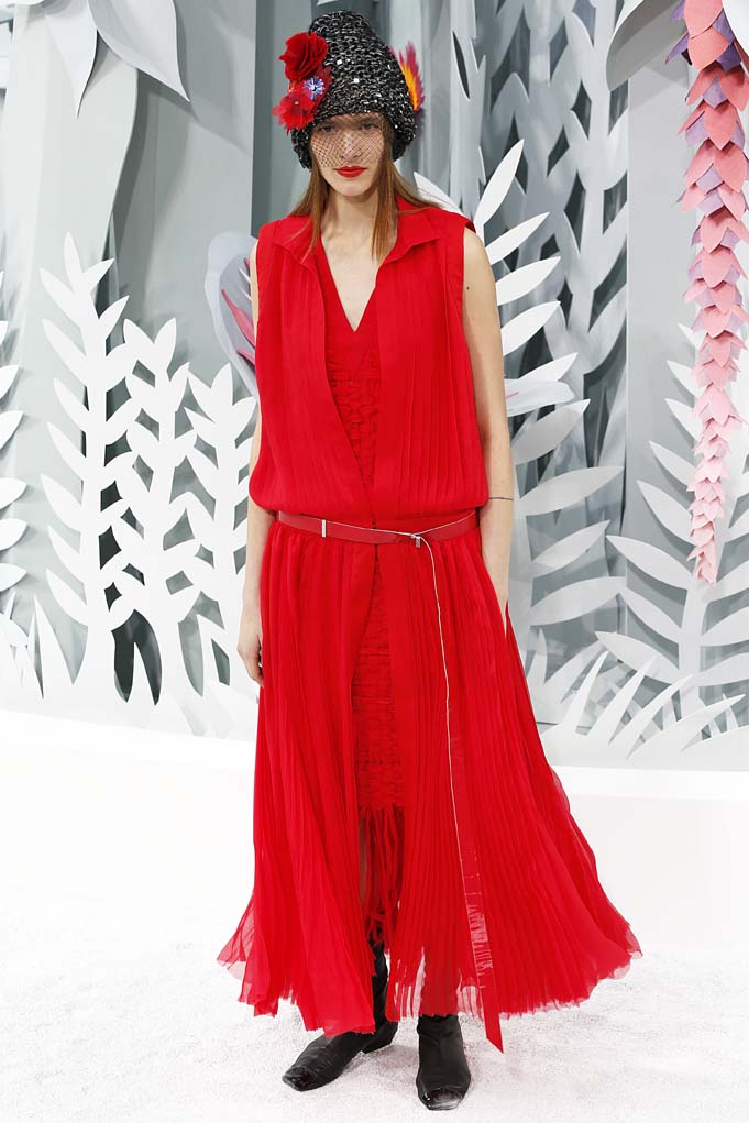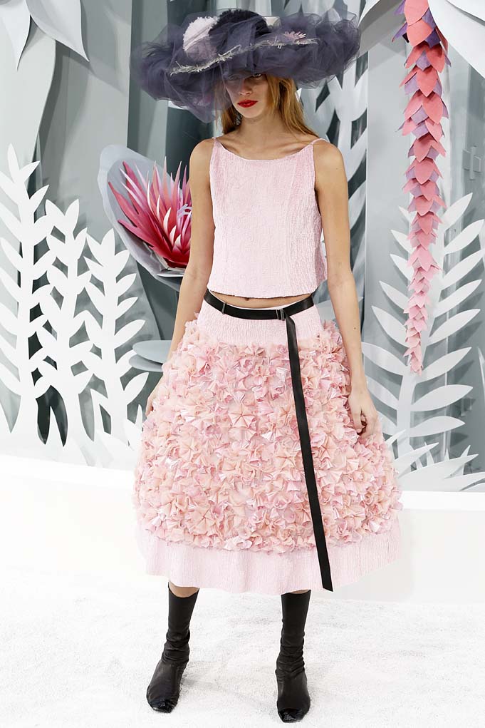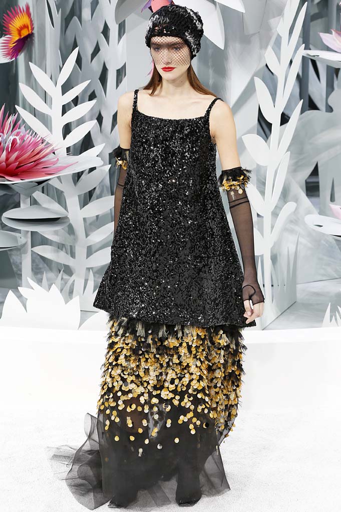 Hobo chic? For the debut of Chanel’s haute couture collection this season, Karl Lagerfeld sent out a trio of male Huckleberry Finns whose outfits were topped off with frayed straw hats. One model even carried a watering can. The set for the show was a faux mechanical garden. What ensued for the ladies: distressed ladylike Chanel suits and skirt suits worn with giant straw hats wrapped haphazardly in black tulle, or knitted sequined granny-style hats with veils. The latter were occasionally adorned with kitschy junkyard florals. Traditional Chanel jackets and skirts came shredded at the hems, including two red and coral plaid crop-top looks.