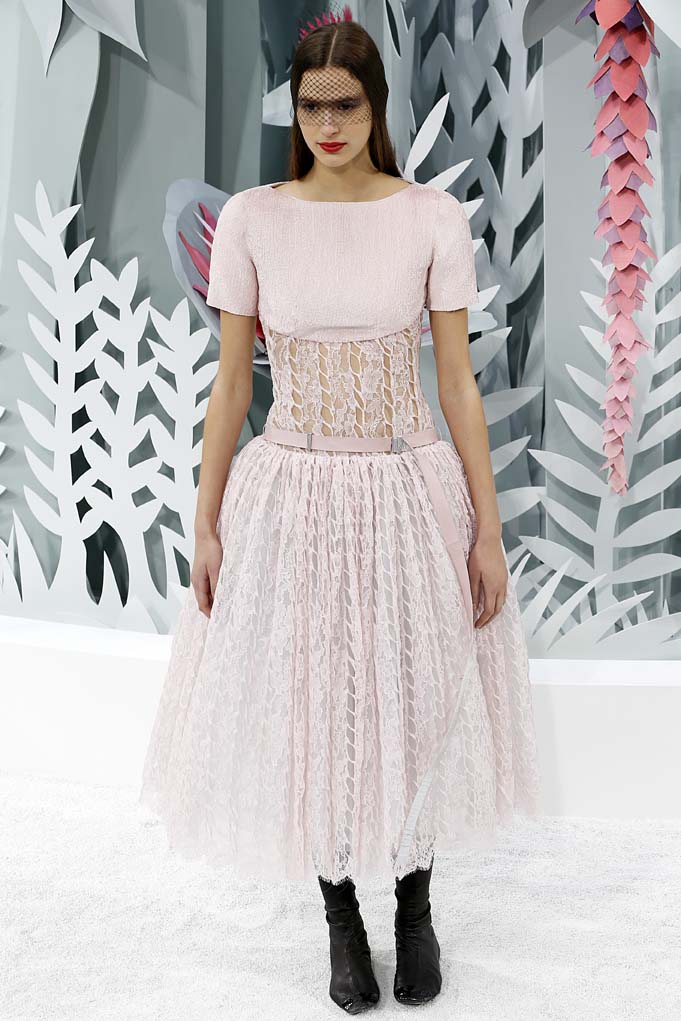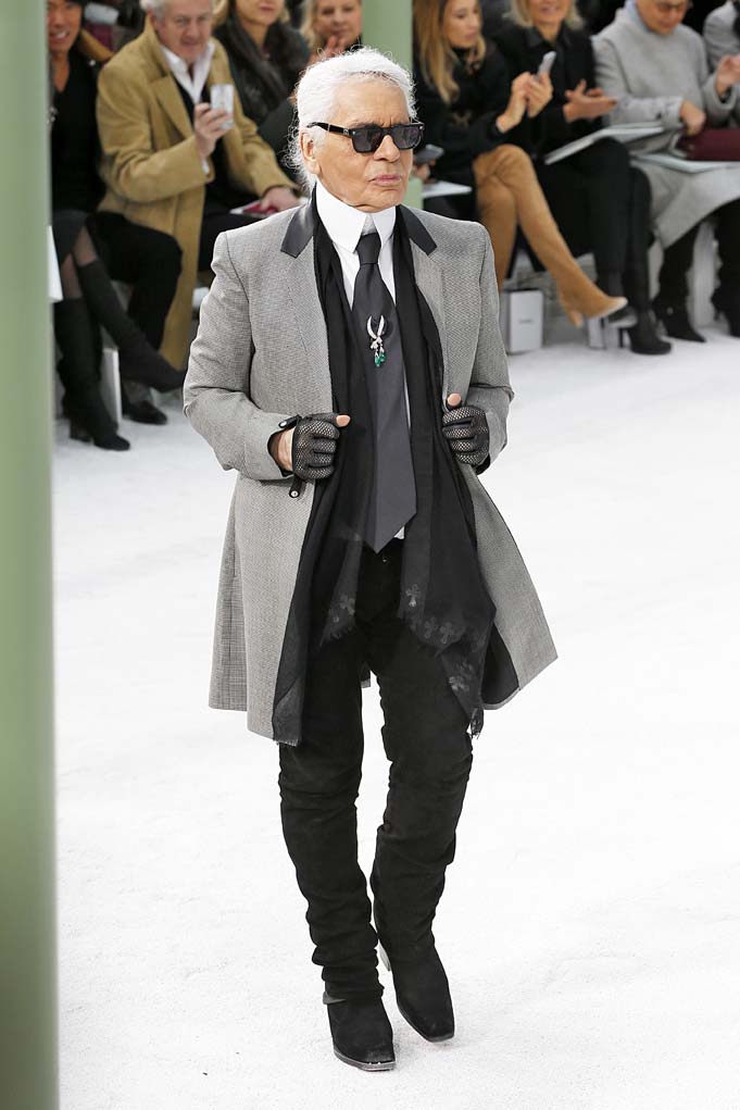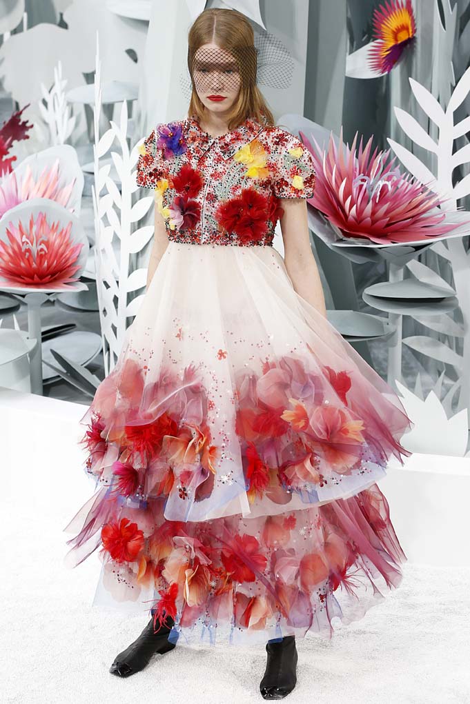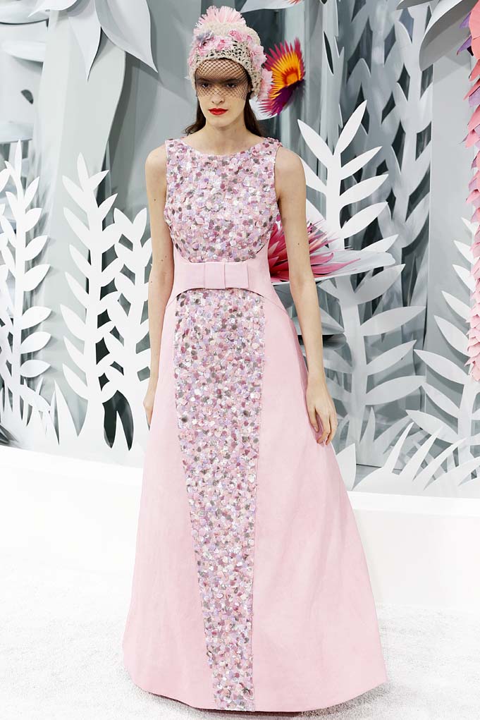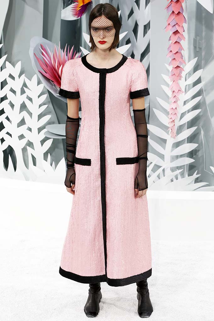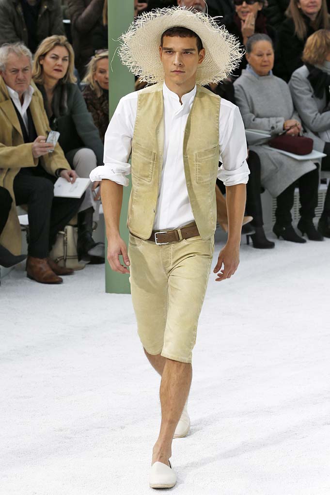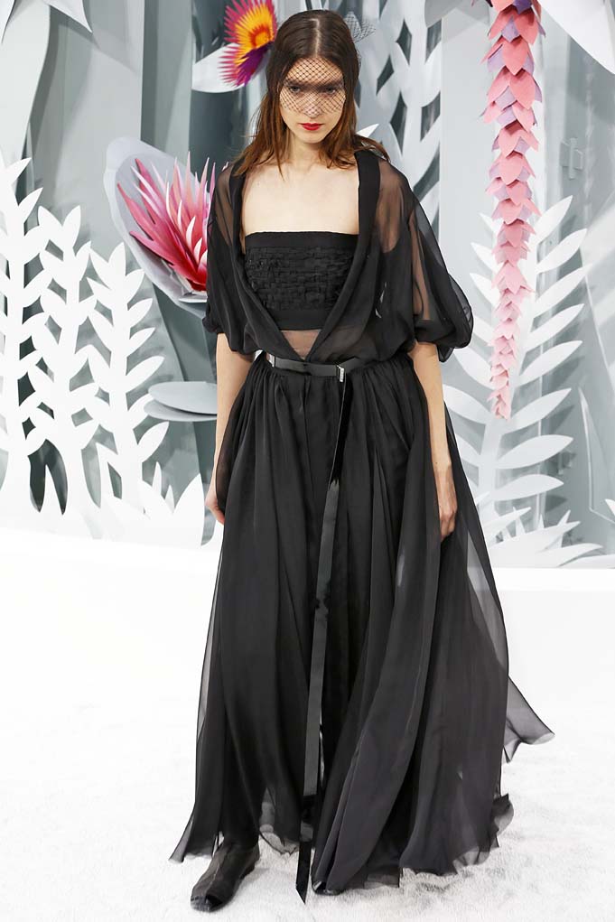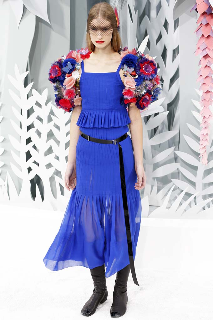 Hobo chic? For the debut of Chanel’s haute couture collection this season, Karl Lagerfeld sent out a trio of male Huckleberry Finns whose outfits were topped off with frayed straw hats. One model even carried a watering can. The set for the show was a faux mechanical garden. What ensued for the ladies: distressed ladylike Chanel suits and skirt suits worn with giant straw hats wrapped haphazardly in black tulle, or knitted sequined granny-style hats with veils. The latter were occasionally adorned with kitschy junkyard florals. Traditional Chanel jackets and skirts came shredded at the hems, including two red and coral plaid crop-top looks.