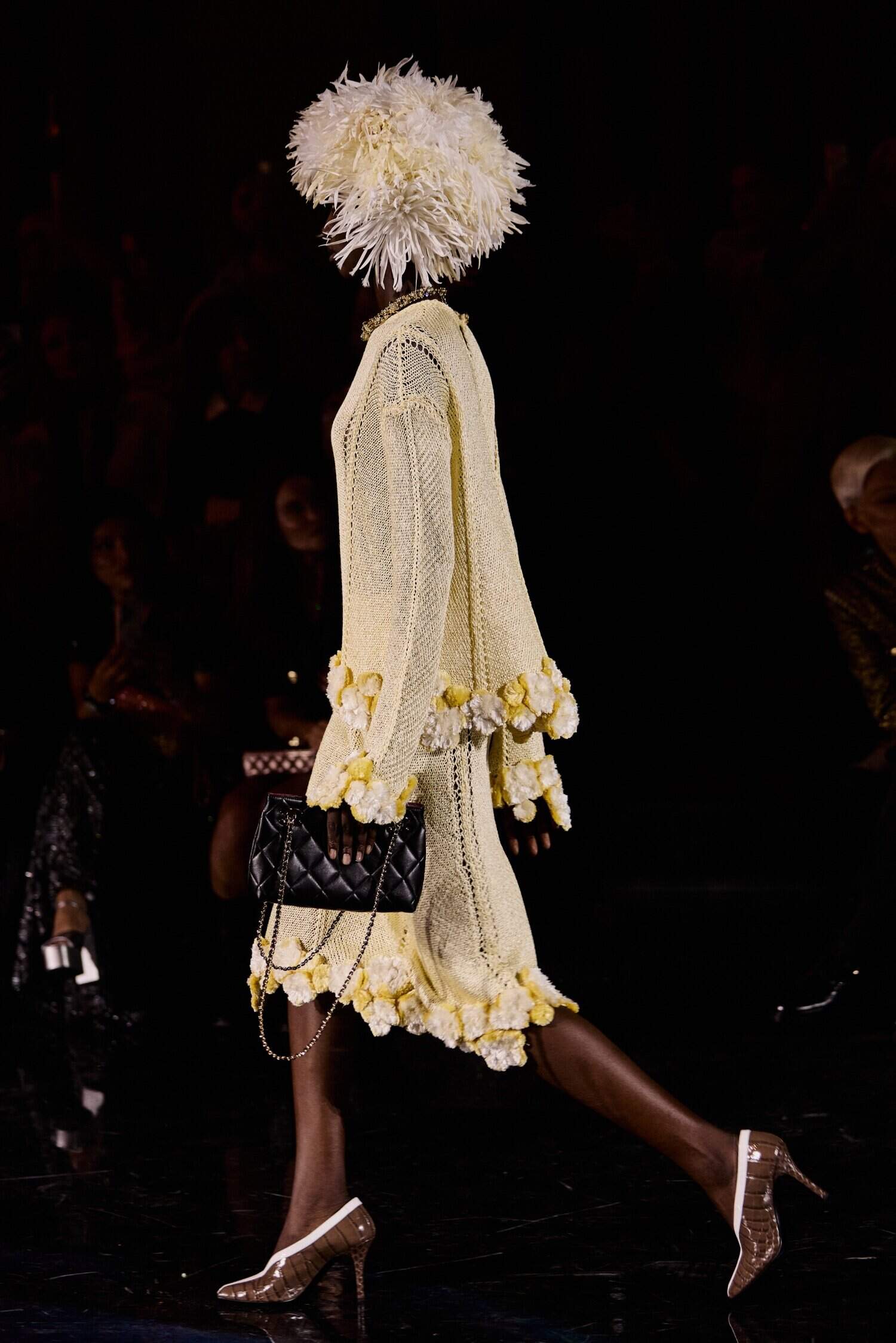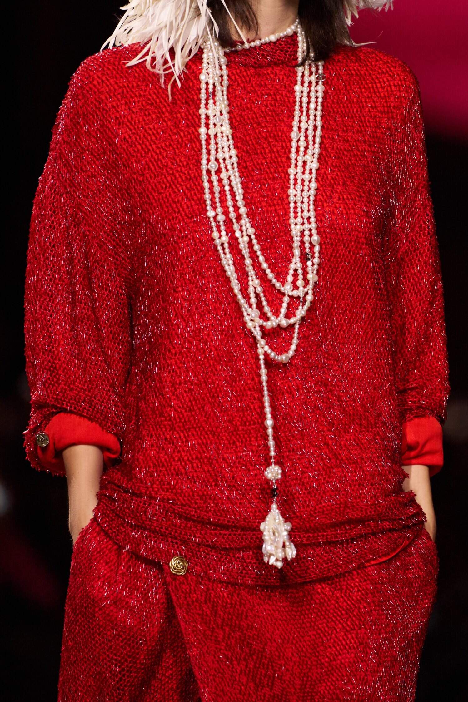 That changed take on Chanel constantly transformed the brand’s house codes into works of sculptural art. Wheat was shown in gilded statement necklace charms, but also as triple-toned earrings and tubular necklaces, chevron stitching, and feathered coat accents. Ladylike tweed was revamped into openwork knotting, plaid-printed sheer separates, fringed seed beadwork, and wispy striped feathers, instantly alerting the senses. The house’s camellias were transformed into raffia and multicolored beaded trims on dresses and jackets, flouncing as if coming alive themselves. Pearls were given a revamp with organic mixed sizes across pendants and layered necklaces, mixed in with wearable pieces like square-toed and cutout pumps, patent oxfords, smooth knits, and leather shoulder bags and clutches, emphasizing Blazy’s craft for elevating everyday staples. Plus, the theme of celestial space—rooted in Coco Chanel’s own passion for astronomy, as well as romance’s connection to the stars a la beau Boy Capel, who furthered her business into fashion—was sprinkled throughout, whether in multicolored bauble-strung statement necklaces, studded bangles, swirling planetary prints, or a standout celestial globe minaudière.