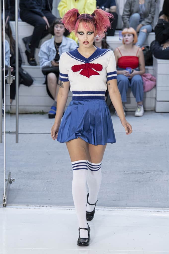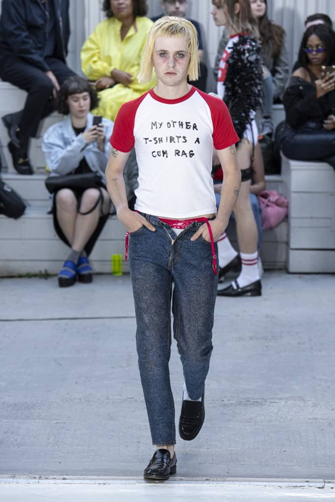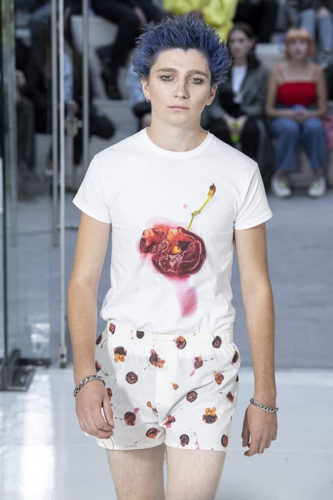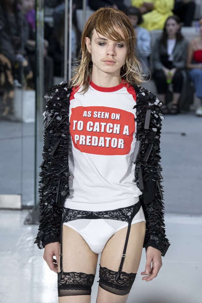 Of course, there is probably some deeper significance to Wrighton’s use of this, the cheesiest of crispy bagged snacks. His collection was, after all, inspired by the case of Jessi Slaughter, a preteen meme sensation from way back in 2010, and is full of sad references to lost innocence and the awkwardness and discomfort of budding adolescent sexuality in the internet age — from the Manga schoolgirl outfits to the “As Seen on To Catch a Predator” T-shirt to the print of smashed cherries, their stems tied in knots (perhaps by a particularly dextrous tongue — that old bar trick).