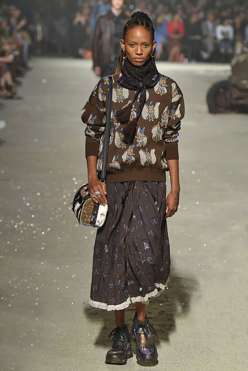 On September 11, Coach debuted their Spring Summer 2019 ready-to-wear collection at New York Fashion Week. The collection gave off some seriously industrial vibes coupled with a seriously sweet and nostalgic Disney collaboration. This is not the first time the two conglomerates have worked together, but it’s by far the most exciting because some of these pieces are already available for purchase! The show featured a number of sweaters and sweatshirts adorned with Disney characters, such as Bambi, as well as some extremely subtle Disney themed prints that snuck their way on to a handful of skirts and sweaters.