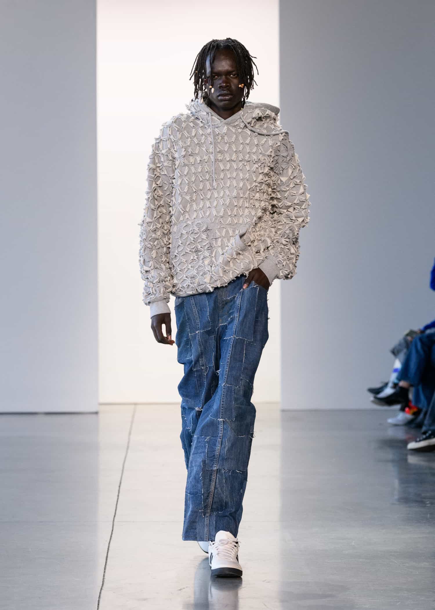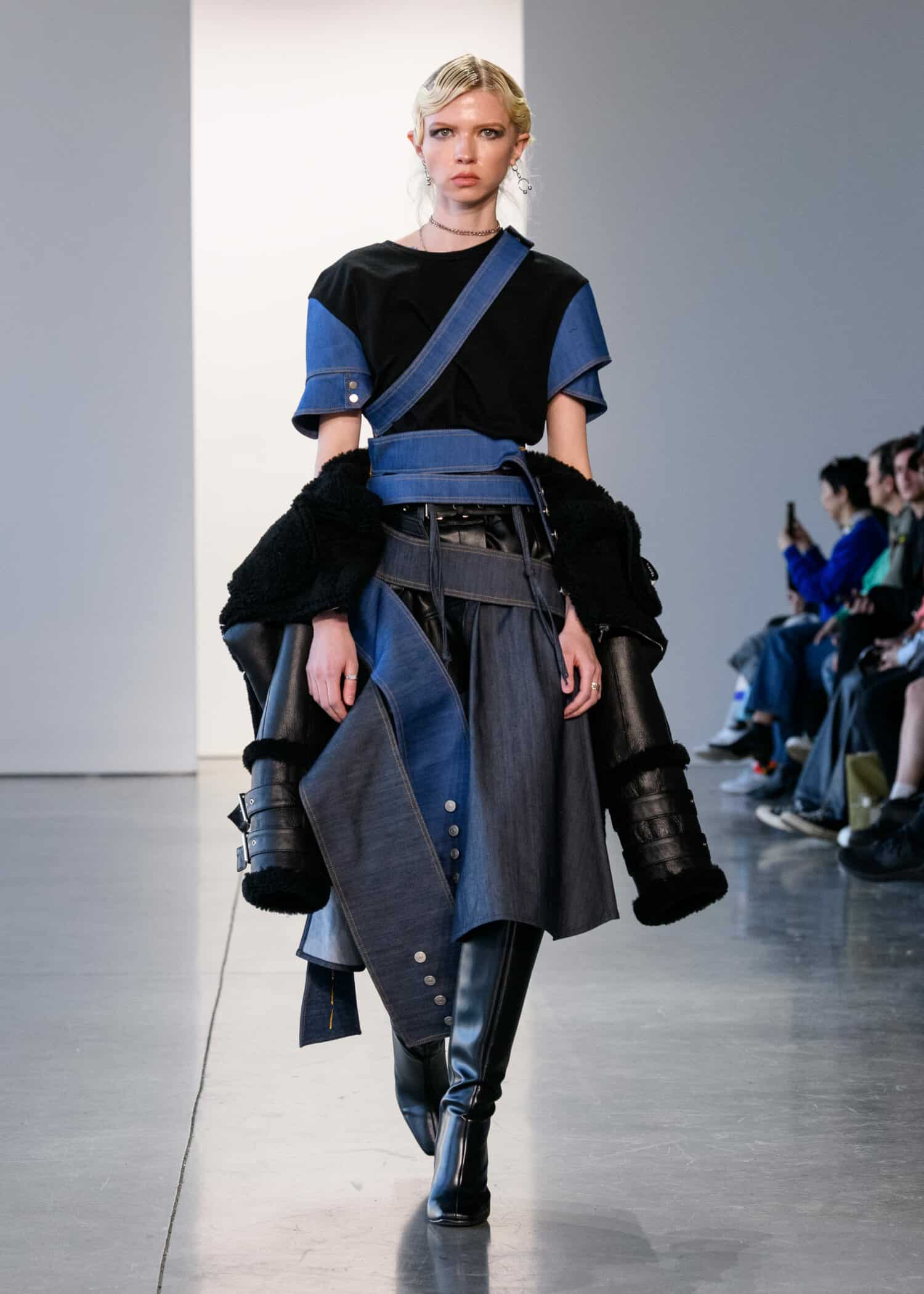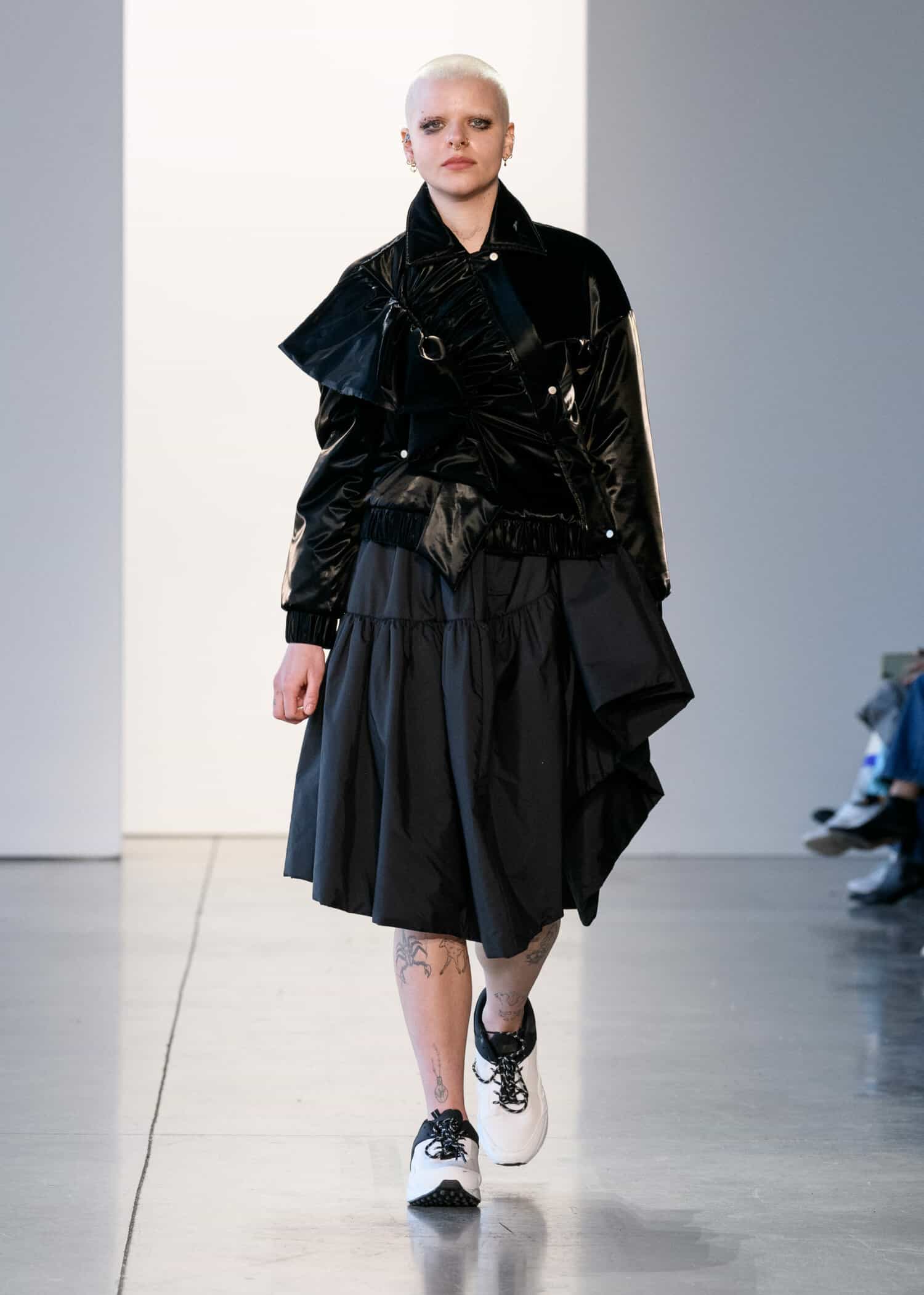 Next up was a collection by ul:kin, with designer Seong Dong Lee showing an edgy unisex collection. The designer has made sustainability a focus in his collection’s through upcycling. This season’s concept, The Blind Spot of Safe Space, sought to reinvent the classics with a modern spin.