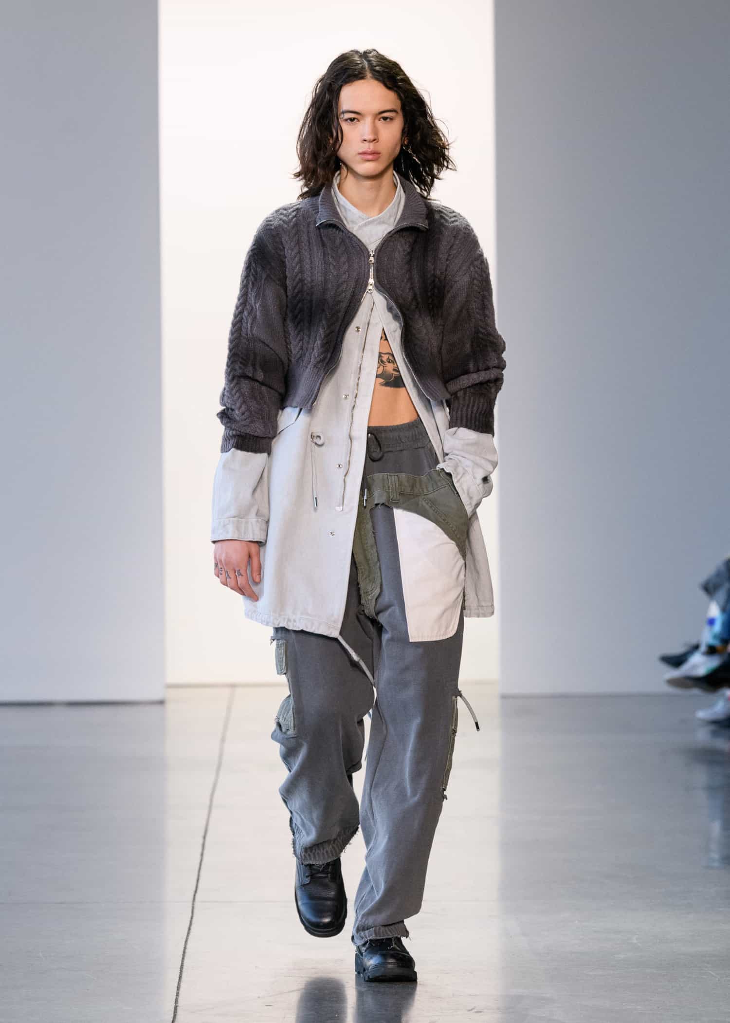 Royal College of Arts in London and London College of Fashion alumni Jae Hyuk Lim and Bona Kim of BESFXXK showed the most avante-garde looks of the trio showing. The brand launched in 2017 and takes a surgical approach to design and product development, with techniques involving physically combining separate pieces with different backgrounds and histories. See it in action, below: