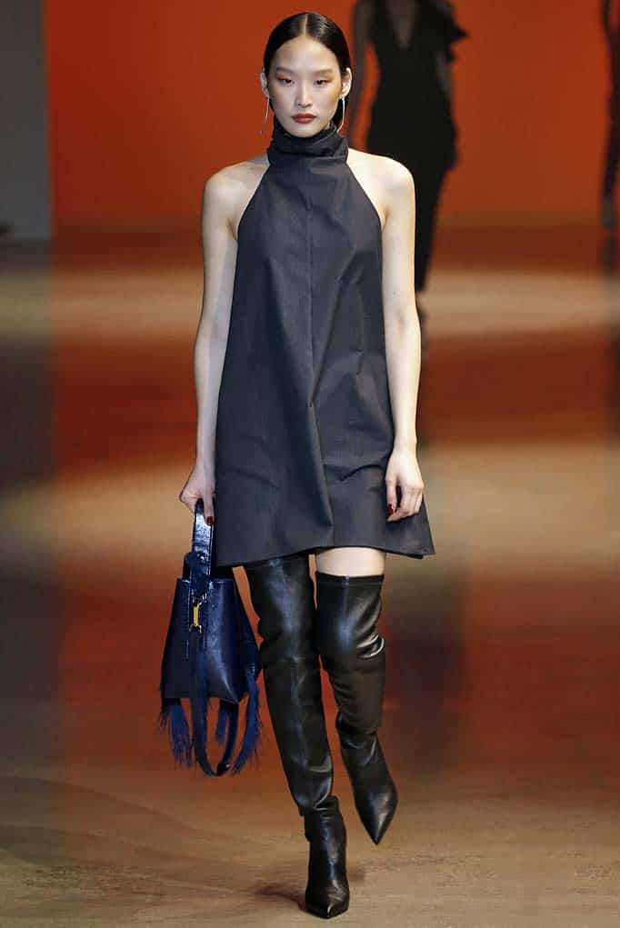 tailored silhouettes were given a sense of ease and movement through the use of pleats and tucks, and a fresh sense of fluidity was introduced through bias slip dresses, A-line skirts, and wide-leg pants. Artful draping creates belted waists, asymmetric necklines and 1920’s-inspired scarf detailing — often trimmed with layered fringe or tassels.