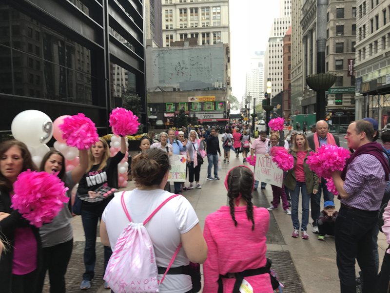 9:45 AM: We go through the Financial District and pause to take a team photo with Kristen Visbal’s Fearless Girl statue. She stands defiantly, arms akimbo, and we all strike a similar pose. For me, in that moment, she represents all of the Avon 39 warriors out there.