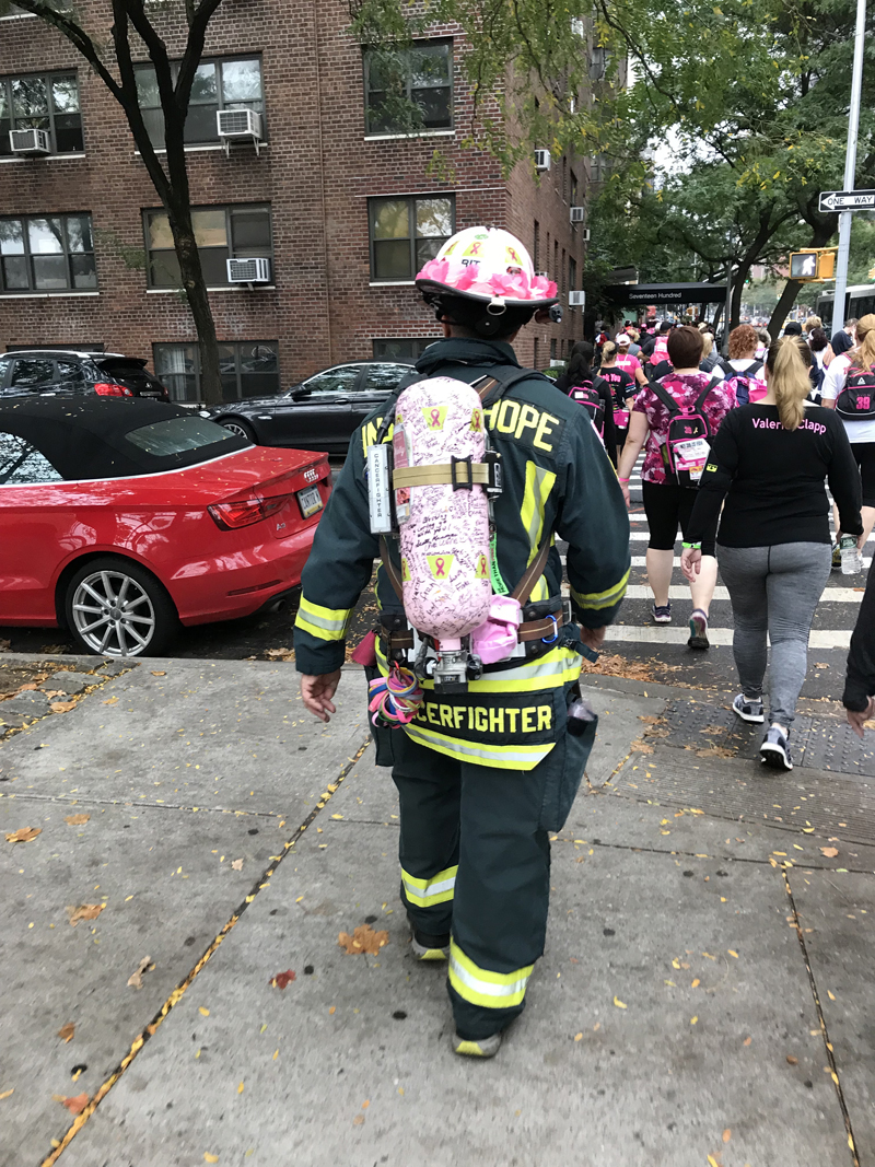 10:15 AM: We notice a firefighter walking with us — in complete uniform. Pink helmet and pink air tank, too. We take a picture together. I can’t believe he’s doing all 39 miles in his gear. Later, I Google how much his uniform weighs and learn it can range anywhere from 45 to 75 pounds! He was just one of the many inspiring people I’ve met so far. Someone else tells me another walker is in the middle of chemotherapy. Anyone who does a walk like this knows that it’s much more than just a walk…