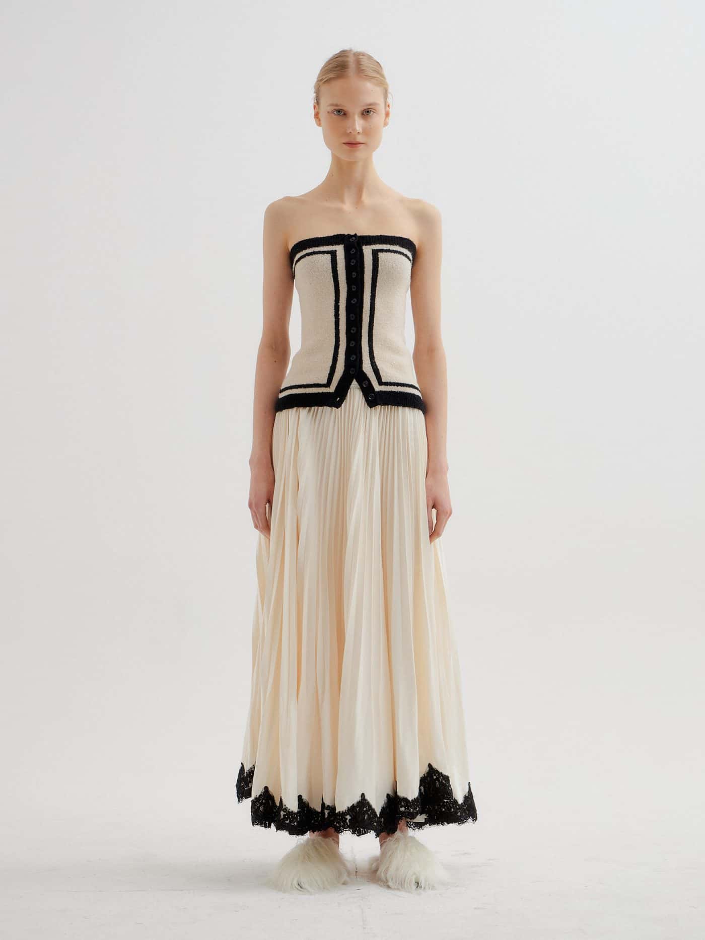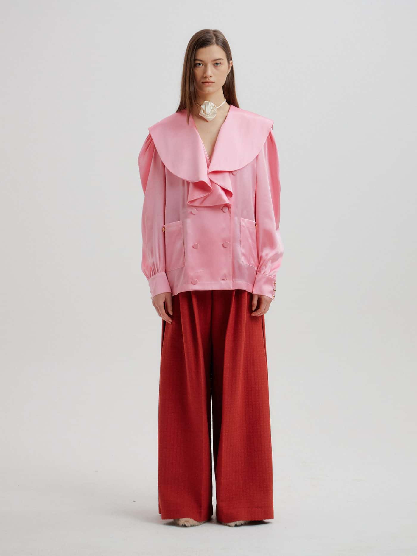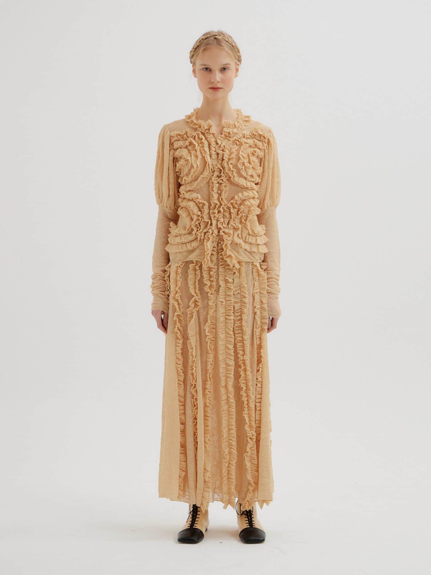 High necklines and lace collars, form-fitted waists, and delicate flounces inspired by Victorian era decorum hints at a restrained romanticism veiled underneath. Signifiers of femininity and prudence of the other era, taken along with details from menswear, composes a modern mystery detached from the blunt world of today.