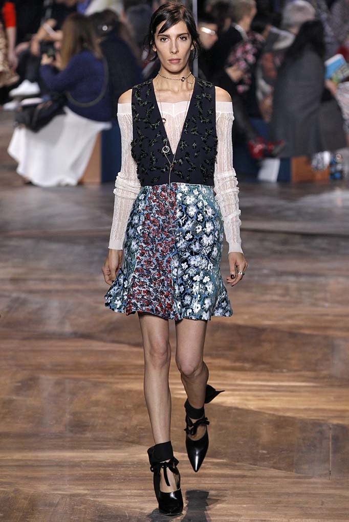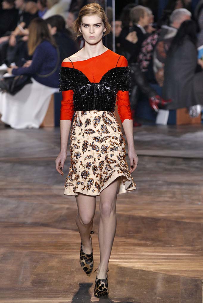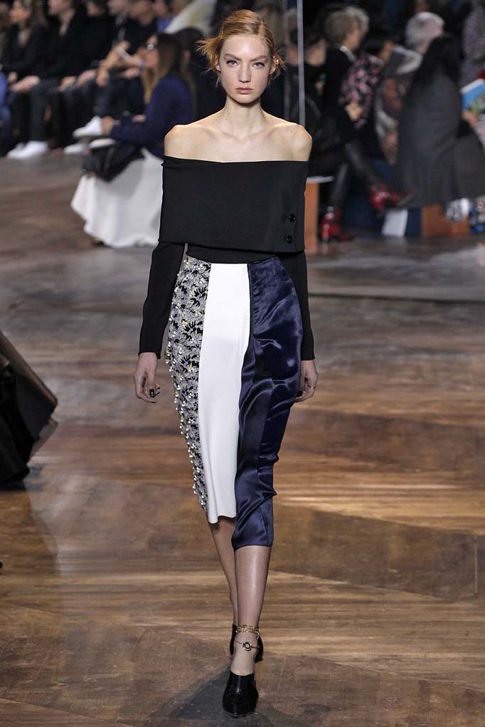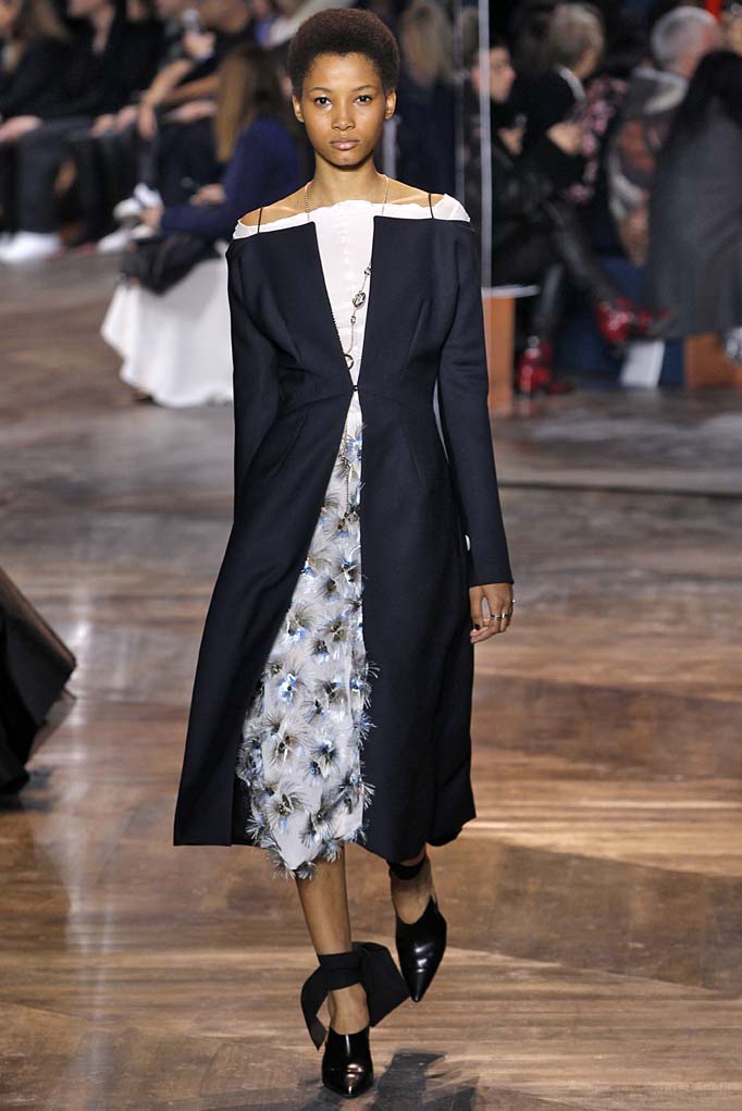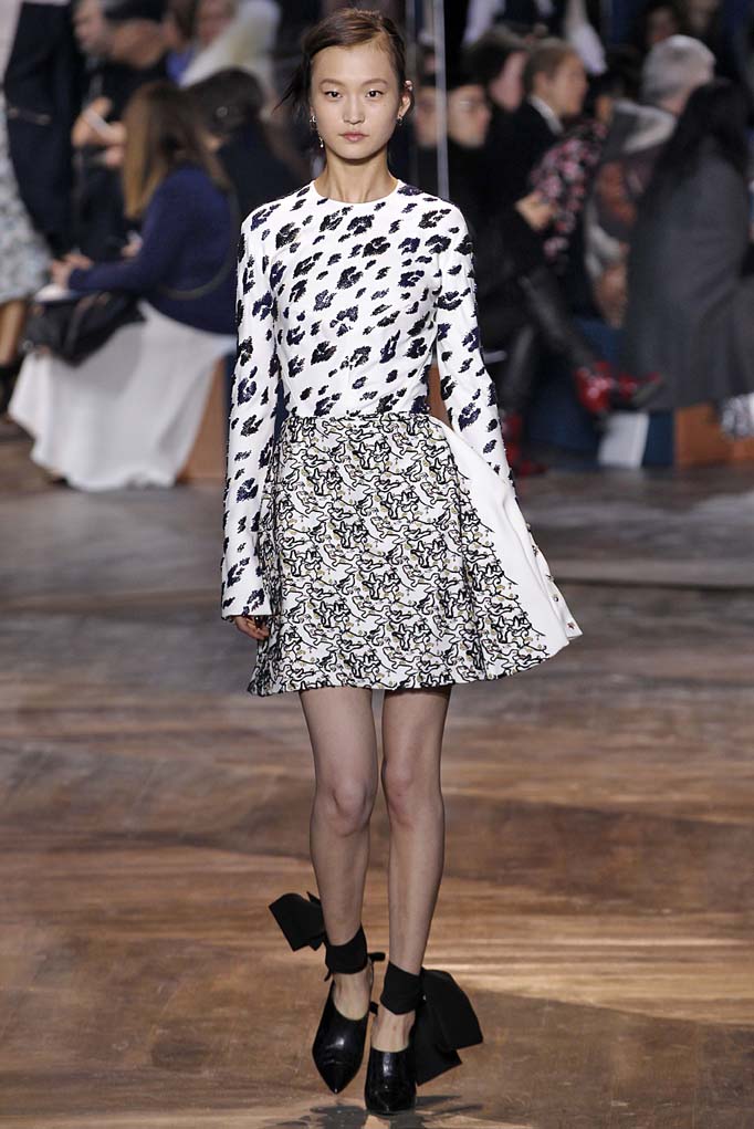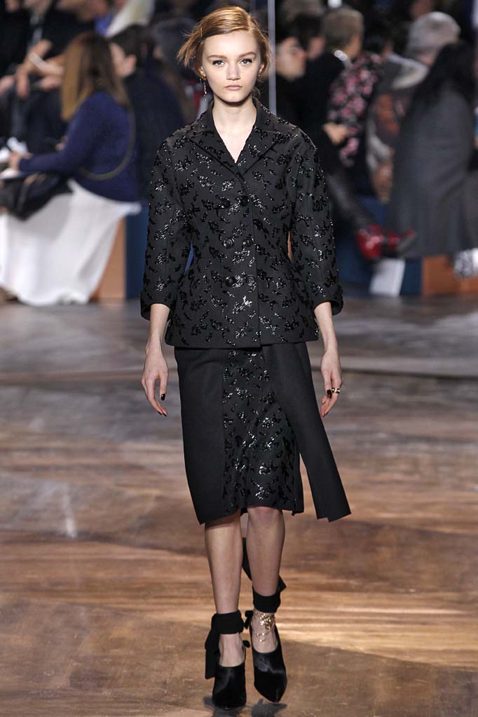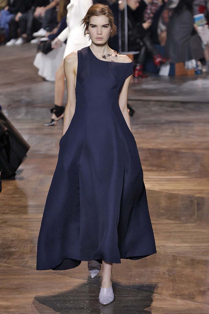 It’s been a fashion whirlwind in terms of who’s left, who’s going where, and so forth, but the show must go on. Ruffieux and Meier carried on many recognizable codes from the Simons era, including asymmetric and geometric necklines, new takes on the Bar jacket, paneled embroideries and familiar color palettes. But somehow, the collection lacked the confidence, discipline, and frankly, fit and wow factor that Simons used to great success. And we’re not sure any woman wants a tuft of cherry-colored ruffles around the hips on an otherwise slinky gown. Ruffieux and Meier are said to also be designing the Fall 2016 ready-to-wear collection. Perhaps by then, they’ll have a better grasp of how to fill the enormous shoes that Simons left behind.