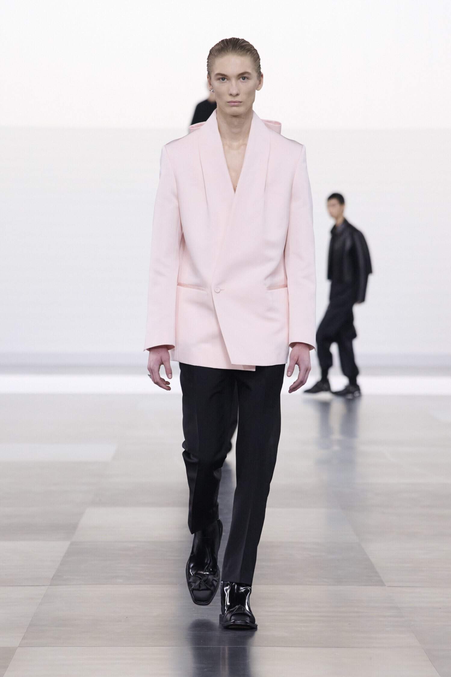 Dior Homme made a splash at Paris Fashion Week Men’s! Creative director Kim Jones showed his latest Dior menswear collection to a starry audience—including Kate Moss, Robert Pattinson, and Gwendoline Christie—near the Seine River. Against a minimalist white interior, Jones’ Fall 2025 offerings were equally quiet in a core palette of black, cream, dark blue, and frosty pink—seen across single-breasted suiting, smoothly draped coats, cozy sweaters, sleek leather totes and satchels, and numerous wide-legged trousers. While monograms were widely absent from the line, “Dior” lettering was seen across coordinating silken blindfolds placed on numerous models. In a similarly subtle nature, accents like rounded buttons and delicate silver charms acted as brand markers, proving the impact of house signatures without logos. However, there was still space for surprises—including textured and shearling-lined jackets, flowing silk tops, and a viral pink kimono-style coat covered with gray florals, silver sequins, and iridescent beading. Bravo!