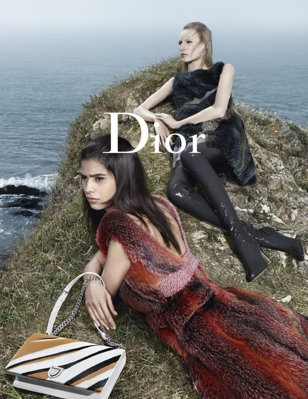Dior launched their Fall 2015 ad campaign, photographed by Willy Vanderperre at a rocky seaside cliff in Christian Dior’s hometown of Granville, France. The campaign stars Julia Nobis, Natalie Westling, and Mica Arganaraz and was styled by Olivier Rizzo with makeup by Peter Phillips. Dior’s second skin thigh-high boots, which have become a sort of signature, are highlighted along with the Diorama bag, paneled skirts, pointed collar blouses, and fully fur dress. We won’t be climbing a rocky seaside cliff in these looks anytime soon, but it sure looks good. J’adore!