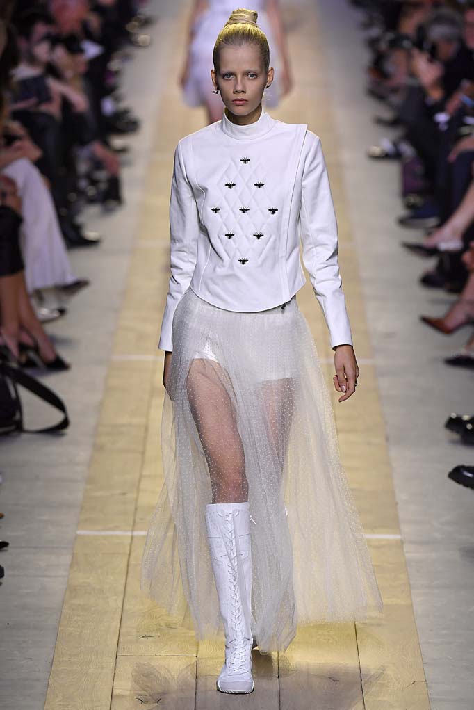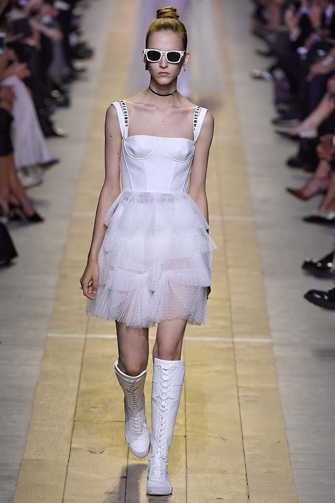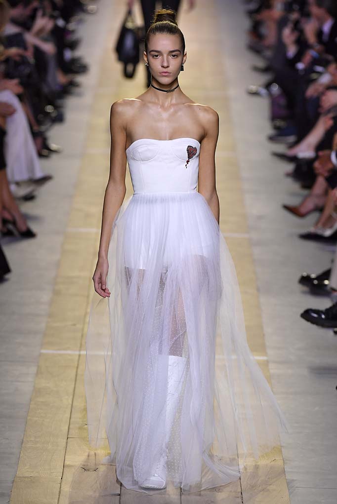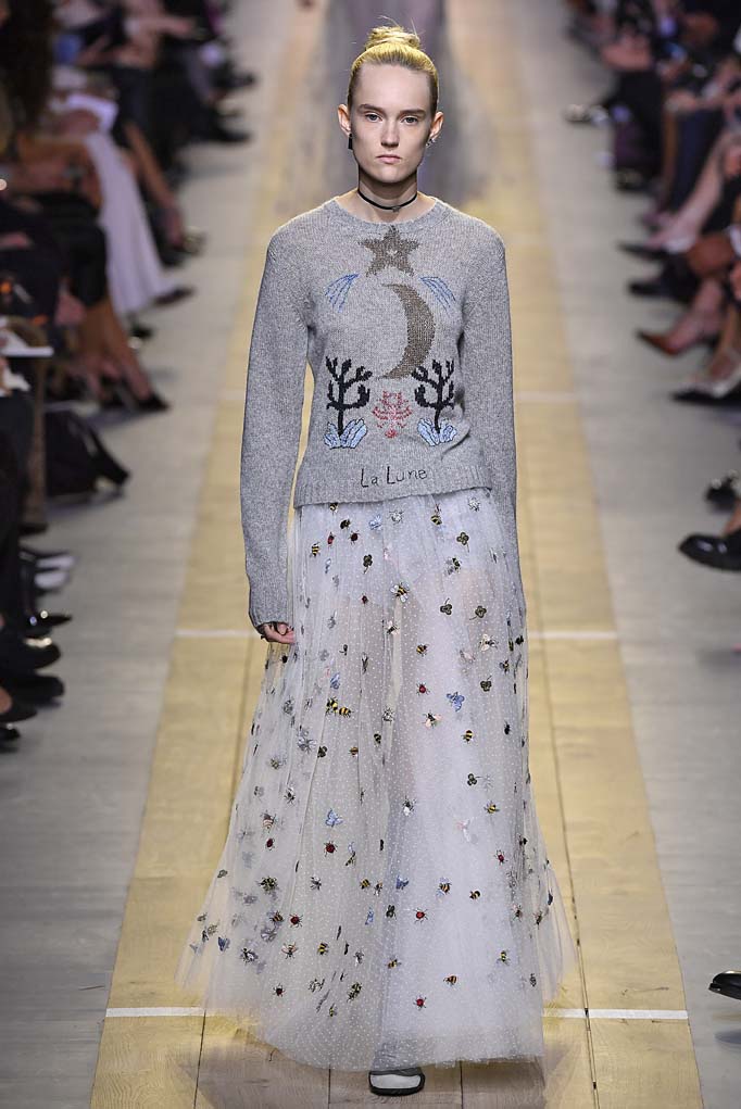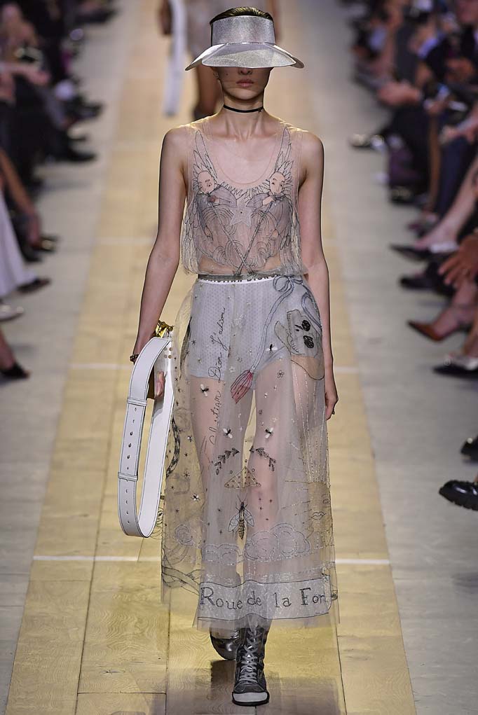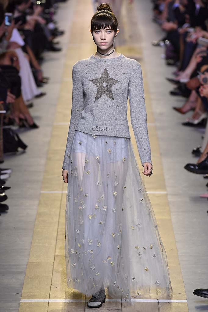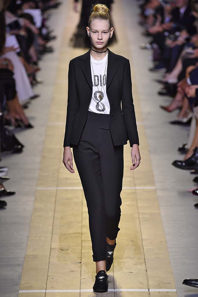 Grazia Chiuri’s battleground is uncharted territory for Dior: millennial outreach, something that Hedi Slimane and Demna Gvasalia have done before her at established Parisian houses. Whether or not it has the glamorous appeal that some traditionalists still long for, it’s increasingly the way of the future. But Grazia Chiuri didn’t completely abandon the wonderful sense of romance and history that she and Pierpaolo Piccioli, who also attended the show, created at Valentino. There were still plenty of of feminine gowns and skirts in ephemeral tulle with delicate embroideries that were a signature at Valentino—here, they were topped off with sweaters, visors, moto and suit jackets, T-shirts, and logoed trimmings on straps and waistlines. Even a tulle lace-collared top came with sporty stripes on the arms and was worn with cut-off jeans and a bandeau crop-top underneath. Pierre Cardin, who 70 years ago was hired as the first assistant to Christian Dior, was perched front row, if that tells you anything about the palpable excitement surrounding Grazia Chiuri’s debut. We wonder what he thought of the new Dio(R)evolution…