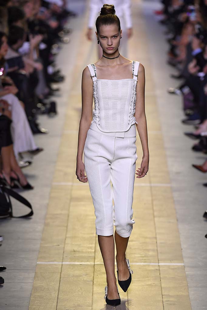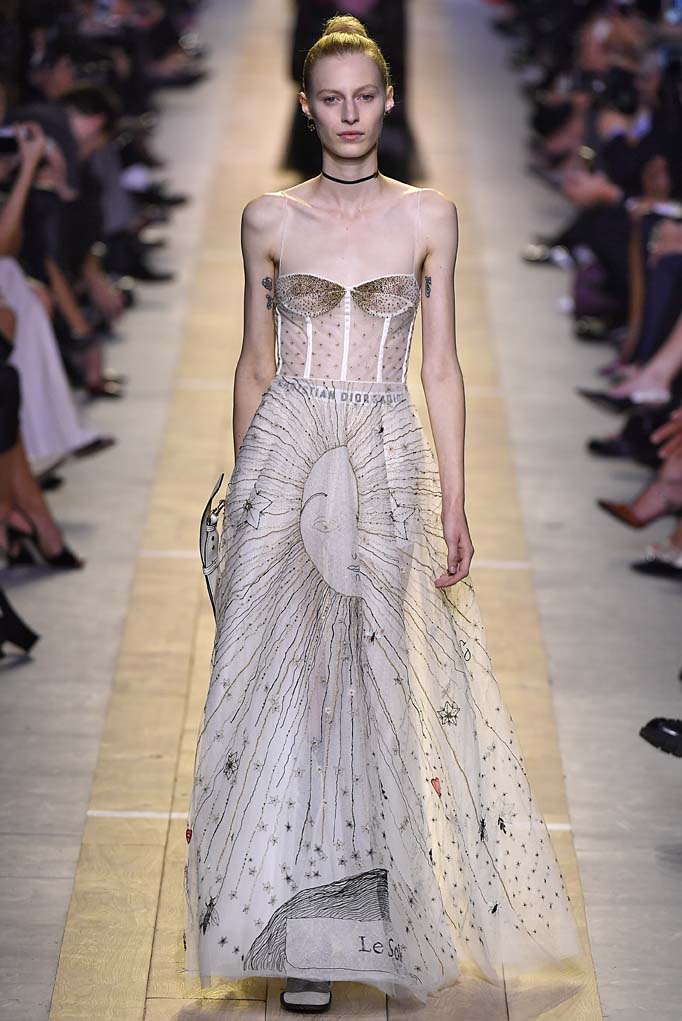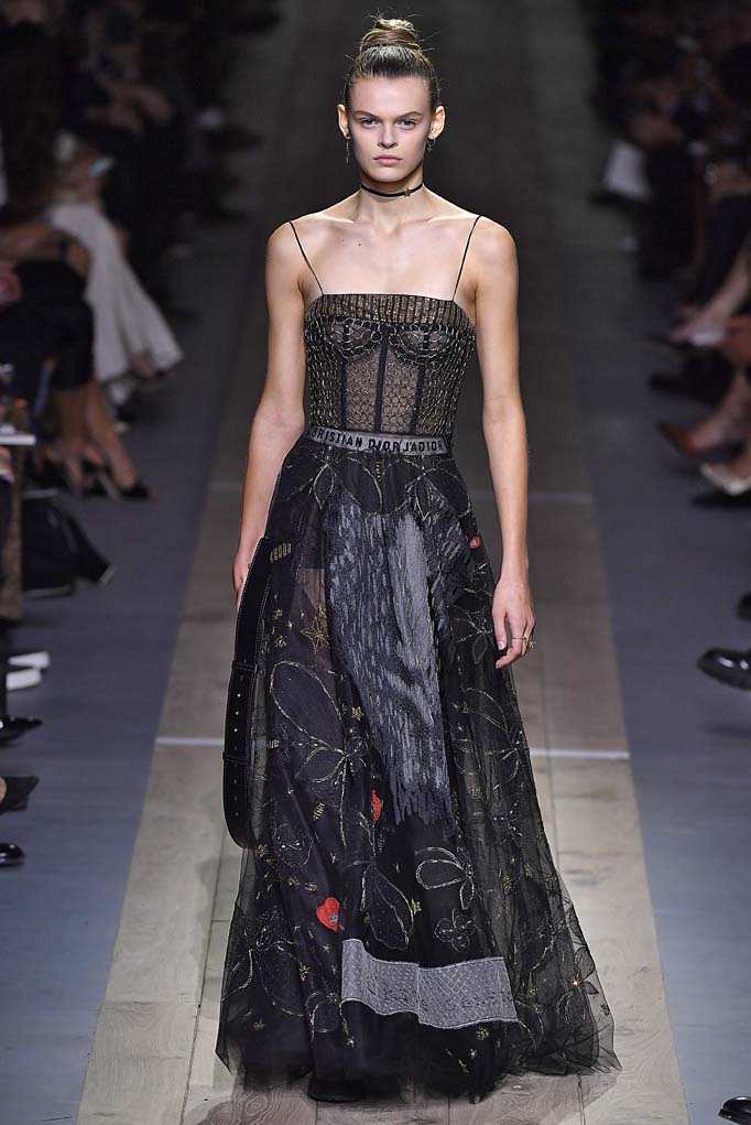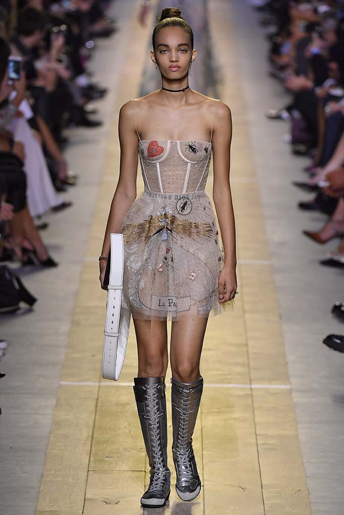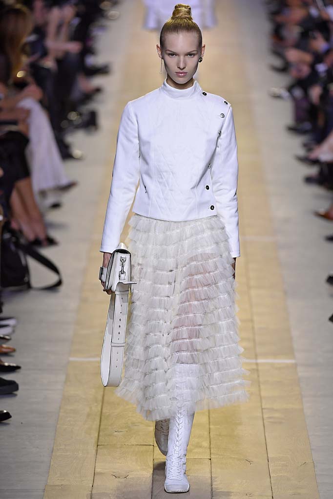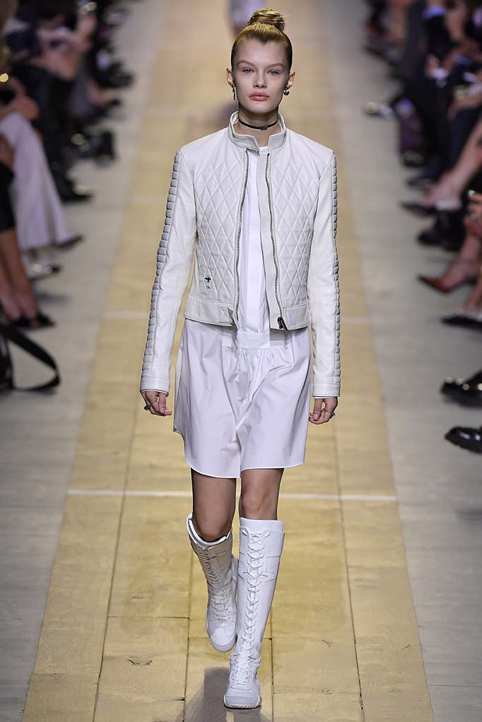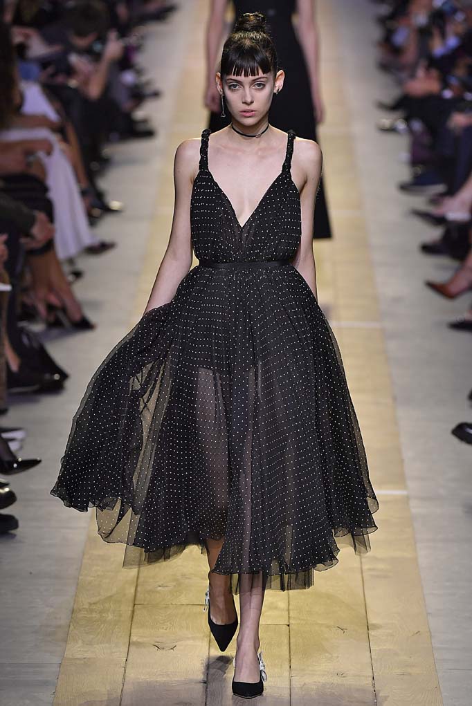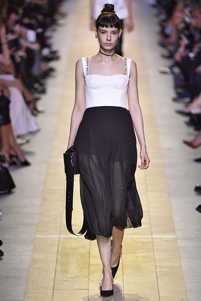 Grazia Chiuri’s battleground is uncharted territory for Dior: millennial outreach, something that Hedi Slimane and Demna Gvasalia have done before her at established Parisian houses. Whether or not it has the glamorous appeal that some traditionalists still long for, it’s increasingly the way of the future. But Grazia Chiuri didn’t completely abandon the wonderful sense of romance and history that she and Pierpaolo Piccioli, who also attended the show, created at Valentino. There were still plenty of of feminine gowns and skirts in ephemeral tulle with delicate embroideries that were a signature at Valentino—here, they were topped off with sweaters, visors, moto and suit jackets, T-shirts, and logoed trimmings on straps and waistlines. Even a tulle lace-collared top came with sporty stripes on the arms and was worn with cut-off jeans and a bandeau crop-top underneath. Pierre Cardin, who 70 years ago was hired as the first assistant to Christian Dior, was perched front row, if that tells you anything about the palpable excitement surrounding Grazia Chiuri’s debut. We wonder what he thought of the new Dio(R)evolution…