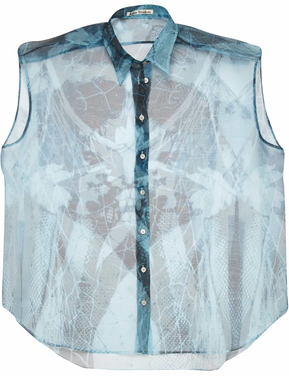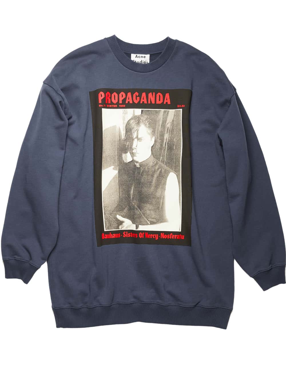 What: Straight-cut blue jeans printed with eerie images, part of an Acne Studios capsule collection featuring images and text from Propaganda magazine.