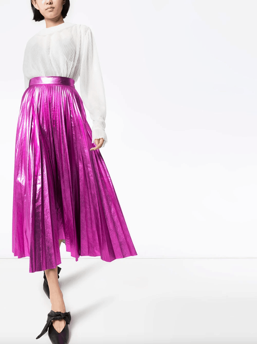 What: A pleated mid-length skirt in metallic magenta by Christopher Kane.