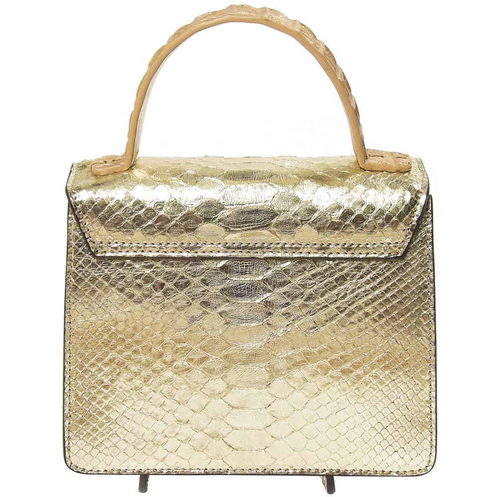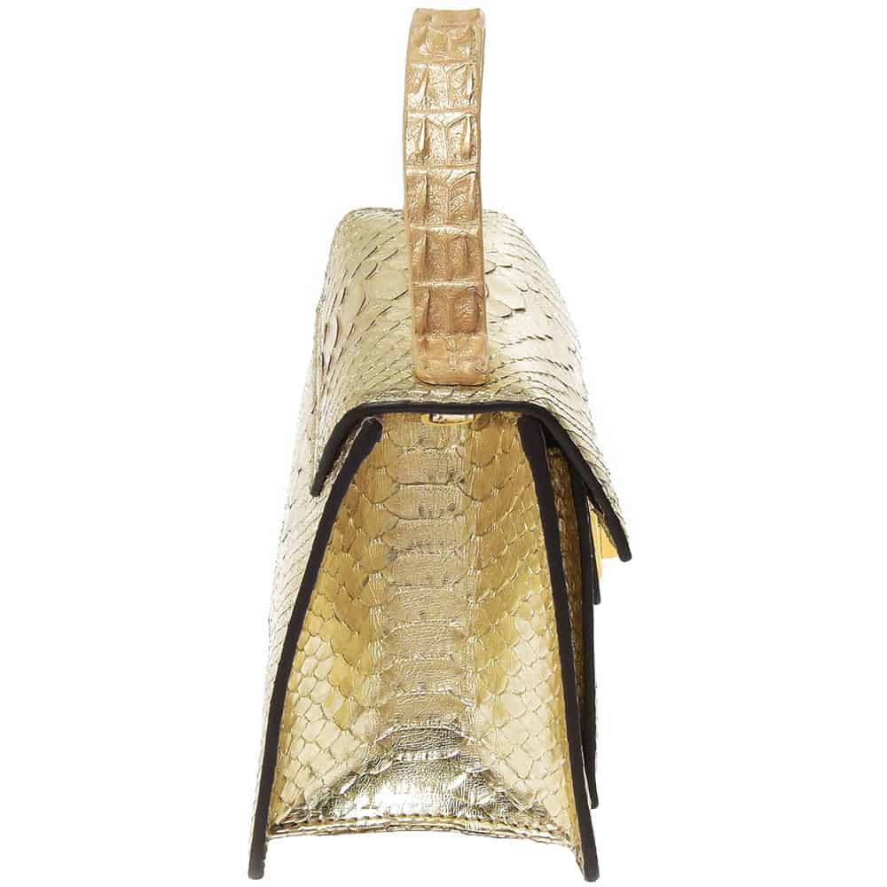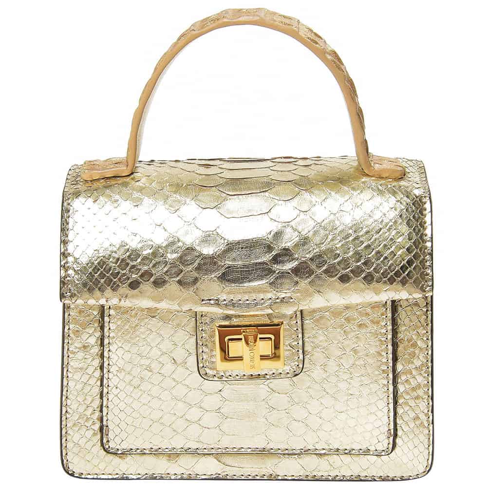 What: A glam combo of genuine python and crocodile in a fun and versatile metallic gold. The bag measures seven inches long by nine inches high by four inches deep and features the brand’s signature low-profile golden clasp.