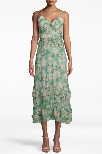 What: A floral printed silk midi dress tiered with delicate ruffles. It comes fully lined and features adjustable spaghetti straps and a back zip closure.
