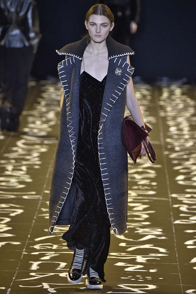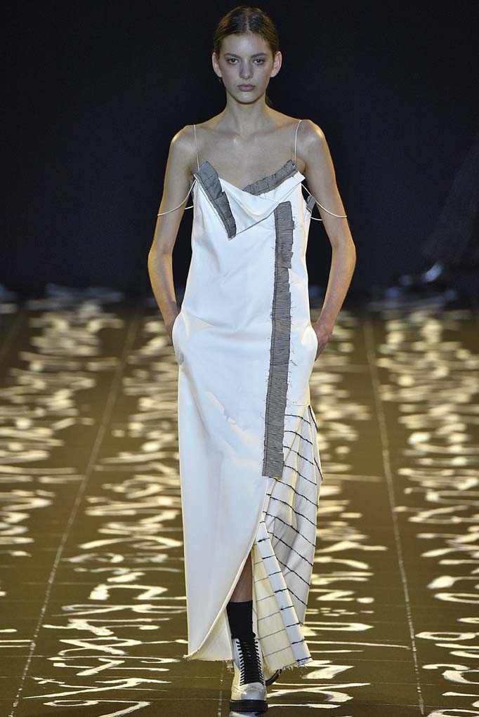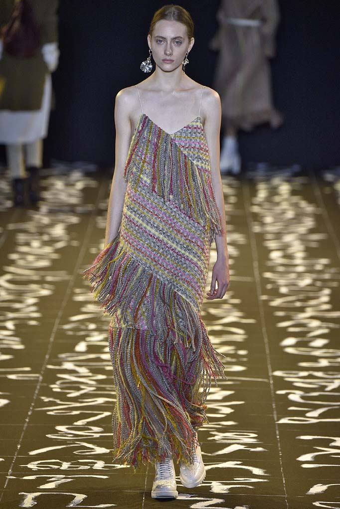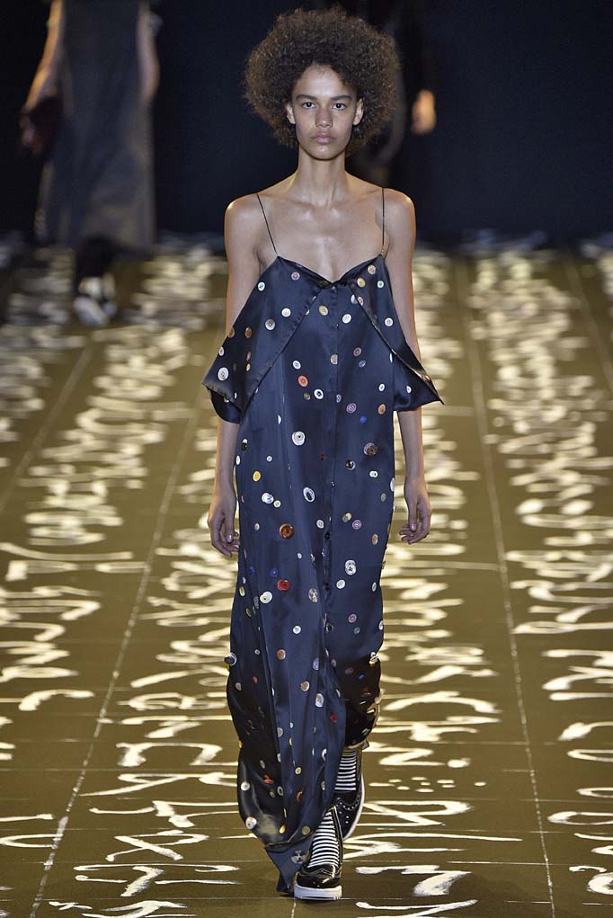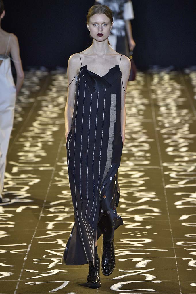 Danielle Sherman’s designs for Edun took a fresh, feminine take this season, perhaps partly due to the newness that comes with motherhood (she showed off her 7-week-old daughter on the runway after presenting her fall ’16 collection). She took cues from photographer Sharon Beal’s images of bird nests, introducing feminine dresses and separates, which she constructed from bits and pieces of contrasting materials—velour, satin, leather, denim, tweed, you name it—that meshed in just the right ways.