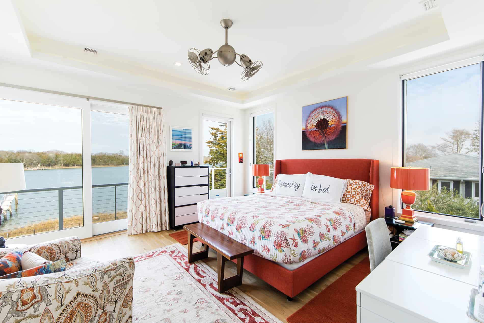 It’s 3,300 square feet, with five bedrooms and four baths over two levels of living space, plus a bonus third level featuring panoramic views, an outdoor lounge, and a firepit. The backyard is set amid sand, providing a private-beach vibe and equipped with saltwater pool, poolhouse, and private dock overlooking the Sag Harbor Cove.