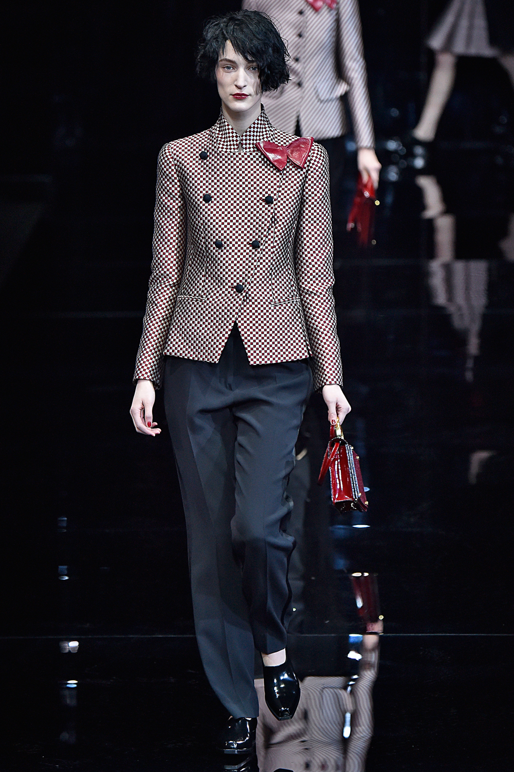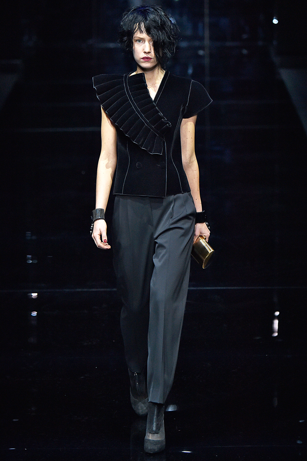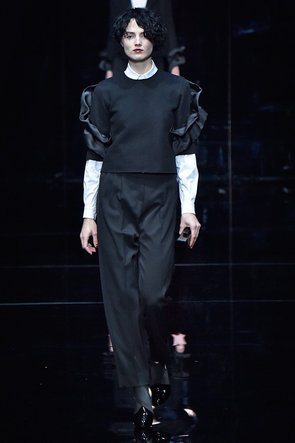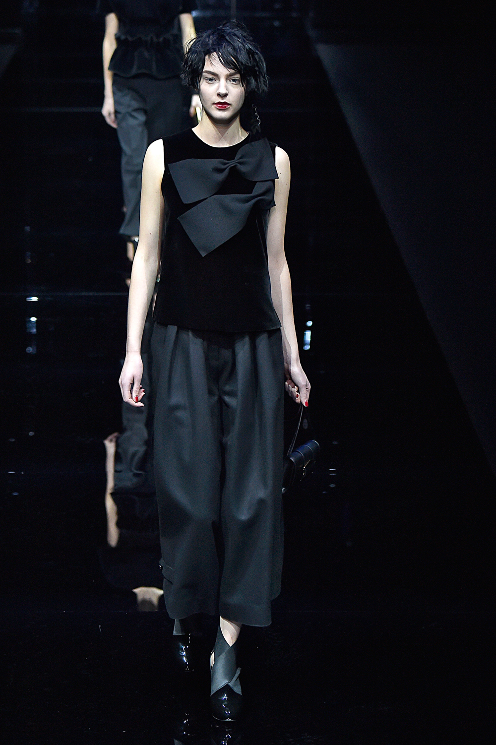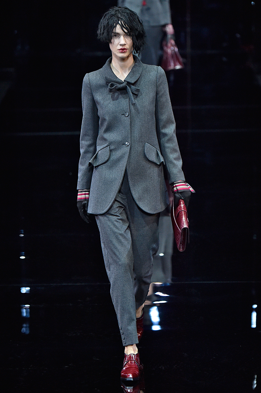 Giorgio Armani‘s Fall collection for his Emporio Armani line, entitled “Crossing Colors,” involved lots of interestingly-cut black trou, large ruffles and bows, cool-hued tweeds and knits that opened the show, followed by a couple of bright fur-tinged pieces, fuzzy rouge knit dresses, and dark velvets. There’s plenty to pick from in the office-apropos department here, thanks to the collection’s array of jackets and slightly slouchy yet tailored pants. Check out the full collection below.