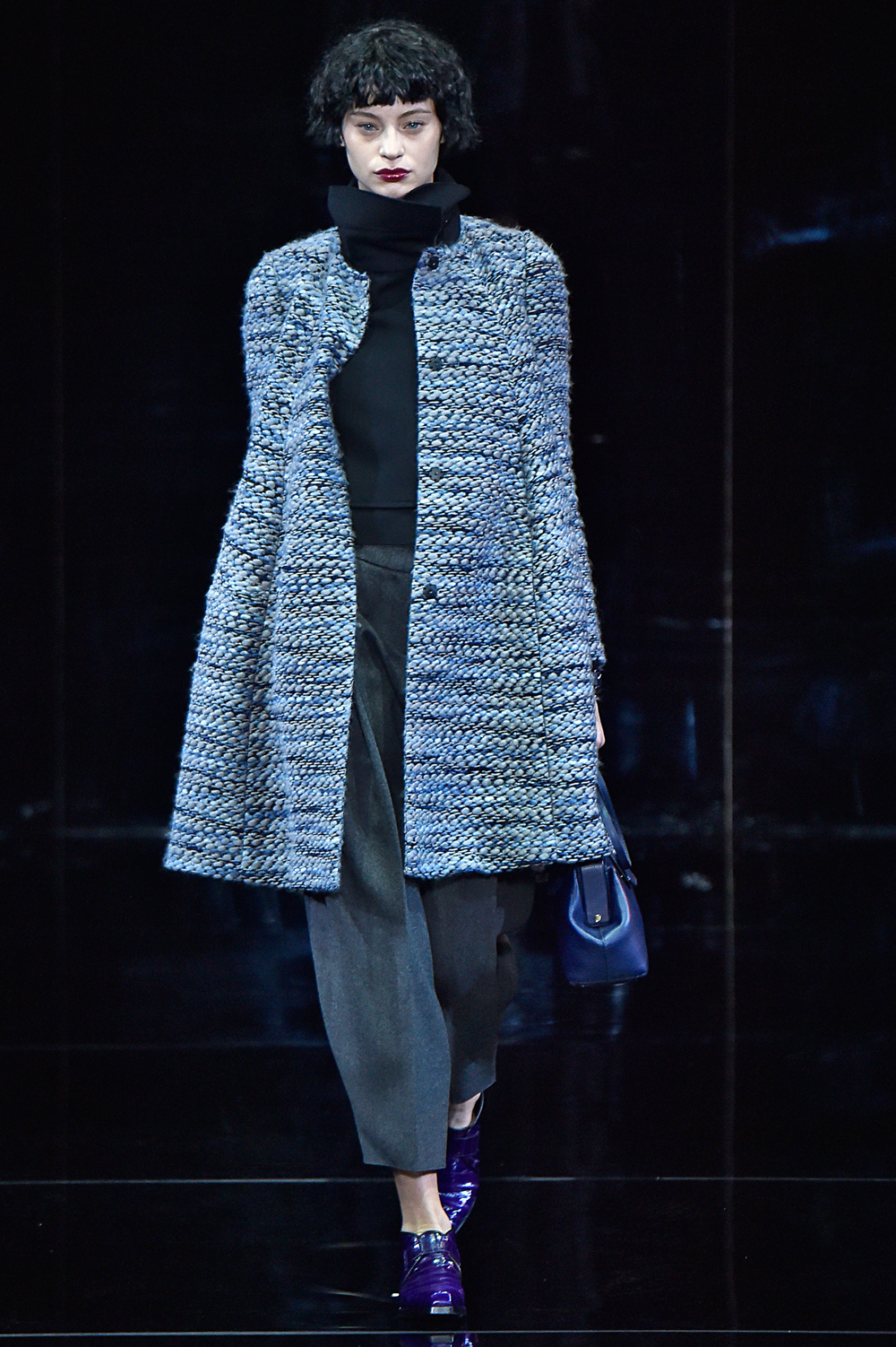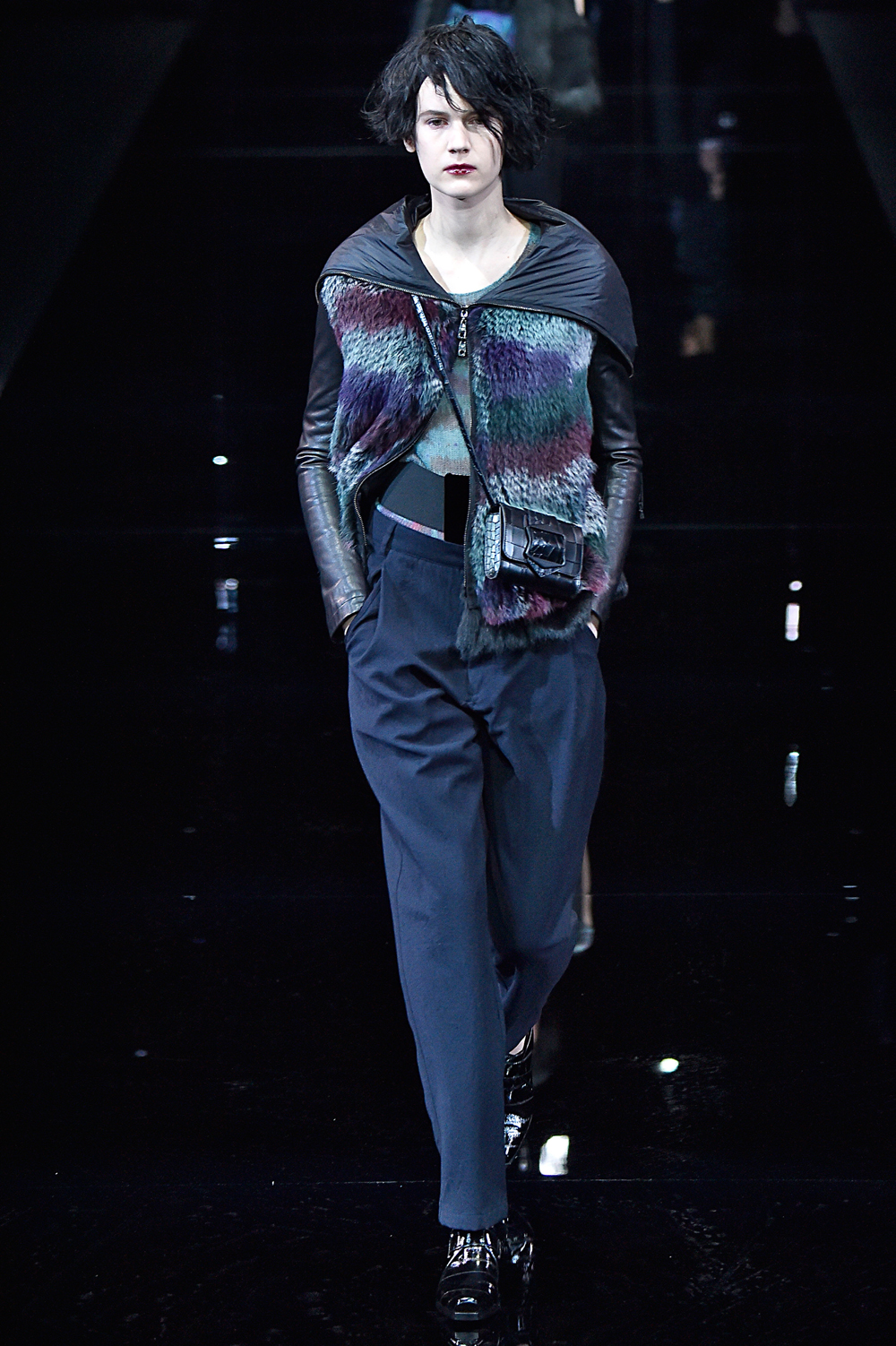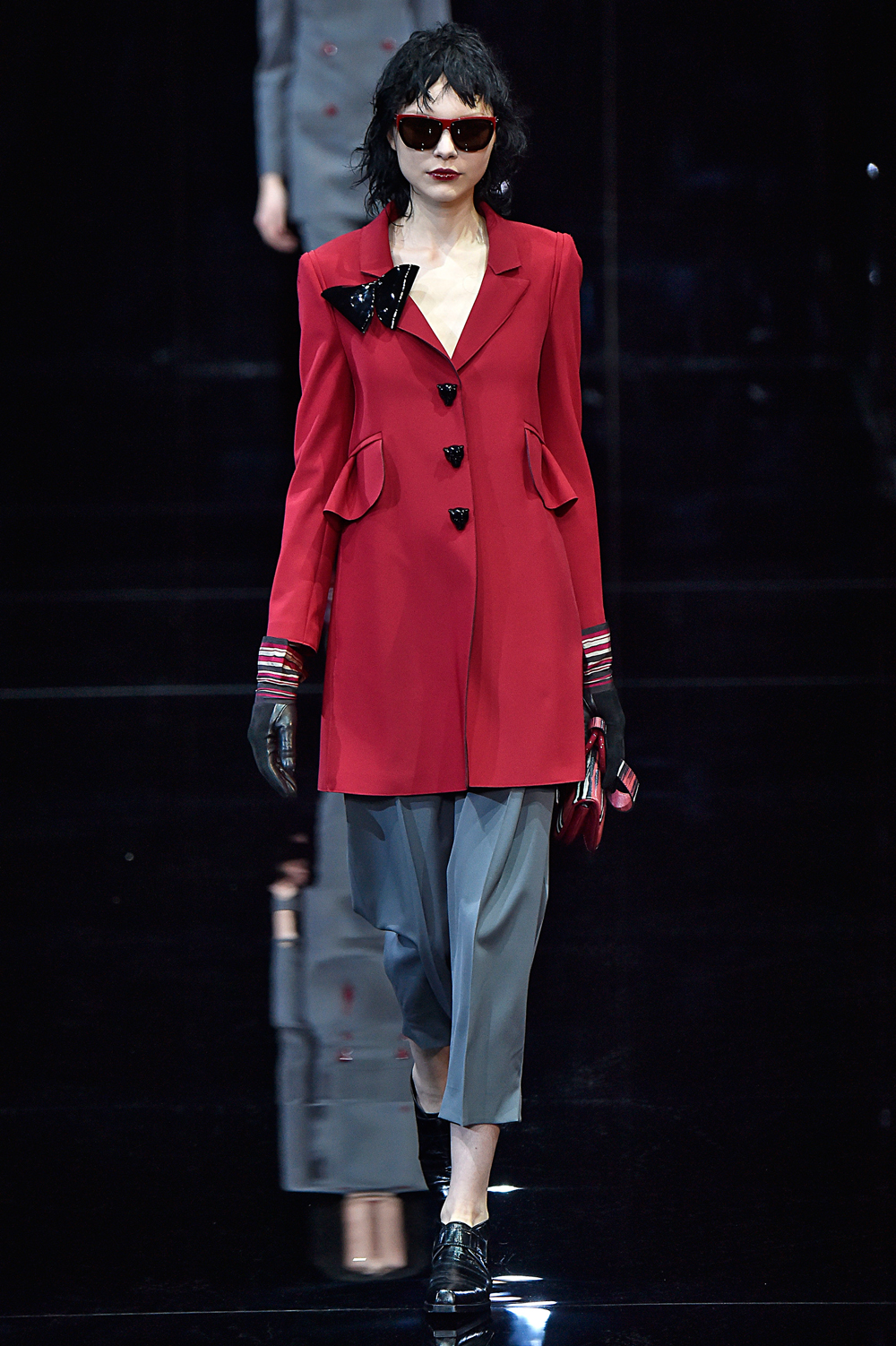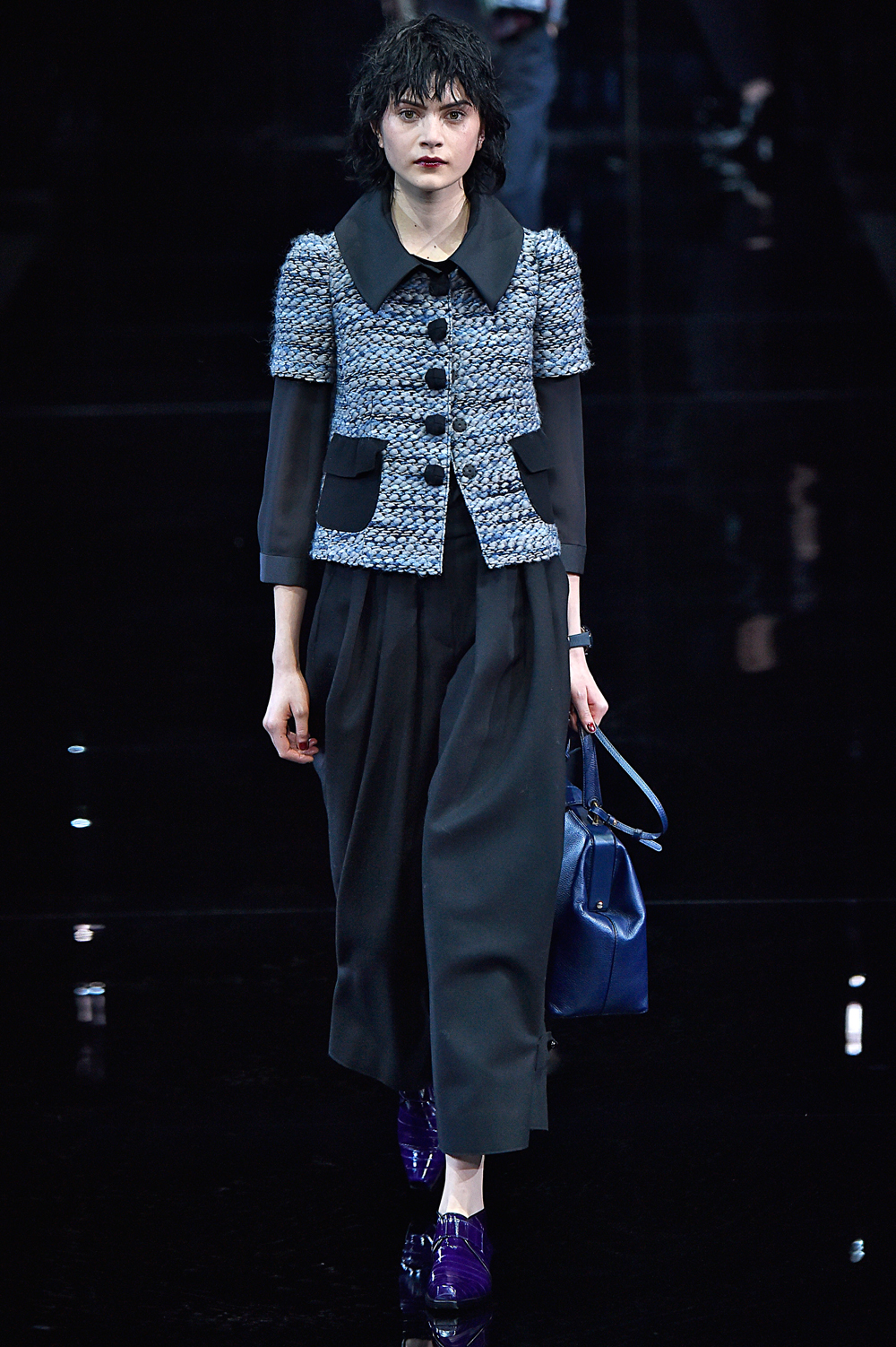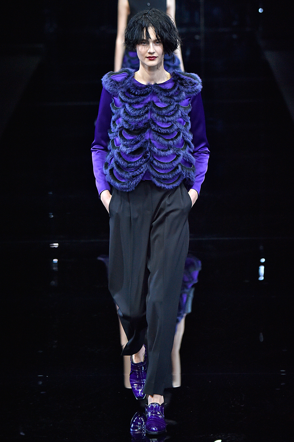 Giorgio Armani‘s Fall collection for his Emporio Armani line, entitled “Crossing Colors,” involved lots of interestingly-cut black trou, large ruffles and bows, cool-hued tweeds and knits that opened the show, followed by a couple of bright fur-tinged pieces, fuzzy rouge knit dresses, and dark velvets. There’s plenty to pick from in the office-apropos department here, thanks to the collection’s array of jackets and slightly slouchy yet tailored pants. Check out the full collection below.
