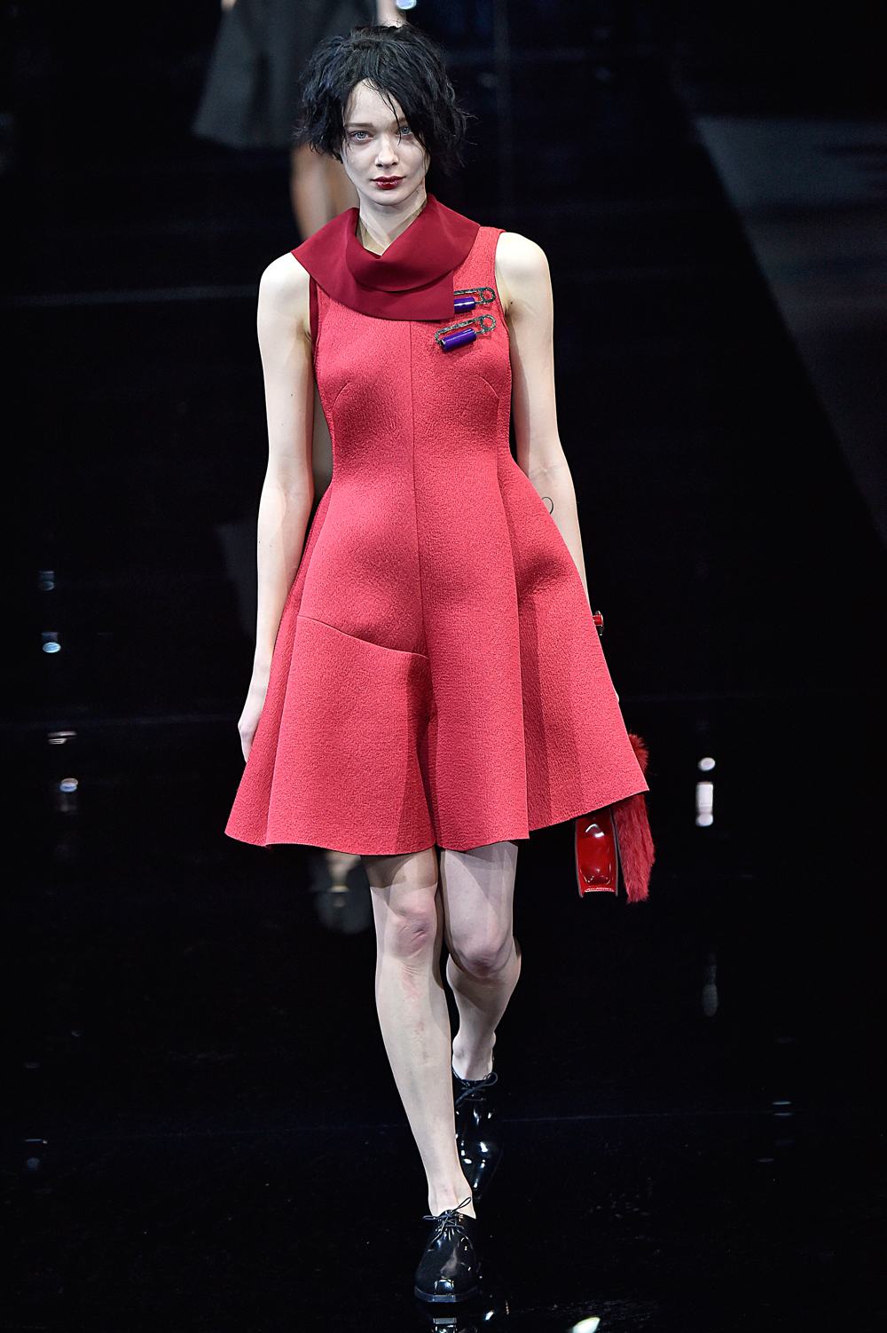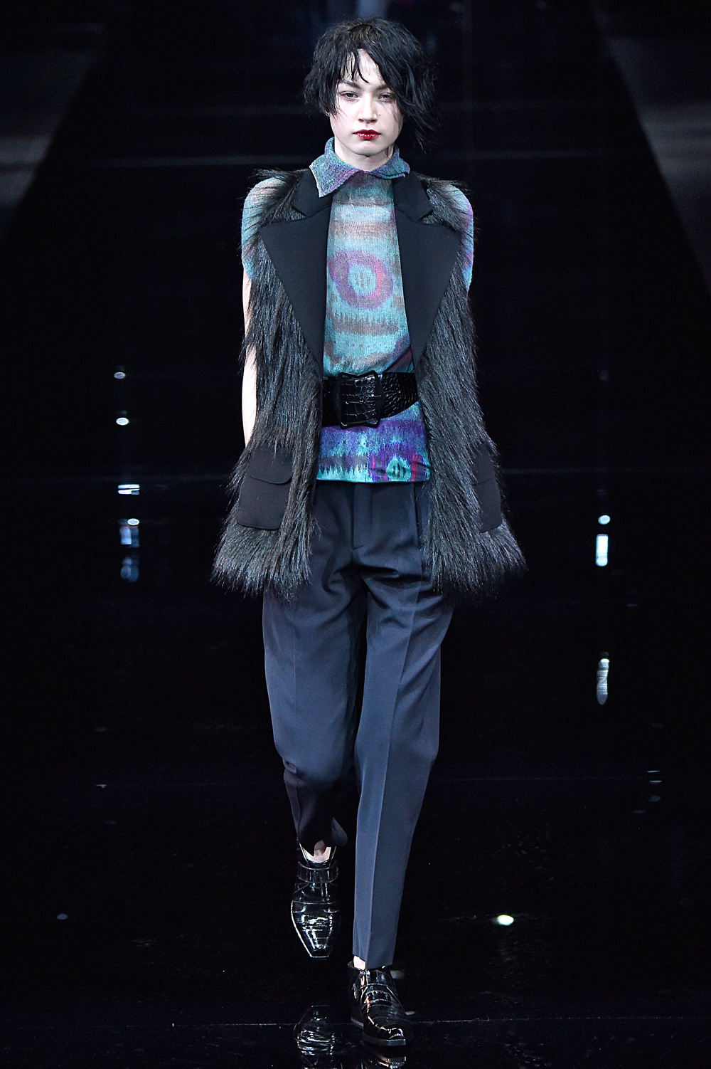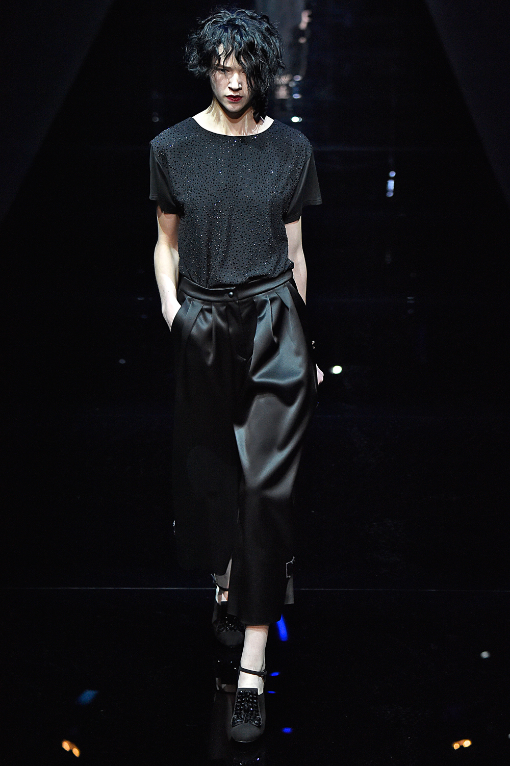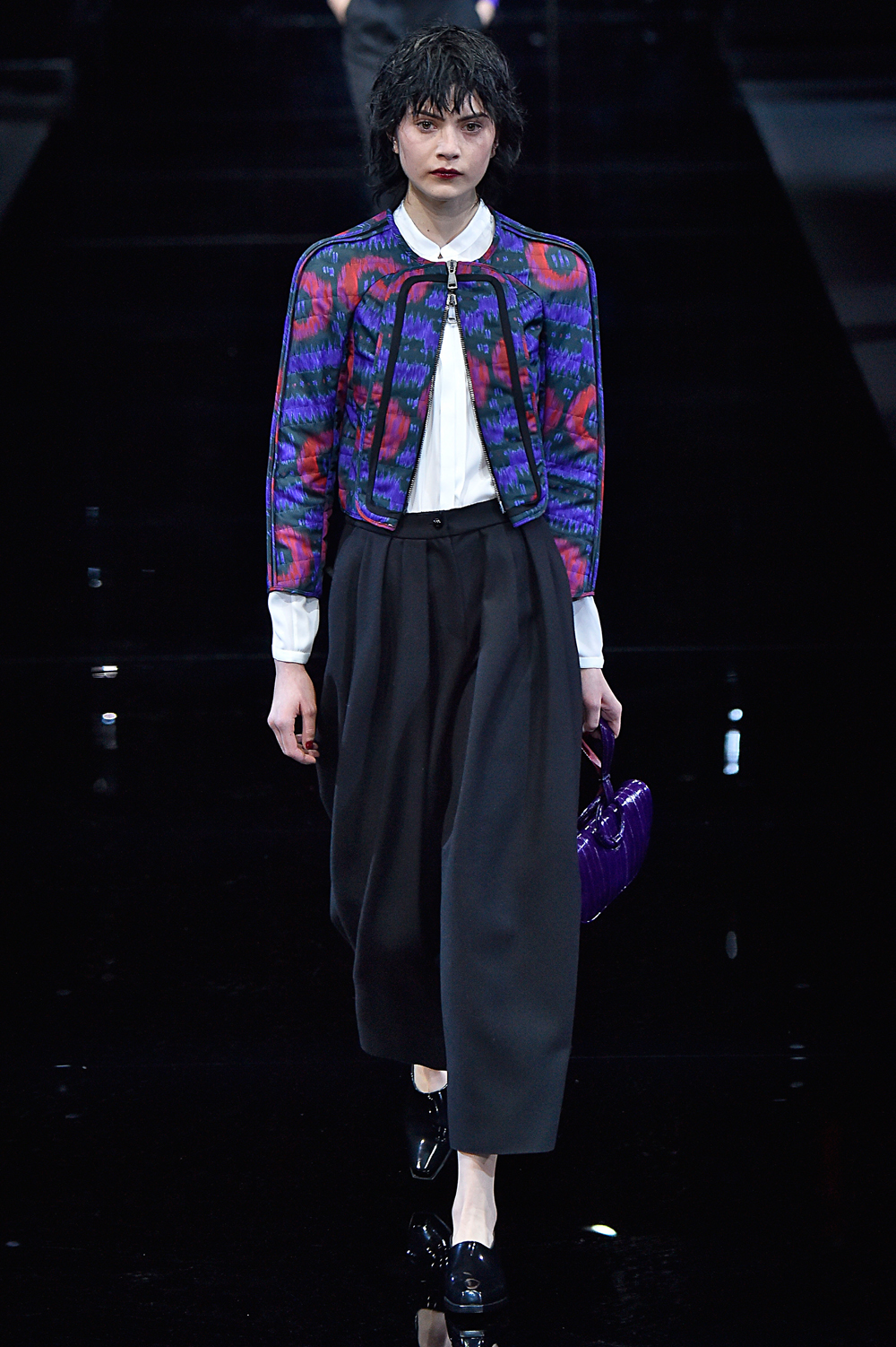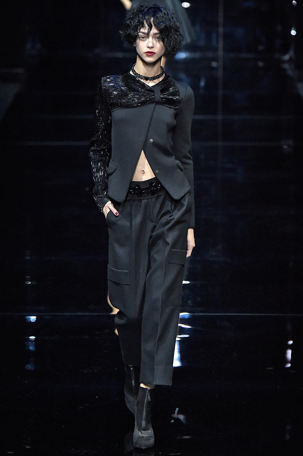Giorgio Armani‘s Fall collection for his Emporio Armani line, entitled “Crossing Colors,” involved lots of interestingly-cut black trou, large ruffles and bows, cool-hued tweeds and knits that opened the show, followed by a couple of bright fur-tinged pieces, fuzzy rouge knit dresses, and dark velvets. There’s plenty to pick from in the office-apropos department here, thanks to the collection’s array of jackets and slightly slouchy yet tailored pants. Check out the full collection below.