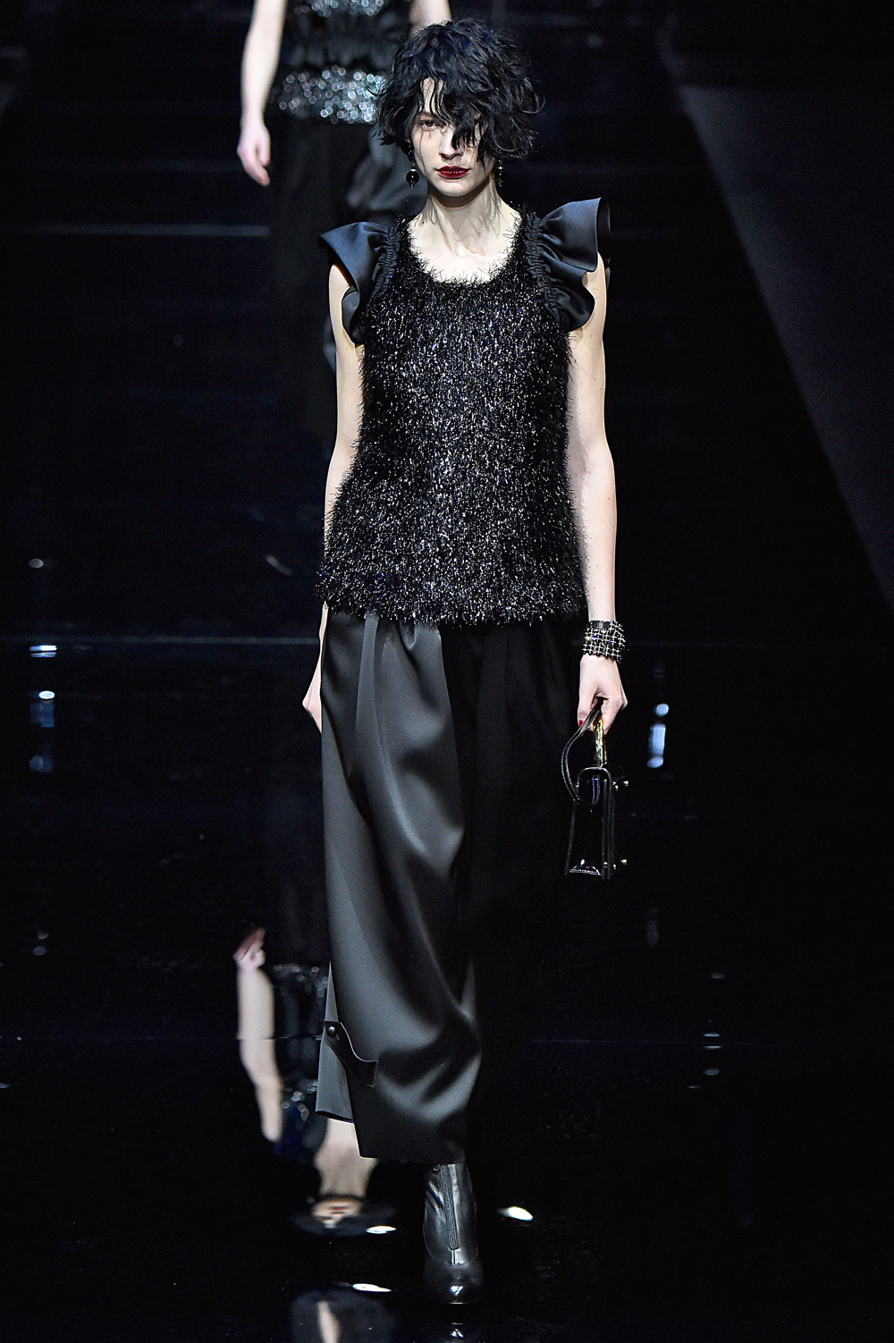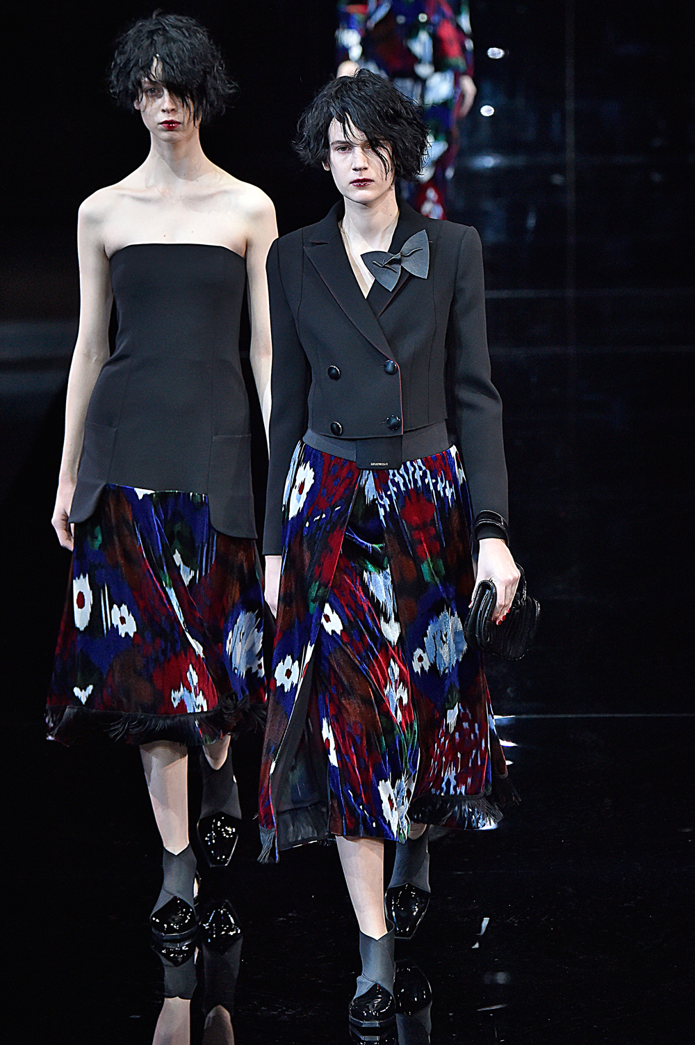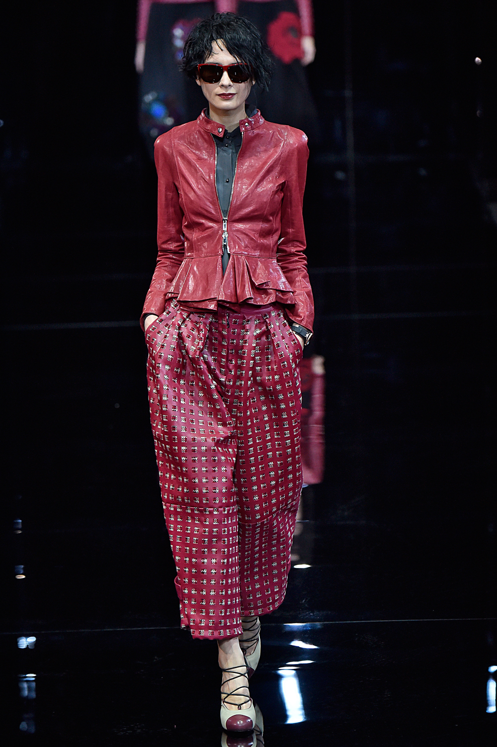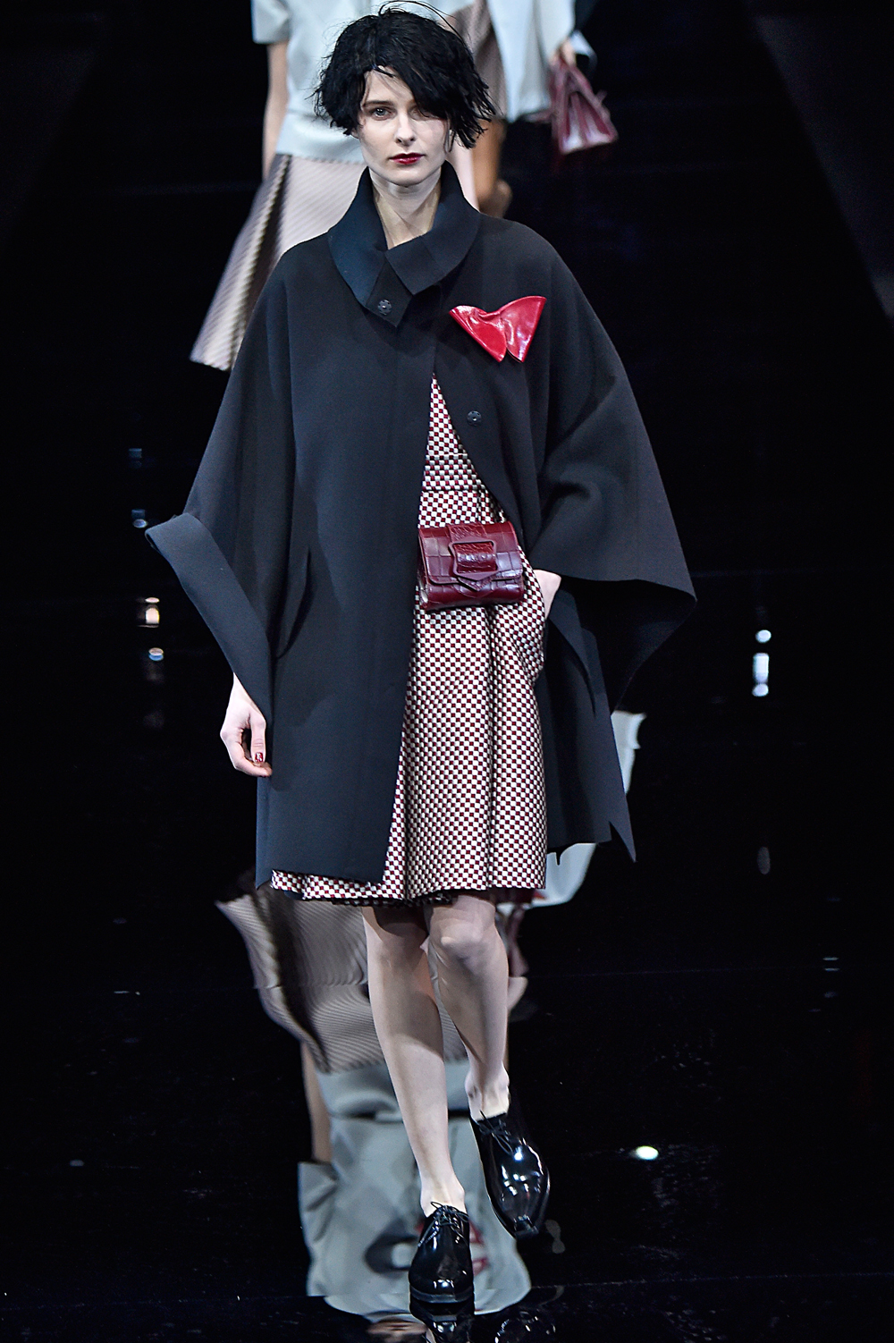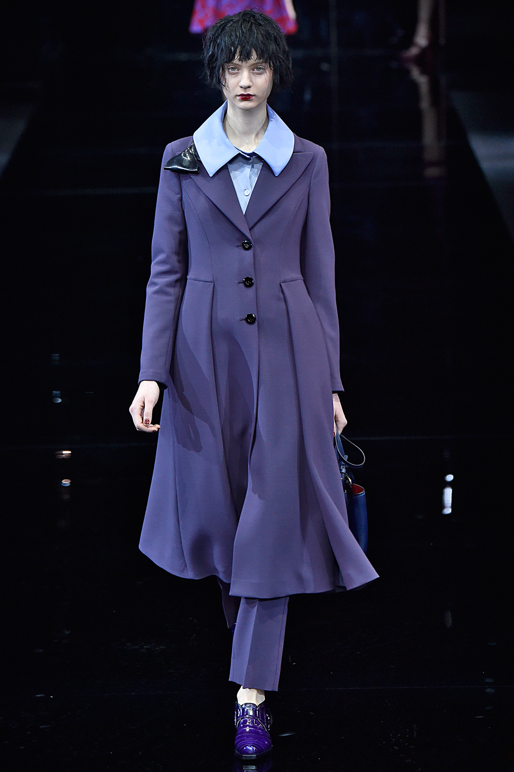Giorgio Armani‘s Fall collection for his Emporio Armani line, entitled “Crossing Colors,” involved lots of interestingly-cut black trou, large ruffles and bows, cool-hued tweeds and knits that opened the show, followed by a couple of bright fur-tinged pieces, fuzzy rouge knit dresses, and dark velvets. There’s plenty to pick from in the office-apropos department here, thanks to the collection’s array of jackets and slightly slouchy yet tailored pants. Check out the full collection below.