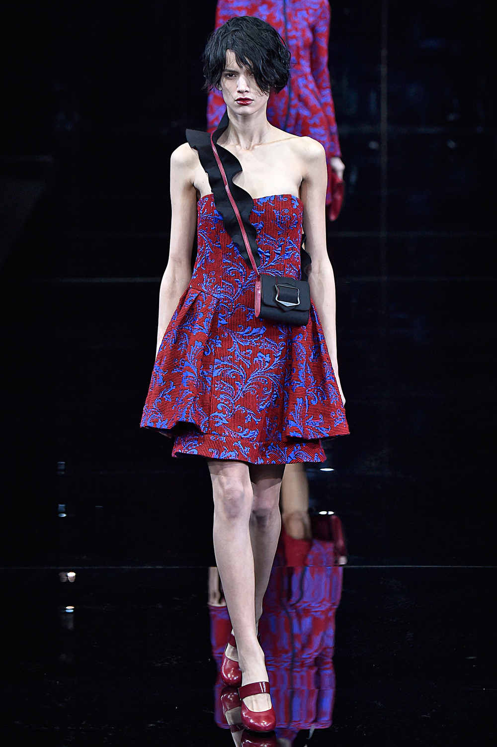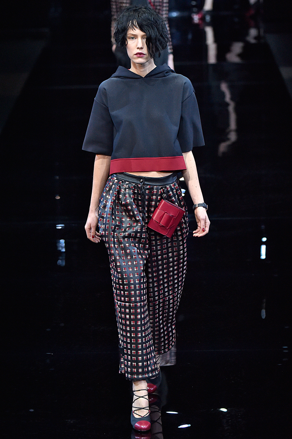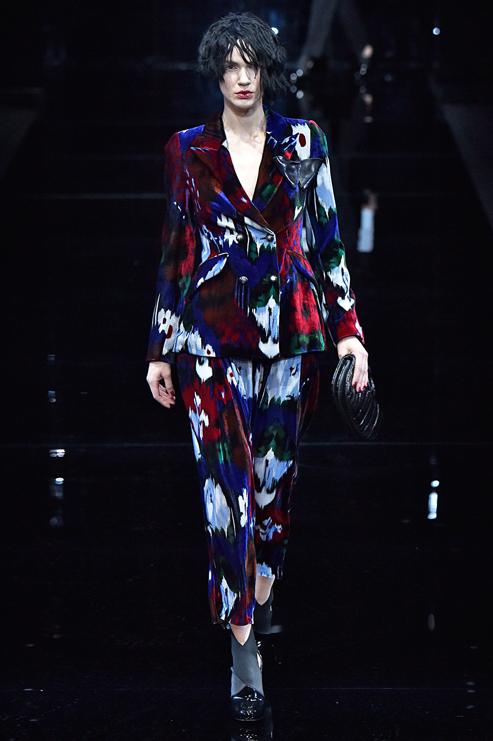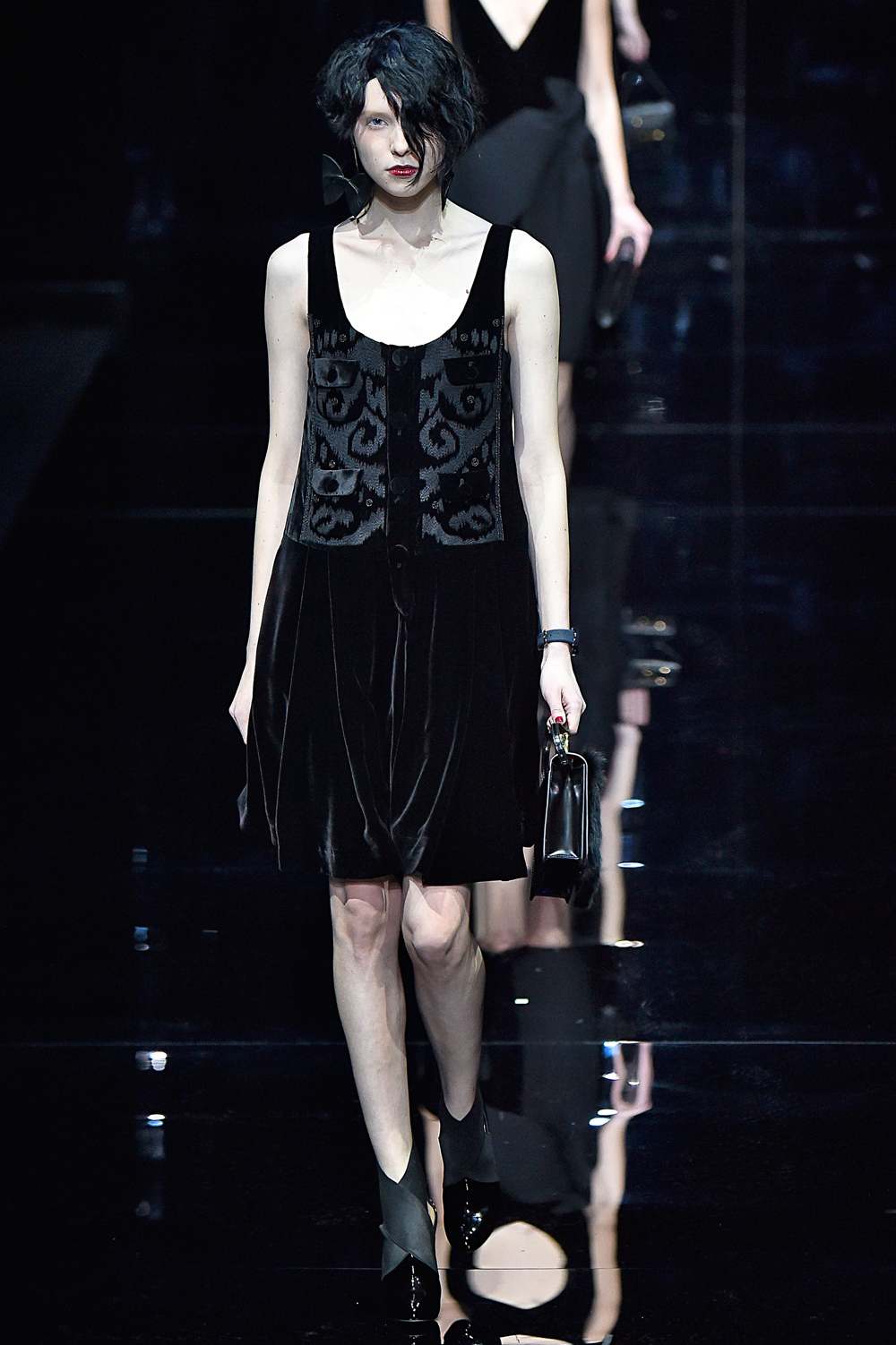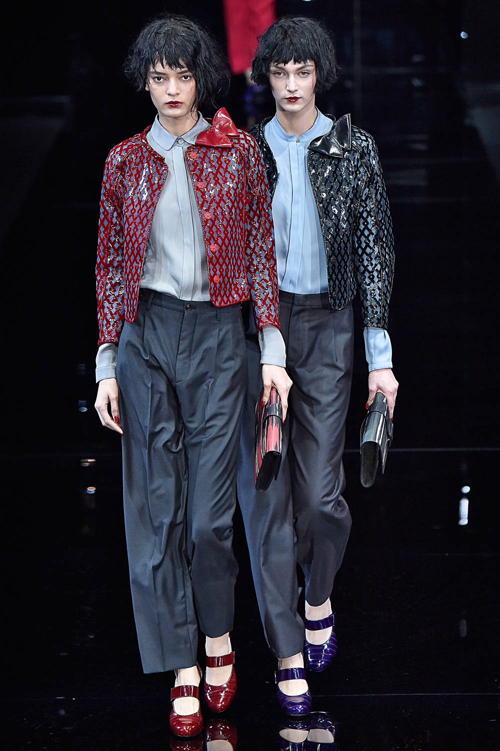 Giorgio Armani‘s Fall collection for his Emporio Armani line, entitled “Crossing Colors,” involved lots of interestingly-cut black trou, large ruffles and bows, cool-hued tweeds and knits that opened the show, followed by a couple of bright fur-tinged pieces, fuzzy rouge knit dresses, and dark velvets. There’s plenty to pick from in the office-apropos department here, thanks to the collection’s array of jackets and slightly slouchy yet tailored pants. Check out the full collection below.
