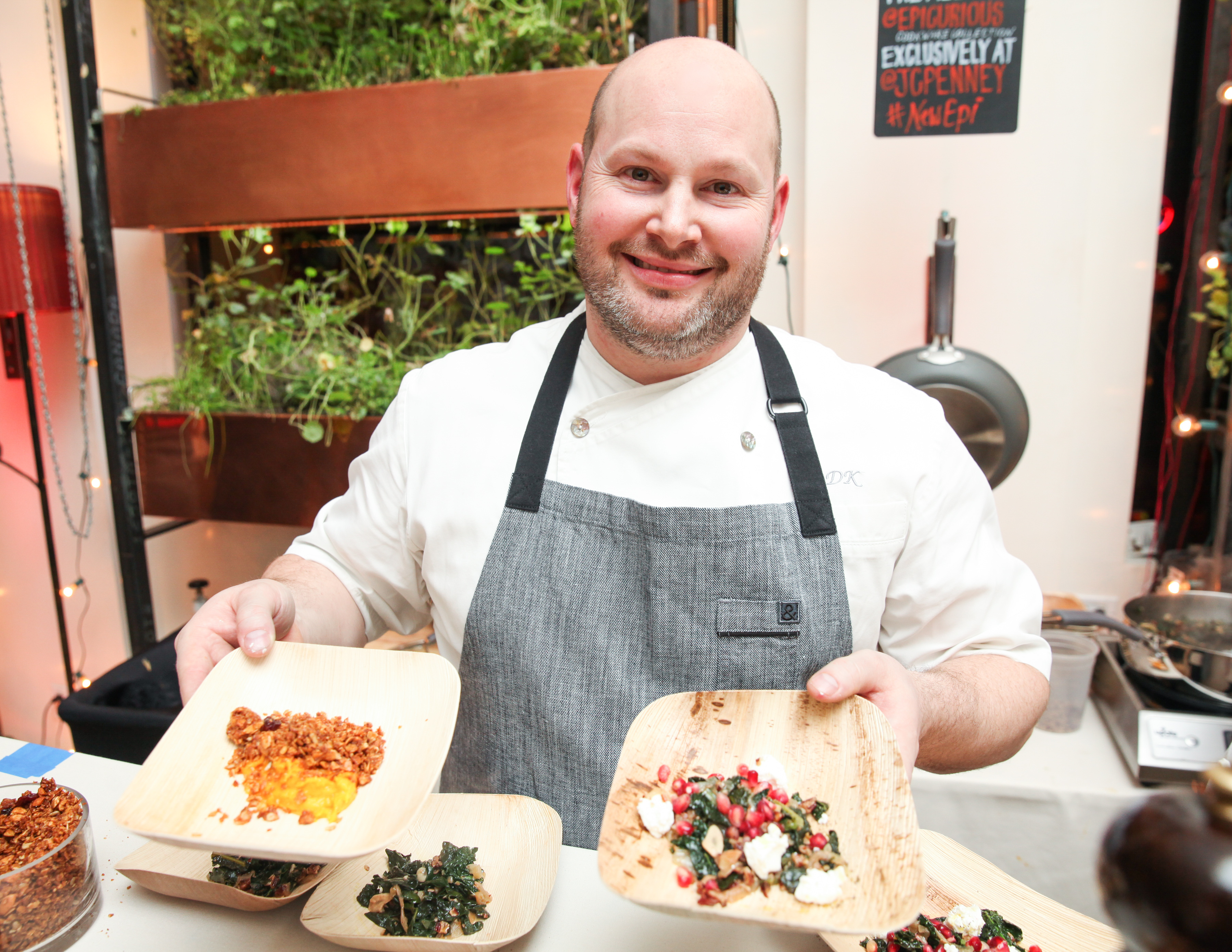 How do the folks at Epicurious toast a sleek relaunch, besides a shiny new hashtag, #NewEpi? With some tasty morsels and lots of foodie and tech folks at Bouley Botanical in Tribeca. Dan Kluger, formerly of ABC Kitchen, was whipping up butternut squash with granola and kale with pomegranate seeds and goat cheese in one corner, while snacks making the rounds included bite-sized bits of quick-marinated skirt steak, roasted hot honey shrimp, and pretzel-crusted chicken. Between nibbles of sliders (which were gone in, oh, 2.6 seconds whenever a new tray hit the floor; more on those below) and sips of the eve’s Mezcal-spiked tipple, called the Smokey Robinson, things went to pot. Literally, not figuratively: Epicurious’ first-ever line of goods, a series of pots and pans sold at JCPenney, were strewn throughout the space. Partygoers who’d ventured out into the frigid weather sans gloves were in luck, as there were Epi-emblazoned pairs being doled out upon bidding adieu. We hear Epicurious’ traffic went up 45 percent yesterday; if that’s any indication of what’s to come for the site, that’s a good sign, non?