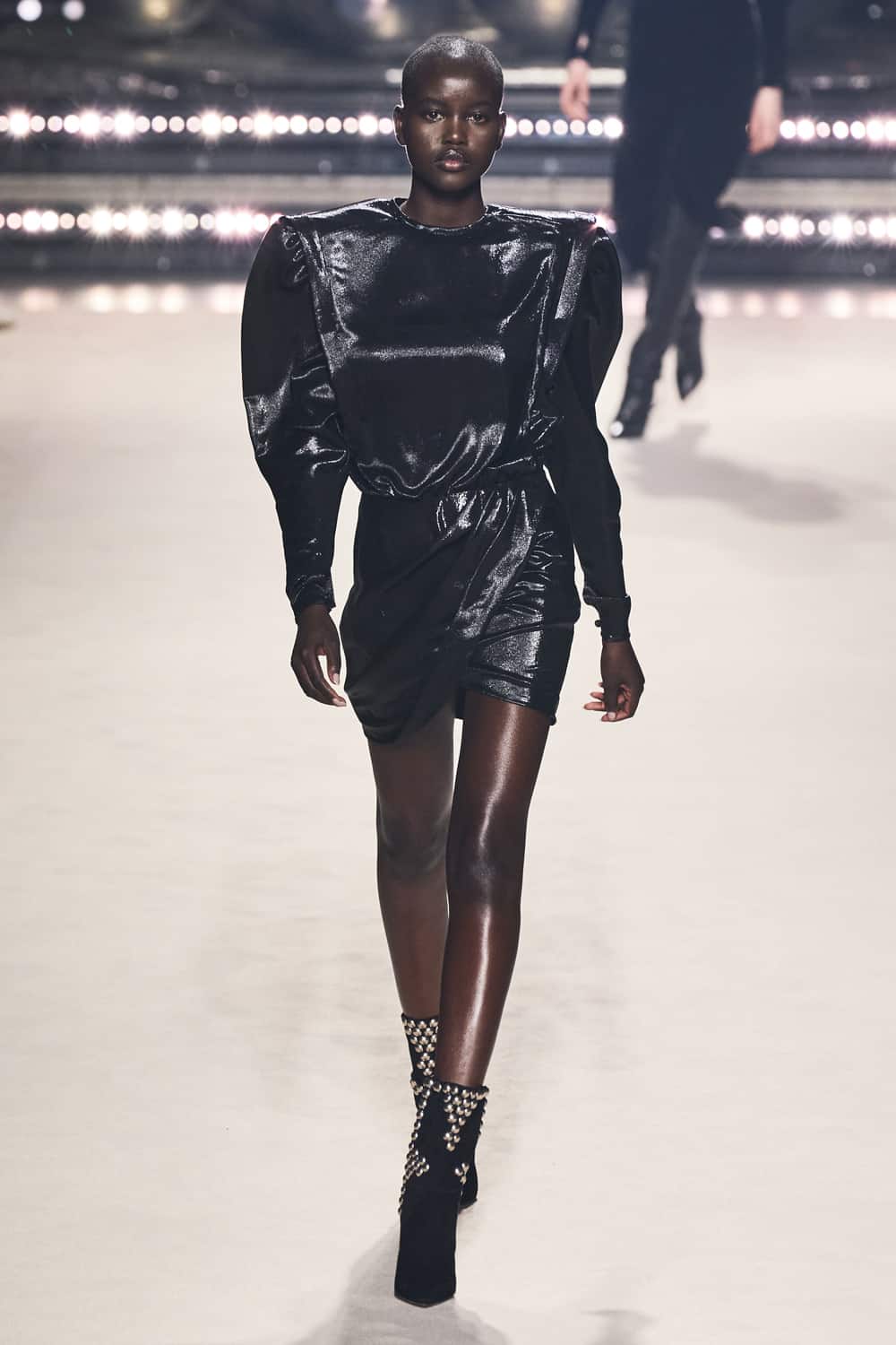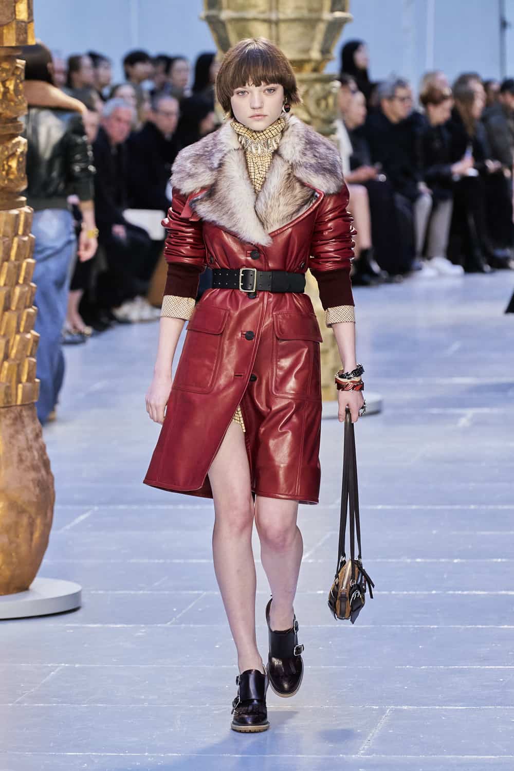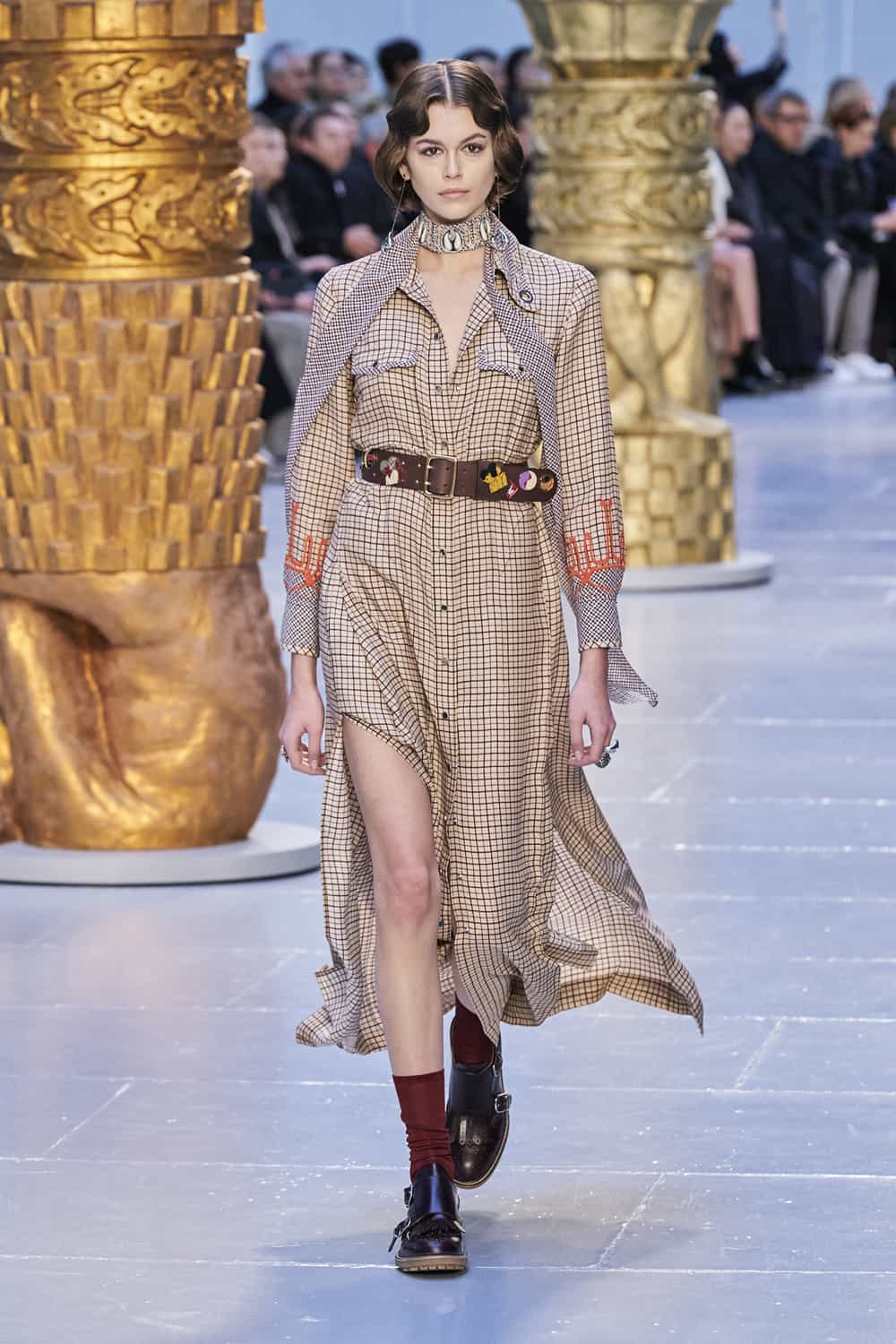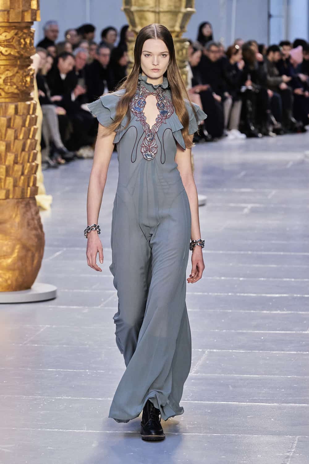 The Grand Palais was decorated by French sculptor Marion Verboom, with golden columns as the background for Chloés show. The soundtrack included Marianne Faithful, who recited poems while sitting first row next to celebrities like Lucy Boyton, Katie Holmes, and Ellie Goulding. As for the collection, we saw items like classic shirtwaist dresses in silk with leather belts, evening dresses with mountain boots, and wide pants combined with delicate shirts with lace collars. Some of the pieces were created by Hungarian artist Rita Ackermann with images of the female body, which added value to the line.