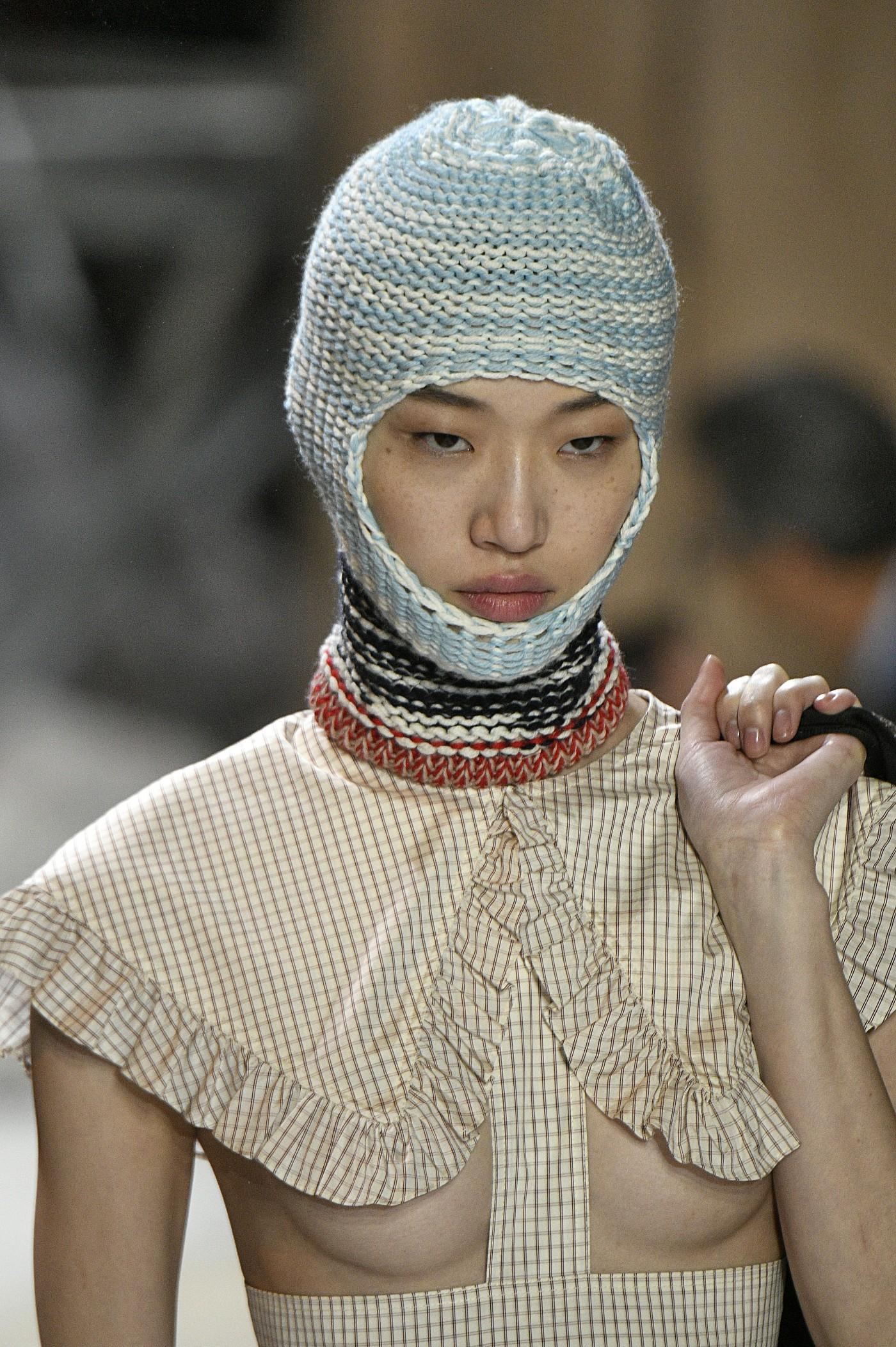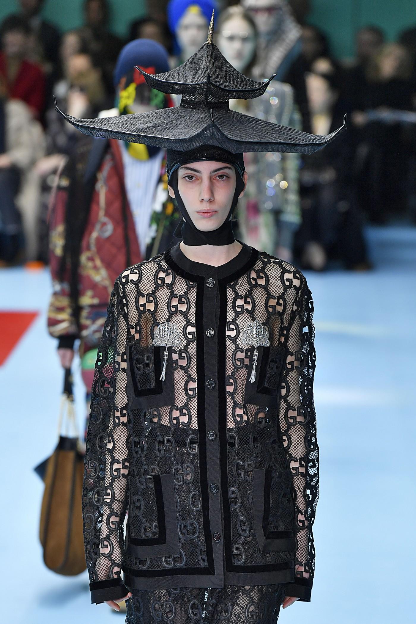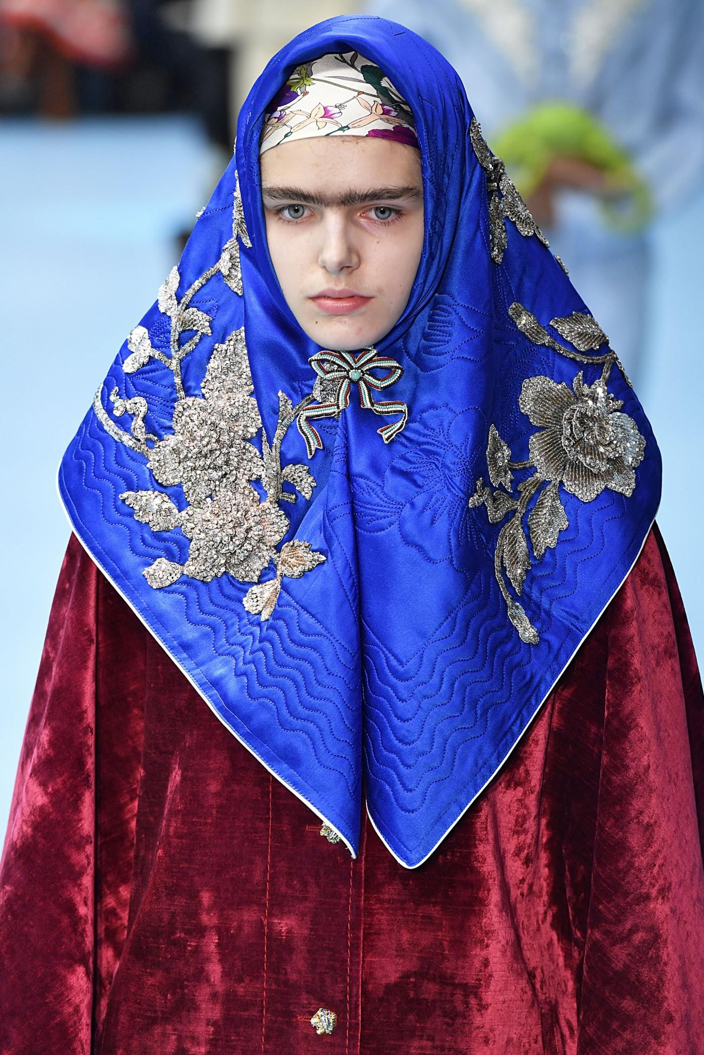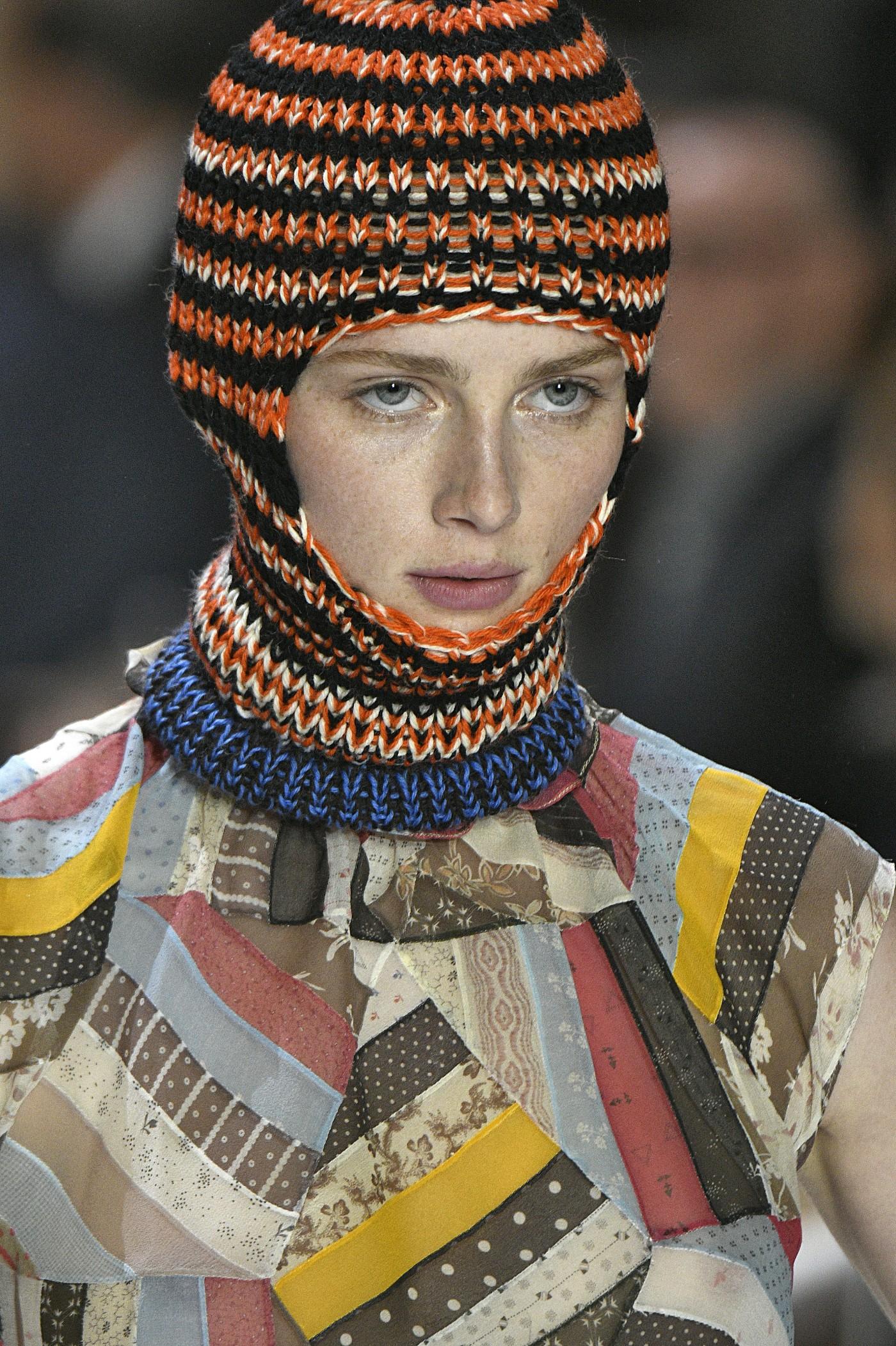 Next, it was Gucci’s turn to ride the no-hair train. And boy, did designer Alessandro Michele have fun with that! This time the balaclavas came adorned with everything from pompoms to pagodas.
