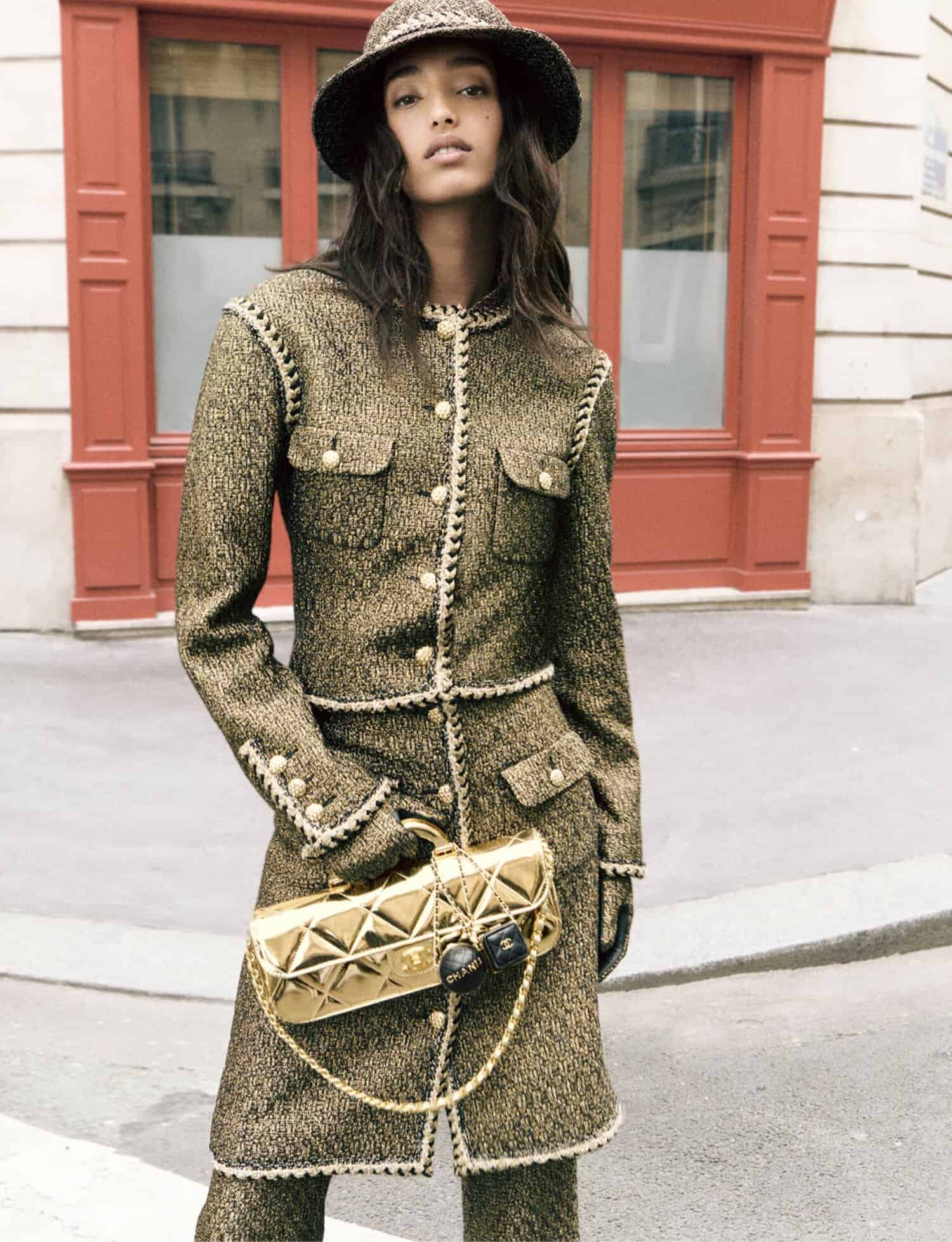 Chanel‘s taking a journey across Paris for its Fall 2025 ready-to-wear campaign! Star model Mona Tougaard steps out across the city’s cobblestoned streets and alleyways for the new shoot, photographed by Mikael Jansson. The new images find Tougaard outfitted in Chanel’s latest array of jackets, skirts, and dresses, and sharp blouses, paired with versatile boots, quilted leather top-handle and slouchy totes—all hallmarks of the brand—in a palette of black, gold, and white. Swinging pearl jewelry, plus the label’s viral minaudière shaped like a string of pearls, complete the lineup with an elegant flourish—as well as a signature nod to founder Coco Chanel.