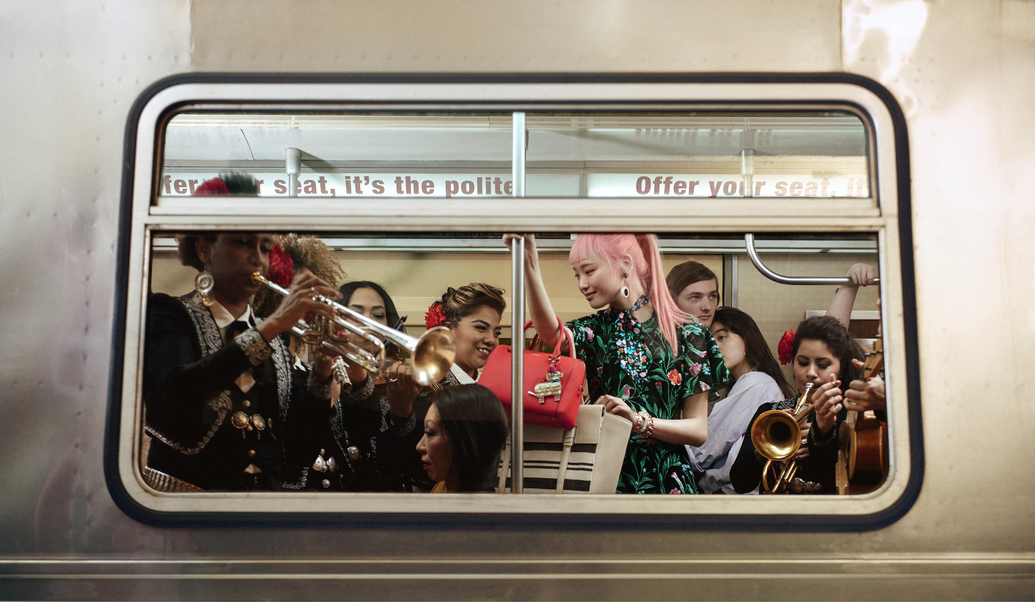 Model and architecture aficionado Fernanda Ly returns as the star of Kate Spade New York’s new campaign, for Summer 2017, which gives a nod to the artful flair of Mexico City. The brand brings south of the border vibes to the Big Apple as the beauty poses in a crowded New York City subway car surrounded by an all-female Mariachi band (called Flor de Toloache). The collection was inspired by traditional Mexican wedding dresses, carnations, hummingbirds, piñatas, and more. Romy Solemani did the makeup for the campaign, while Bob Recine for Rodin was on hair and Yuko Tsuchihashi was on nails.