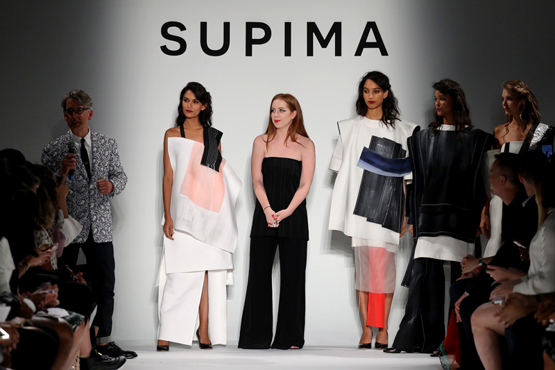 - NEW YORK, NY – SEPTEMBER 07: (L-R) Winner Alyssa Wardrop, FIT and June Ambrose attend Supima Design Competition SS18 runway show during New York Fashion Week at Pier 59 on September 7, 2017 in New York City. (Photo by JP Yim/Getty Images for Supima Design Competition)