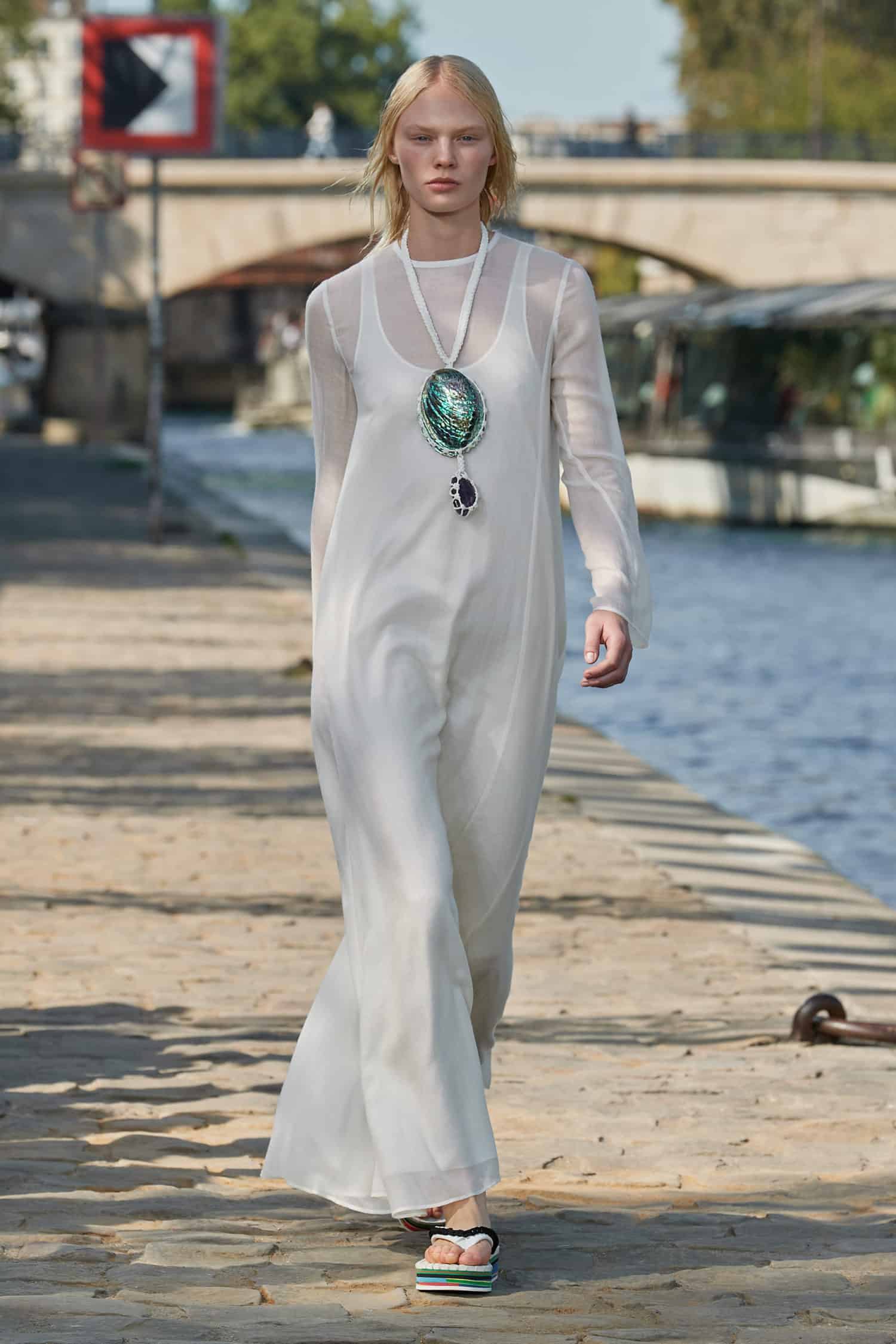 For the latest Dior spectacle, Maria Grazia Chiuri paid homage to one of her predecessors, former creative director Marc Bohan, and his influence on the swinging style of the 1960s. Dior collections are known for comprising as many as 90 outfits, so what felt fresh and novel was how the maison presented the 88-look Spring Summer ’22 offering. Today’s show space took a leaf from the pages of legendary Roman nightclub, the Piper Room, with a vividly colorful dance floor and live music that spoke to the overarching theme of the free love era. Models filled the stage all at once and took it in turns to take their walk towards the audience and photo pit in pieces that harked back to Bohan’s ‘Slim Look’ collection, rendered in Piet Mondrian hues of green, yellow, red, and cobalt. As for what caught our eye? The disco ball flats with lace-up ties around the calf, fringing on a top that was actually made of intricate beaded daisy chains, and silk coord sets that looked like what you’d get if you teamed a bowling team’s shirt or bomber jacket with a heavyweight champion’s boxing shorts. Further rounding out the nostalgia-tinged collection were sixties staples like tank top minis, Peter Pan collar coats teamed with matching dresses underneath, quilted macs, short shorts, and lots of Mary Janes. Ensuring the first day of PFW didn’t begin without the glamour we’re accustomed to, the closing gowns and chandelier-fringed mini dresses upped the ante and wrapped up the collection nicely. Some, even with literal bows on them.